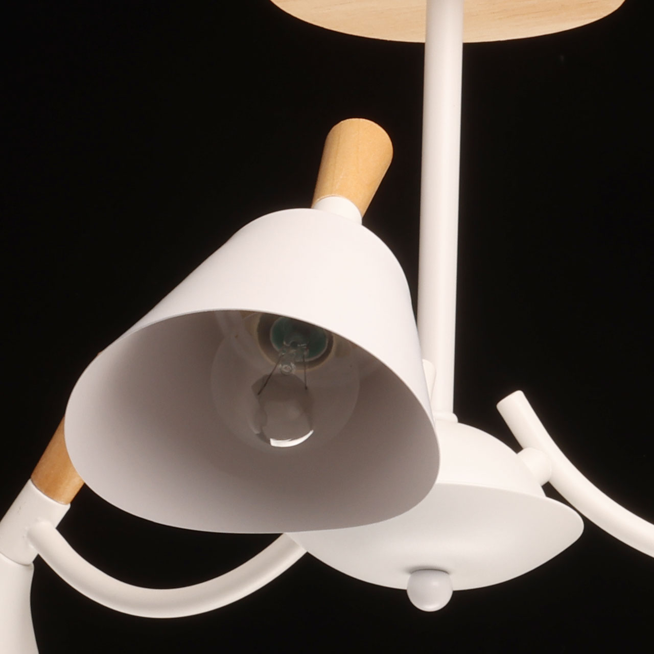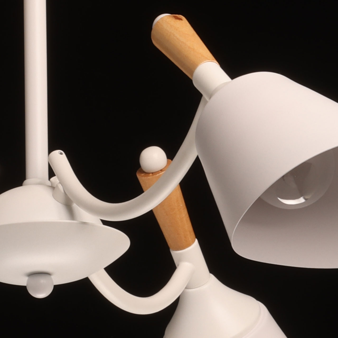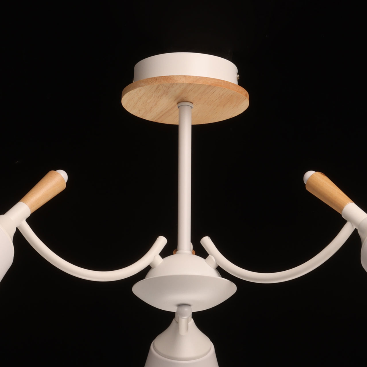 Металлическое основание потолочной люстры окрашено в белый цвет. Металлические плафоны с окрашены в белый цвет. Потолочная люстра декорирована элементами из светлого натурального дерева.