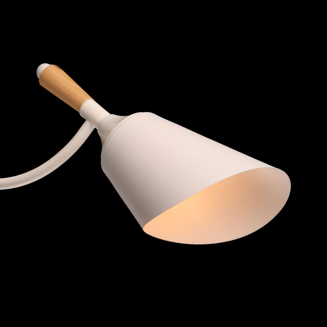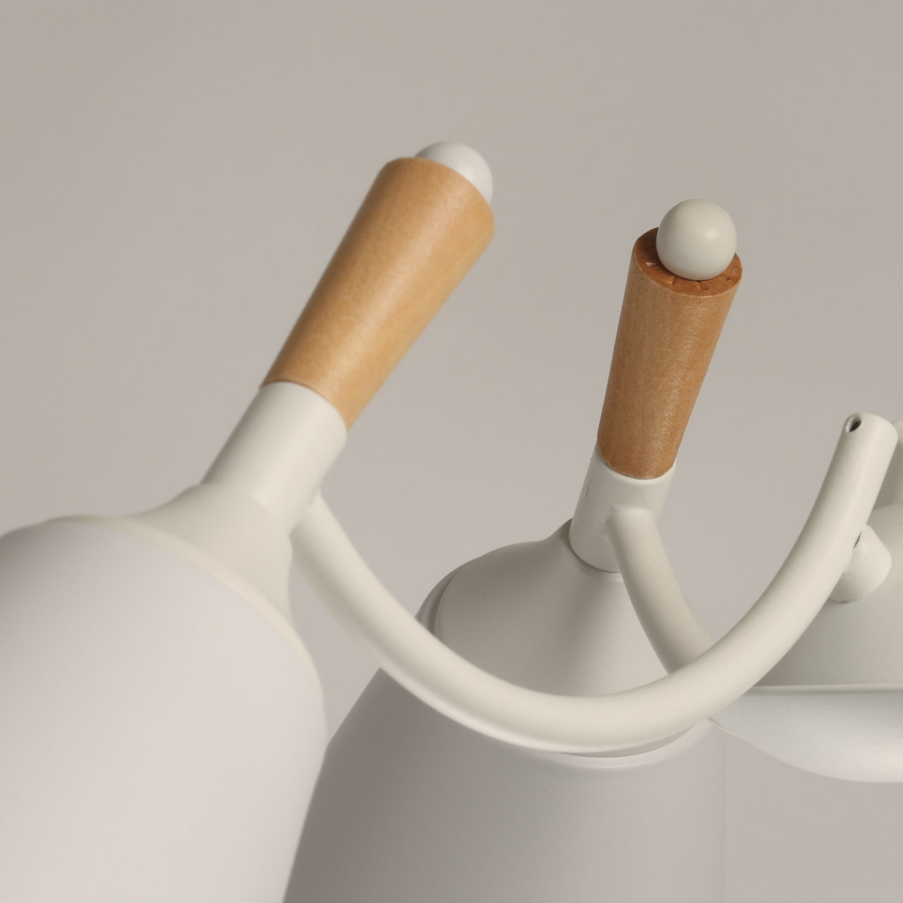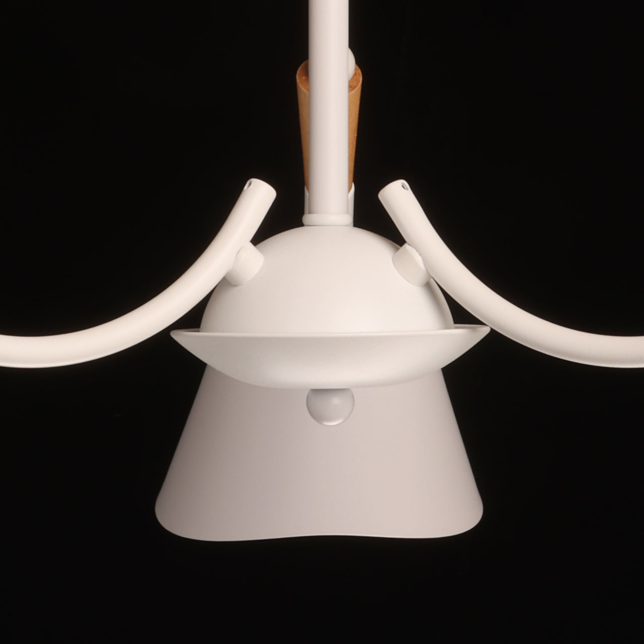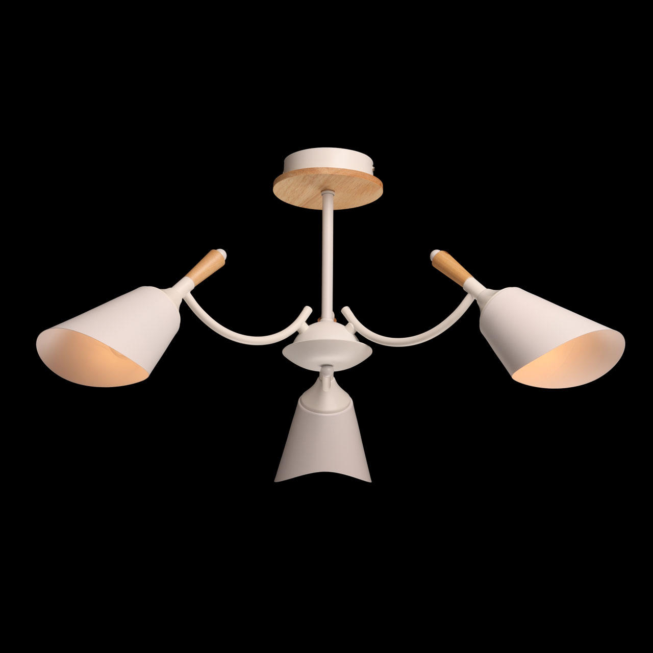 Металлическое основание потолочной люстры окрашено в белый цвет. Металлические плафоны с окрашены в белый цвет. Потолочная люстра декорирована элементами из светлого натурального дерева.