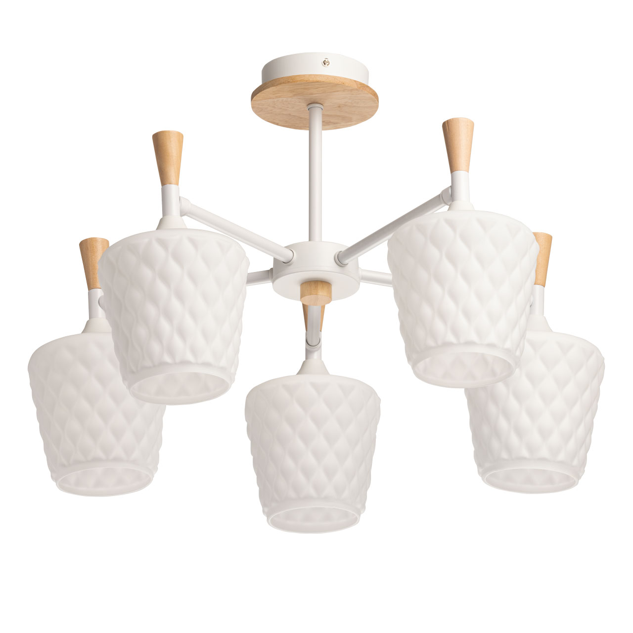 Металлическое основание потолочной люстры окрашено в белый цвет. Фактурные стеклянные плафоны окрашены в белый цвет. Потолочная люстра декорирована элементами из светлого натурального дерева.