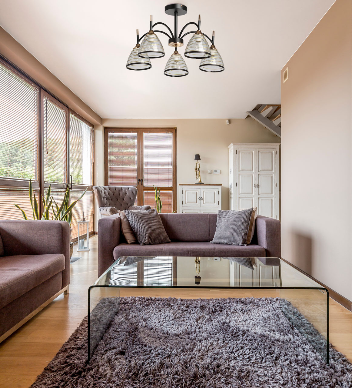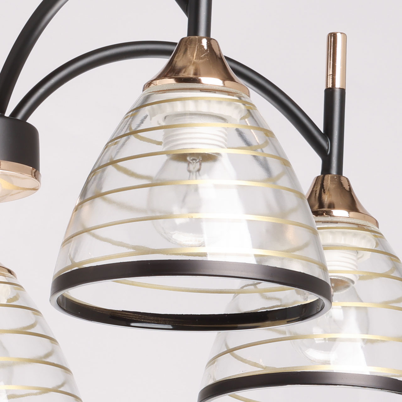 Металлическое основание потолочной люстры окрашено в черный цвет. Отдельные элементы основания гальванизированы в цвет золота. На прозрачные стеклянные плафоны нанесены тонкие полоски цвета золота. Нижний край плафонов отделан кантом черного цвета.