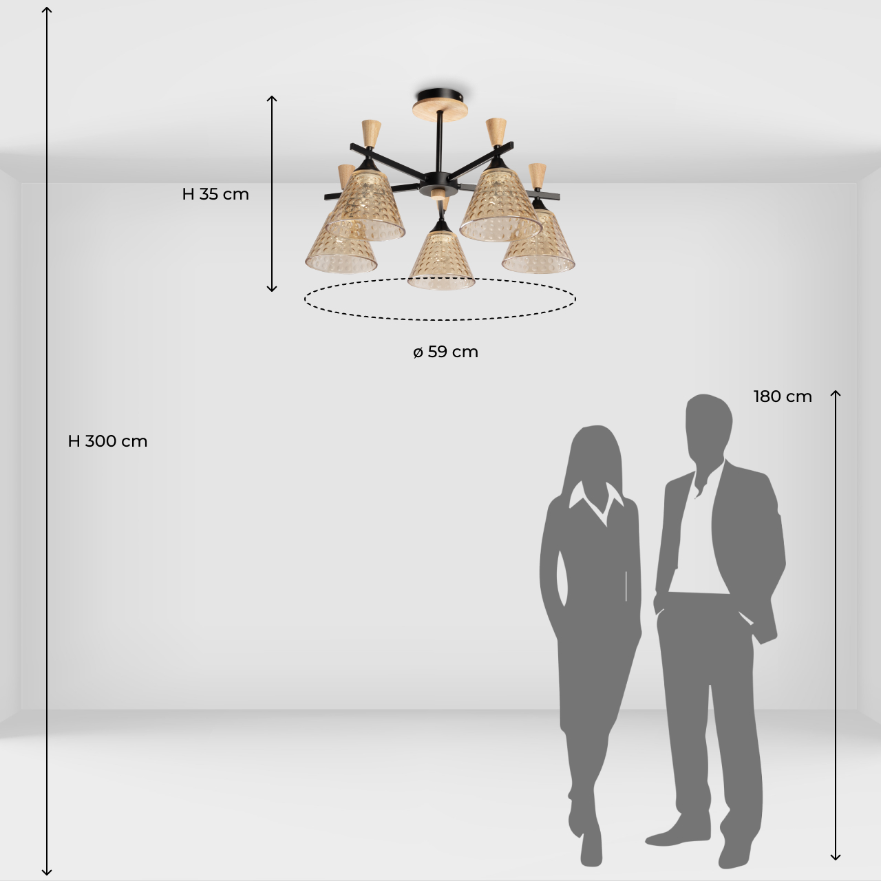 Металлическое основание потолочной люстры окрашено в черный цвет. Стеклянные плафоны отлиты в сложную форму и гальванизированы в цвет шампань. Светильник декорирован элементами из натурального светлого дерева.