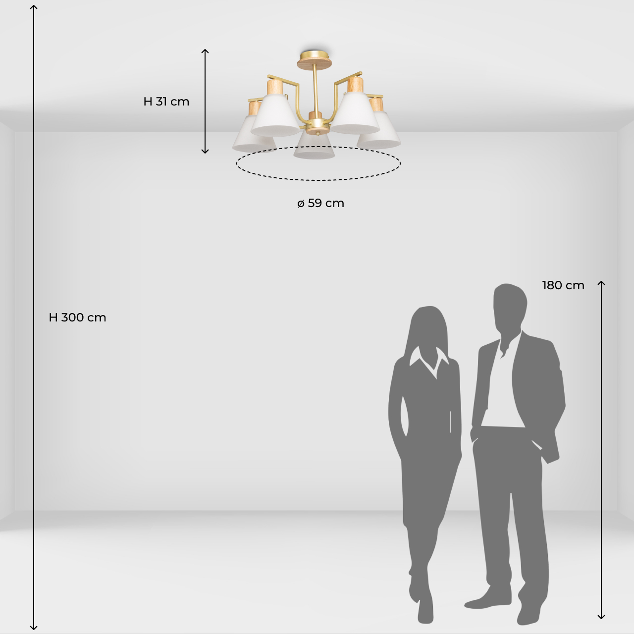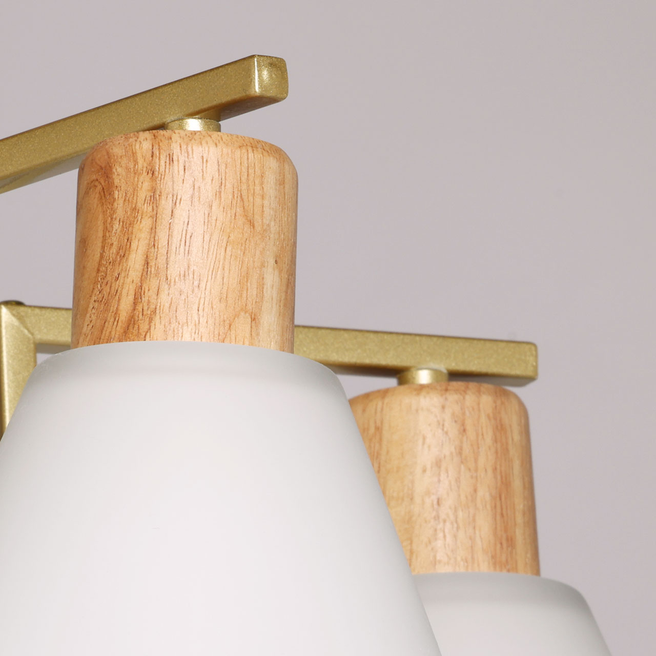 Металлическое основание потолочной люстры окрашено в цвет матового перламутрового золота. Стеклянные плафоны отлиты в сложную форму и матированы. Потолочная люстра декорирована элементами из светлого натурального дерева.