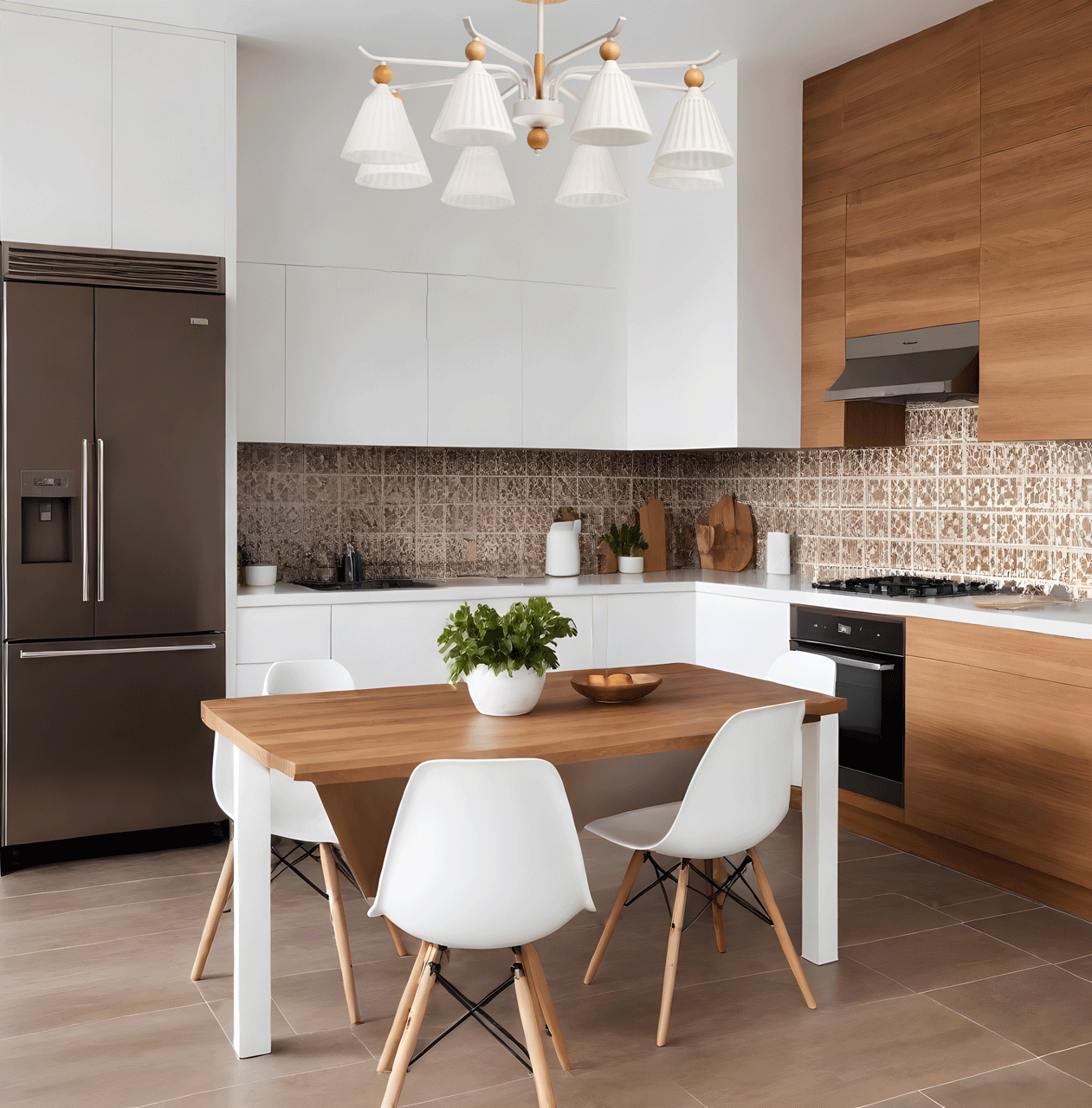Металлическое основание потолочной люстры окрашено в белый цвет. Стеклянные плафоны окрашены в белый цвет. Люстра декорирована элементами из светлого натурального дерева.