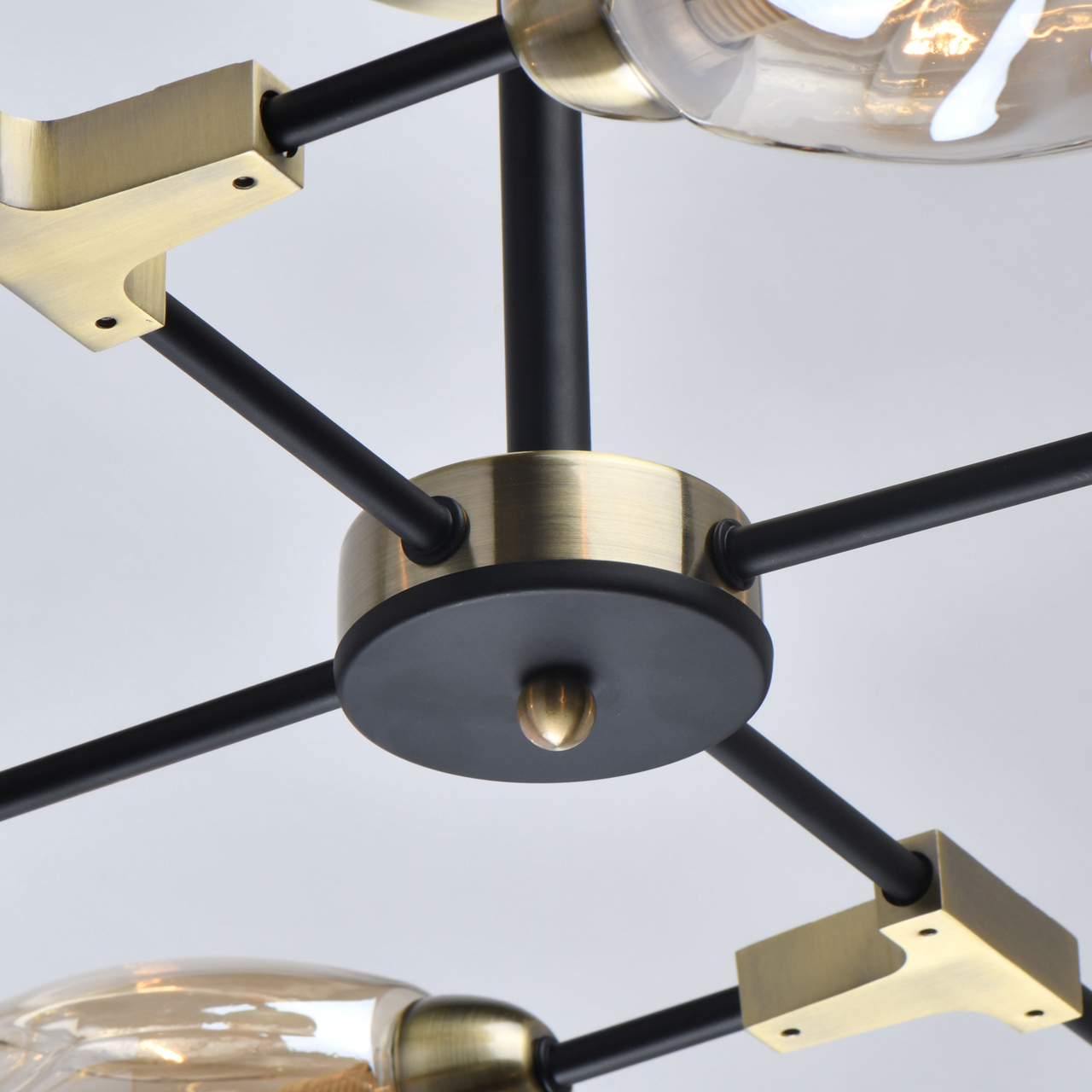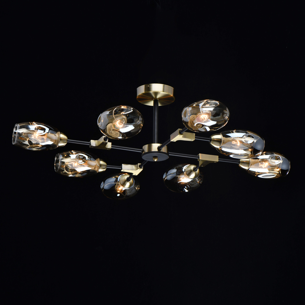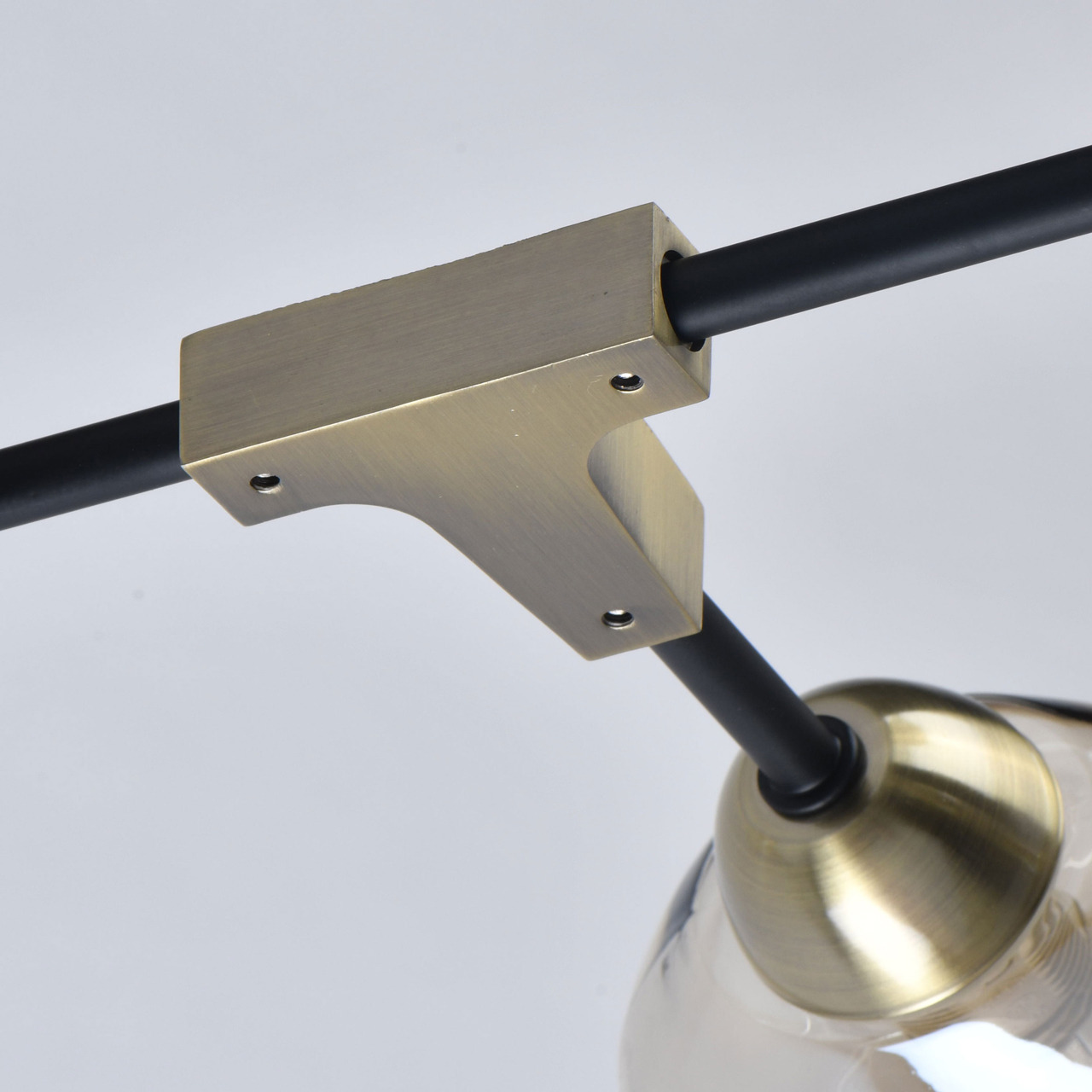 Основание светильника выполнено из металла и окрашено в черный цвет. Отдельные элементы основания гальванизированы в цвет латуни. Стеклянные плафоны отлиты в сложную форму и гальванизированы.