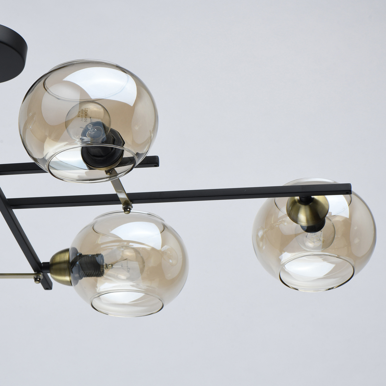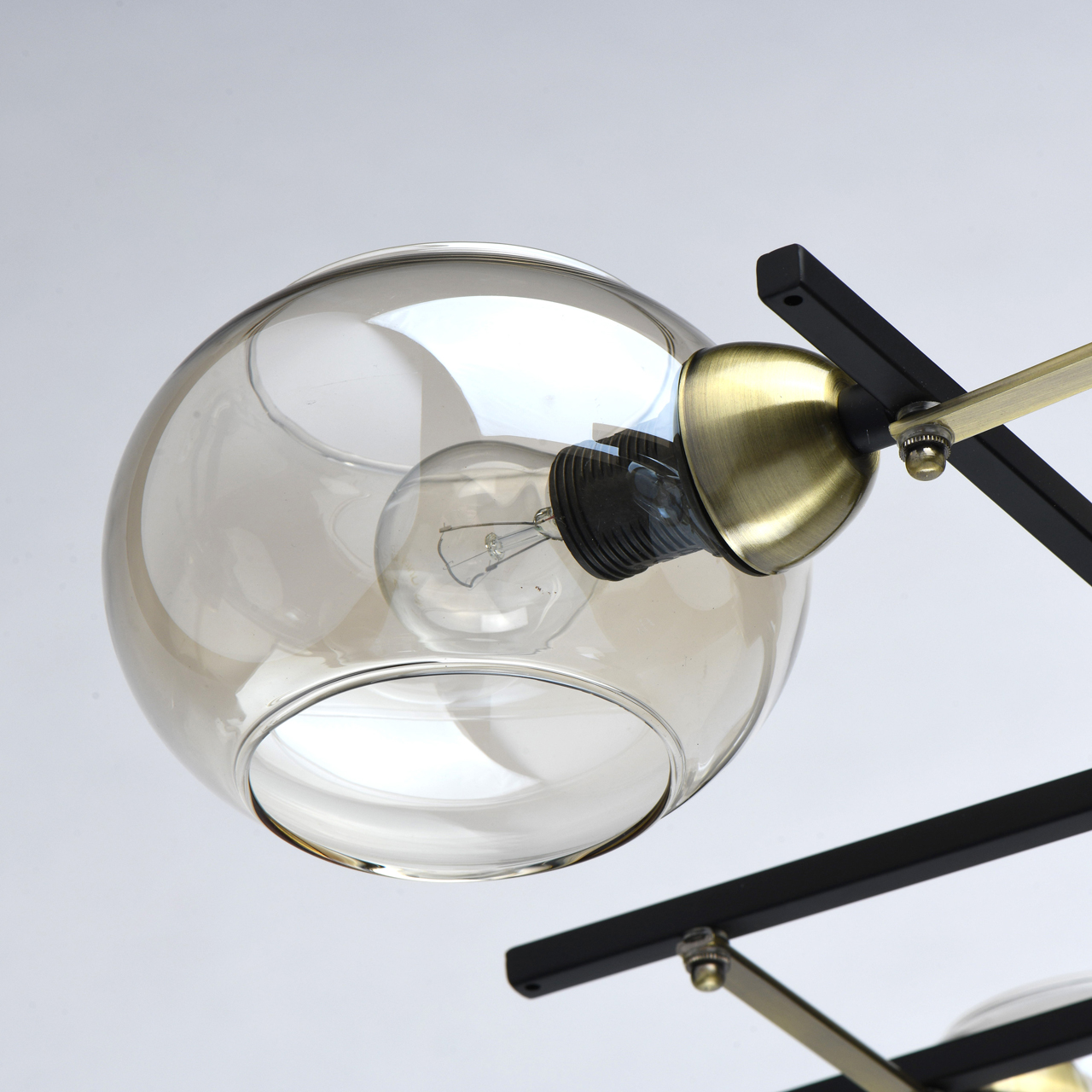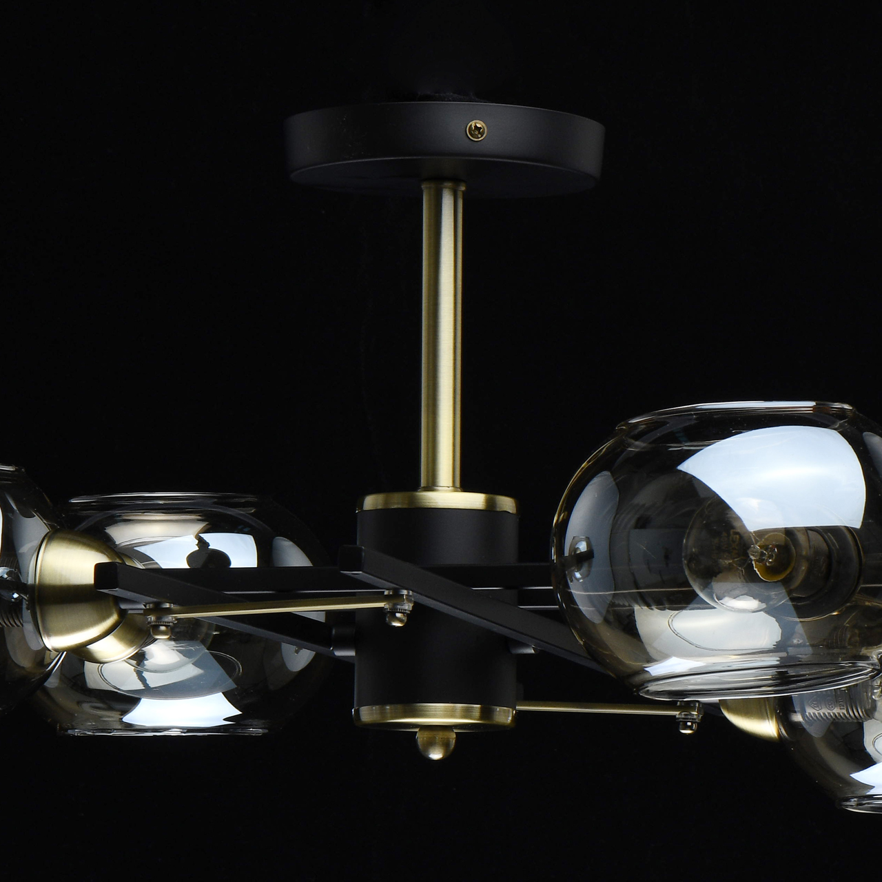 Основание светильника выполнено из металла и окрашено в черный цвет. Отдельные элементы основания гальванизированы в цвет латуни. Светильник декорирован стеклянными плафонами оригинальной формы, гальванизированными в цвет шампань.
