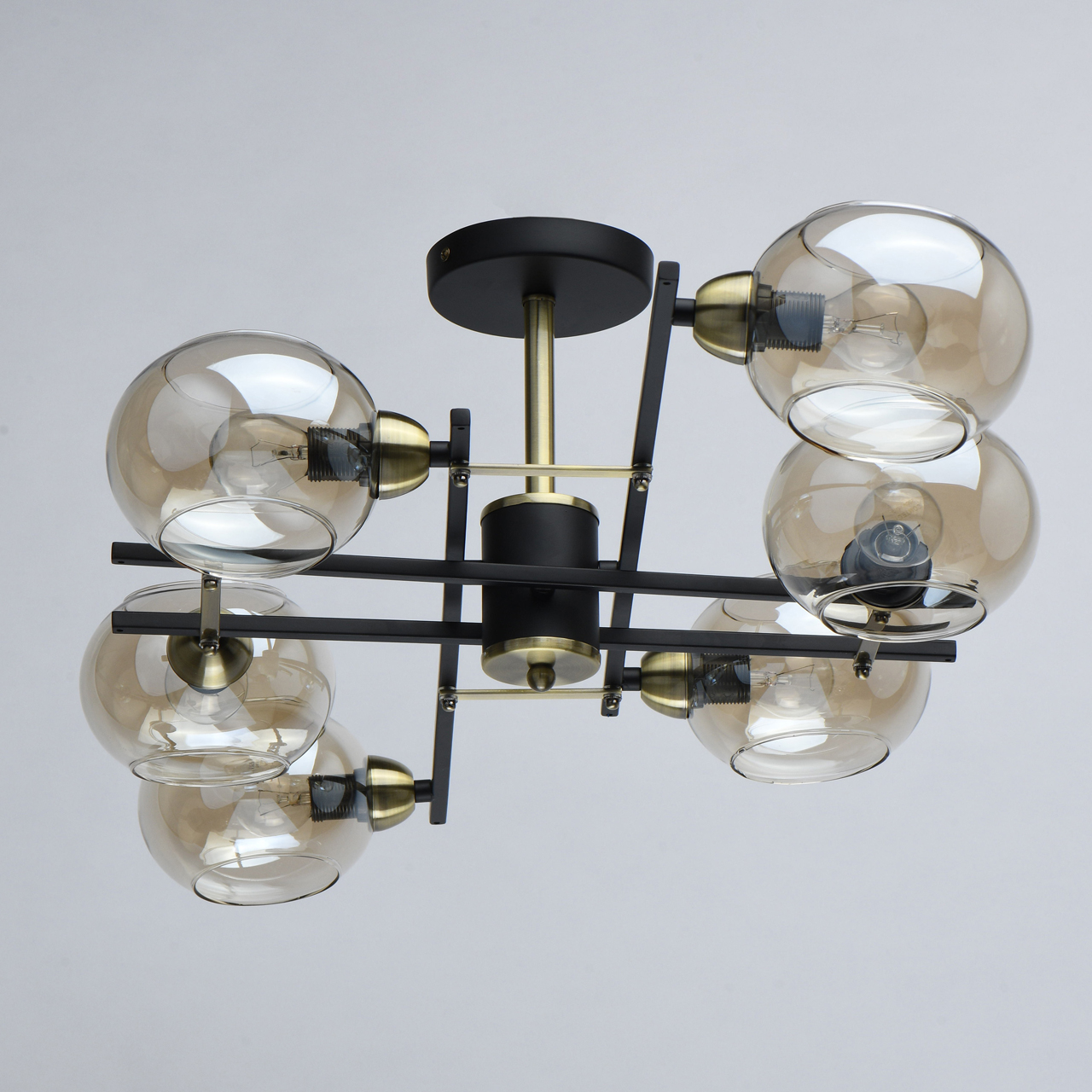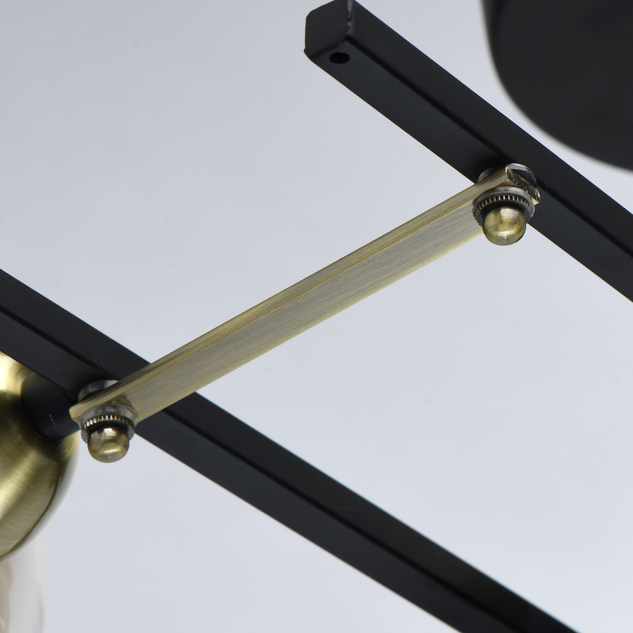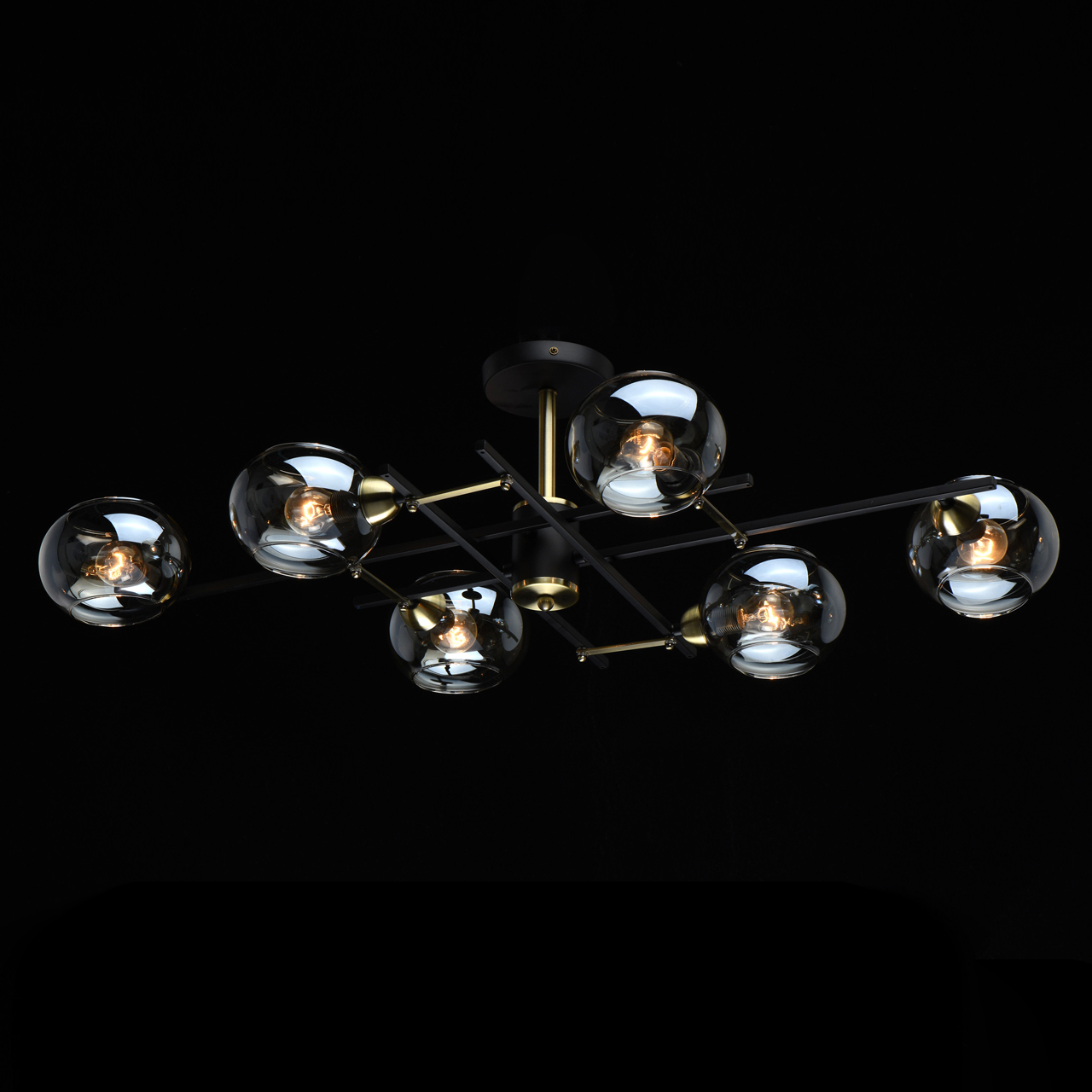 Основание светильника выполнено из металла и окрашено в черный цвет. Отдельные элементы основания гальванизированы в цвет латуни. Светильник декорирован стеклянными плафонами оригинальной формы, гальванизированными в цвет шампань.