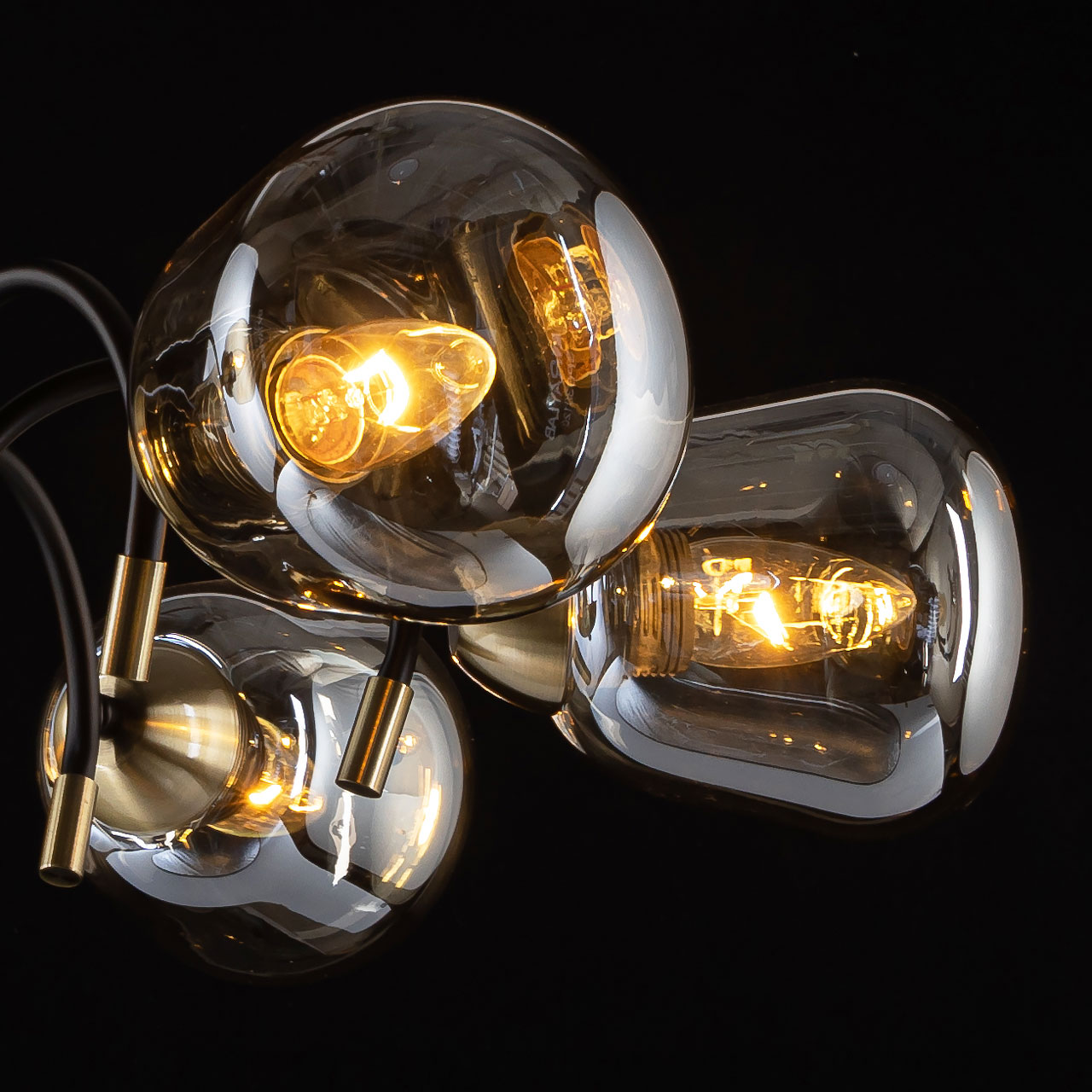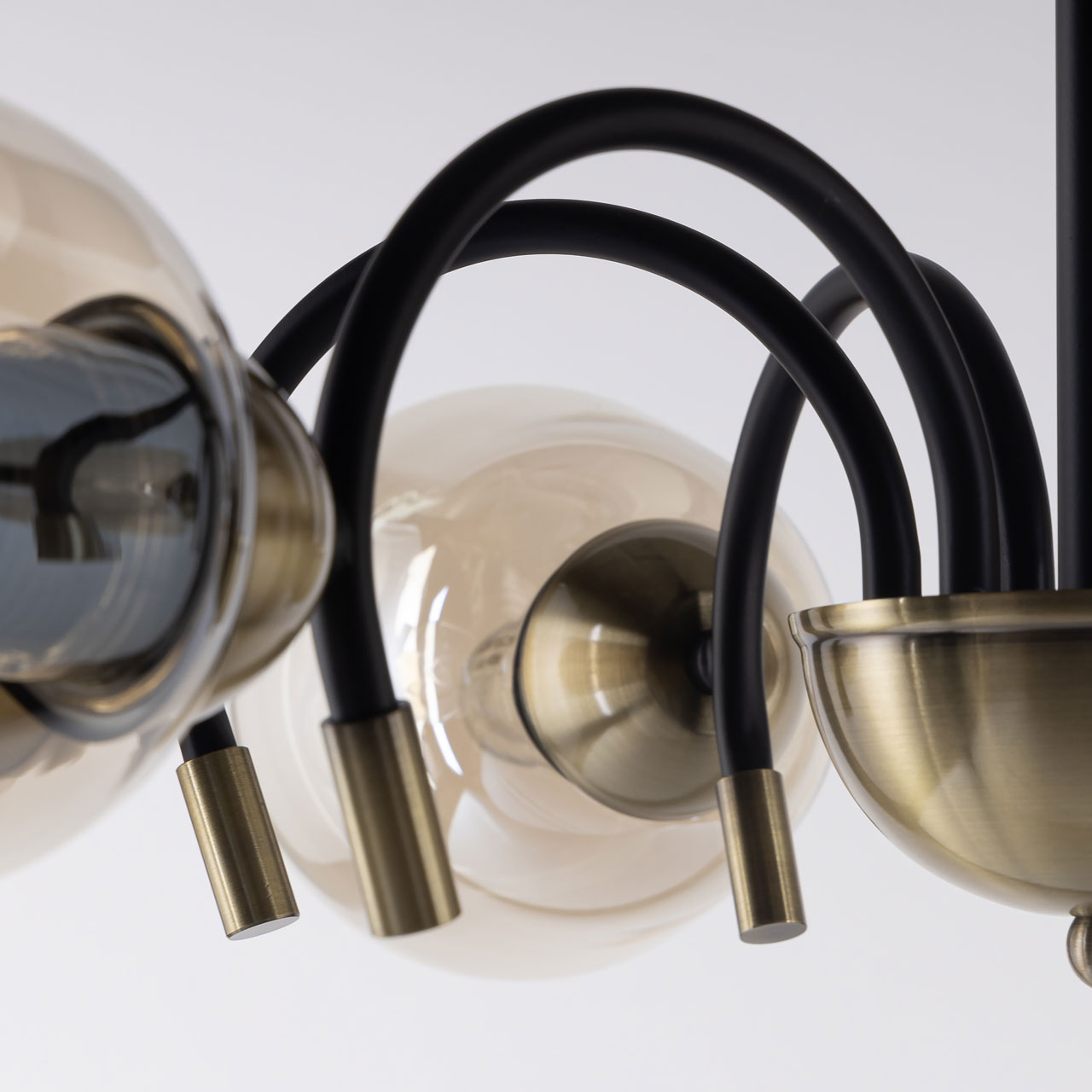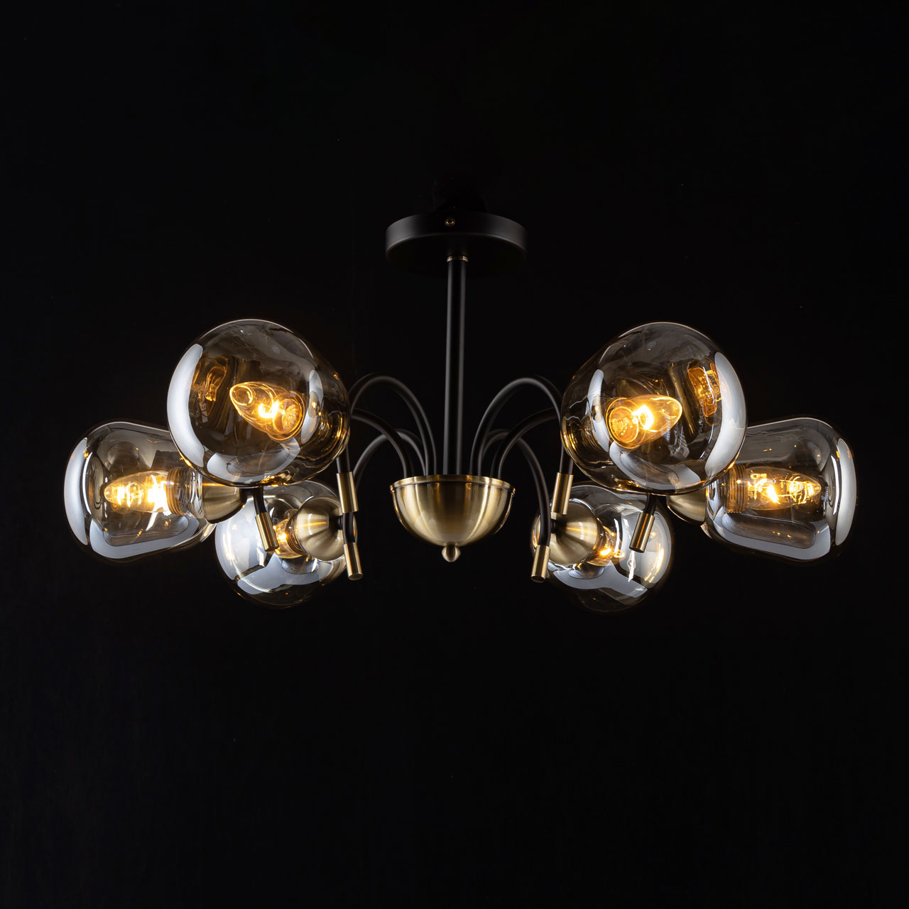 Металлическое основание подвесной люстры окрашено в черный цвет. Отдельные элементы основания гальванизированы в цвет античной бронзы. Светильник декорирован стеклянными вытянутыми плафонами цвета шампань.