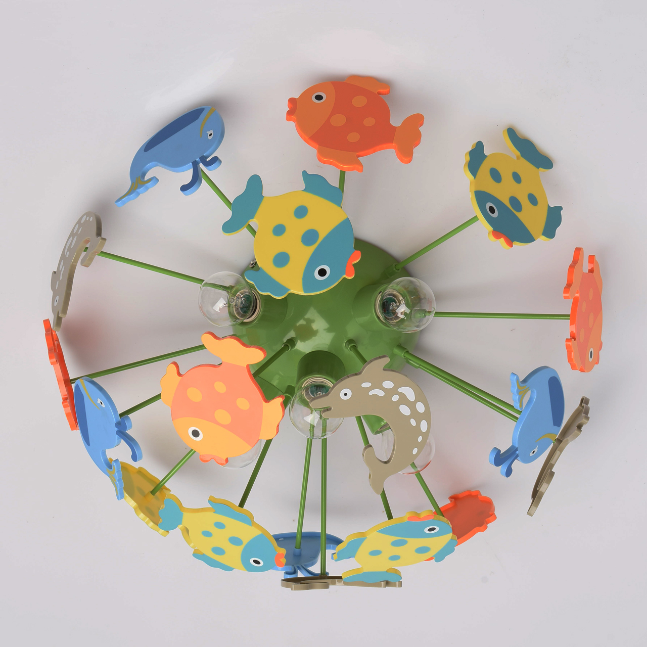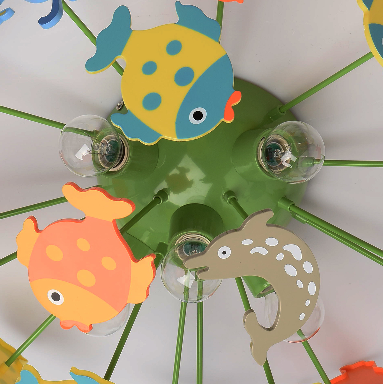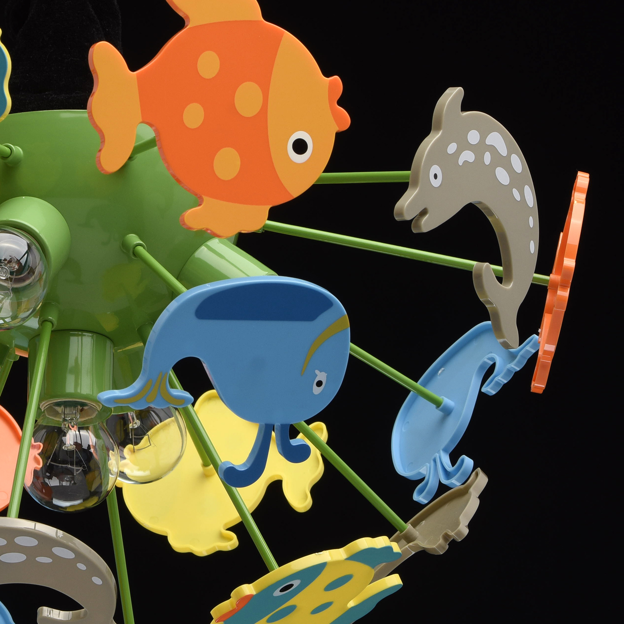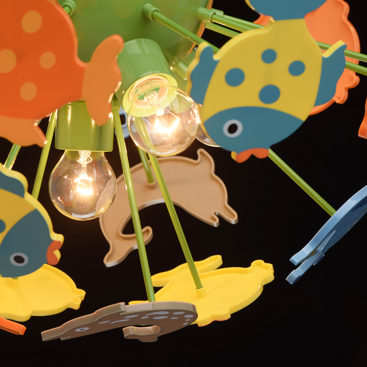 Основание светильника выполнено из сплава металла и окрашено в зеленый цвет. Светильник декорирован фигурками рыбок из высококачественного акрила, окрашенными в разные цвета.