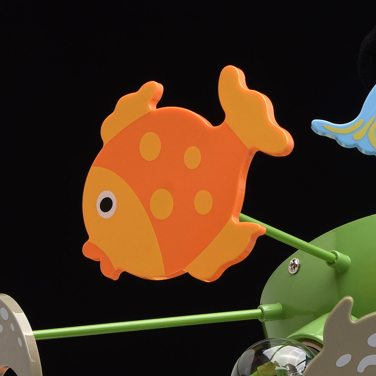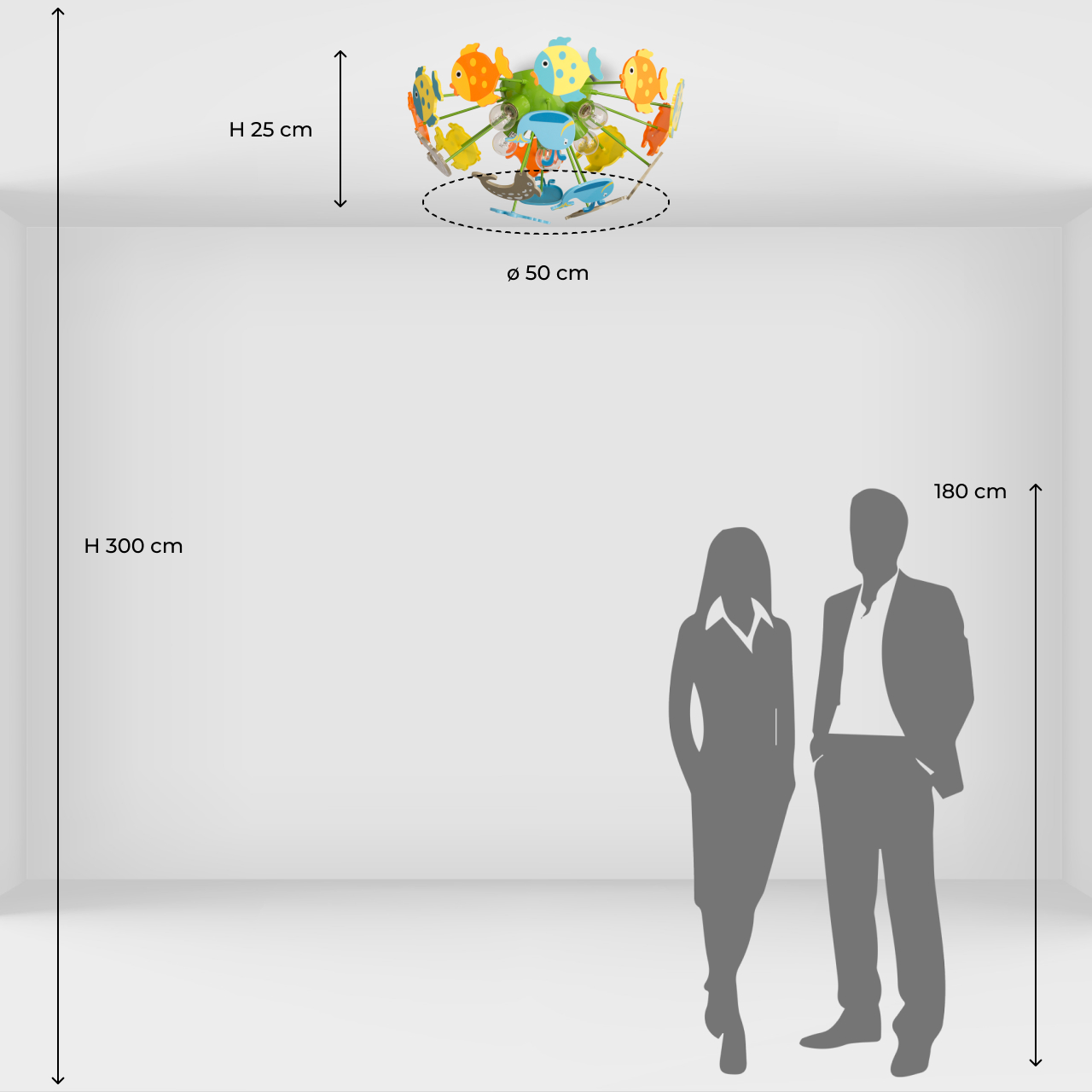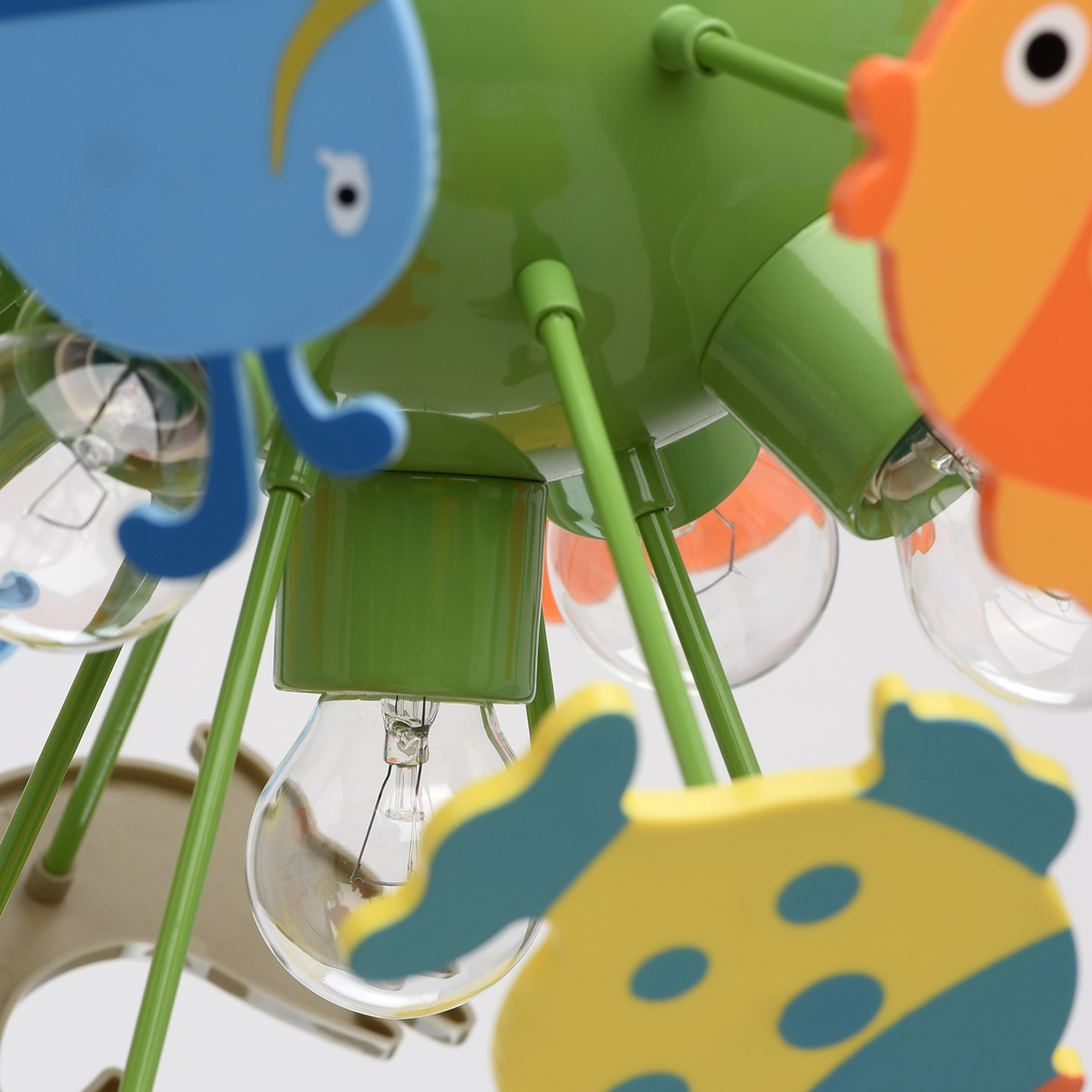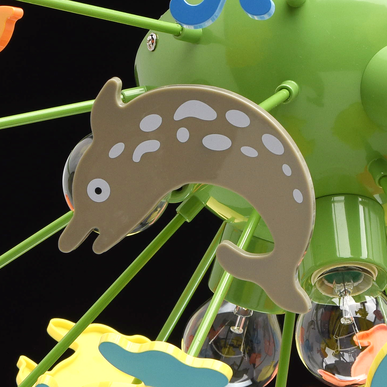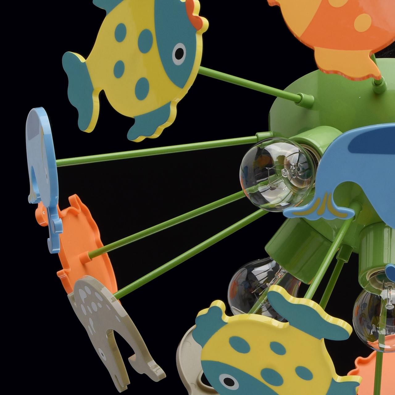 Основание светильника выполнено из сплава металла и окрашено в зеленый цвет. Светильник декорирован фигурками рыбок из высококачественного акрила, окрашенными в разные цвета.