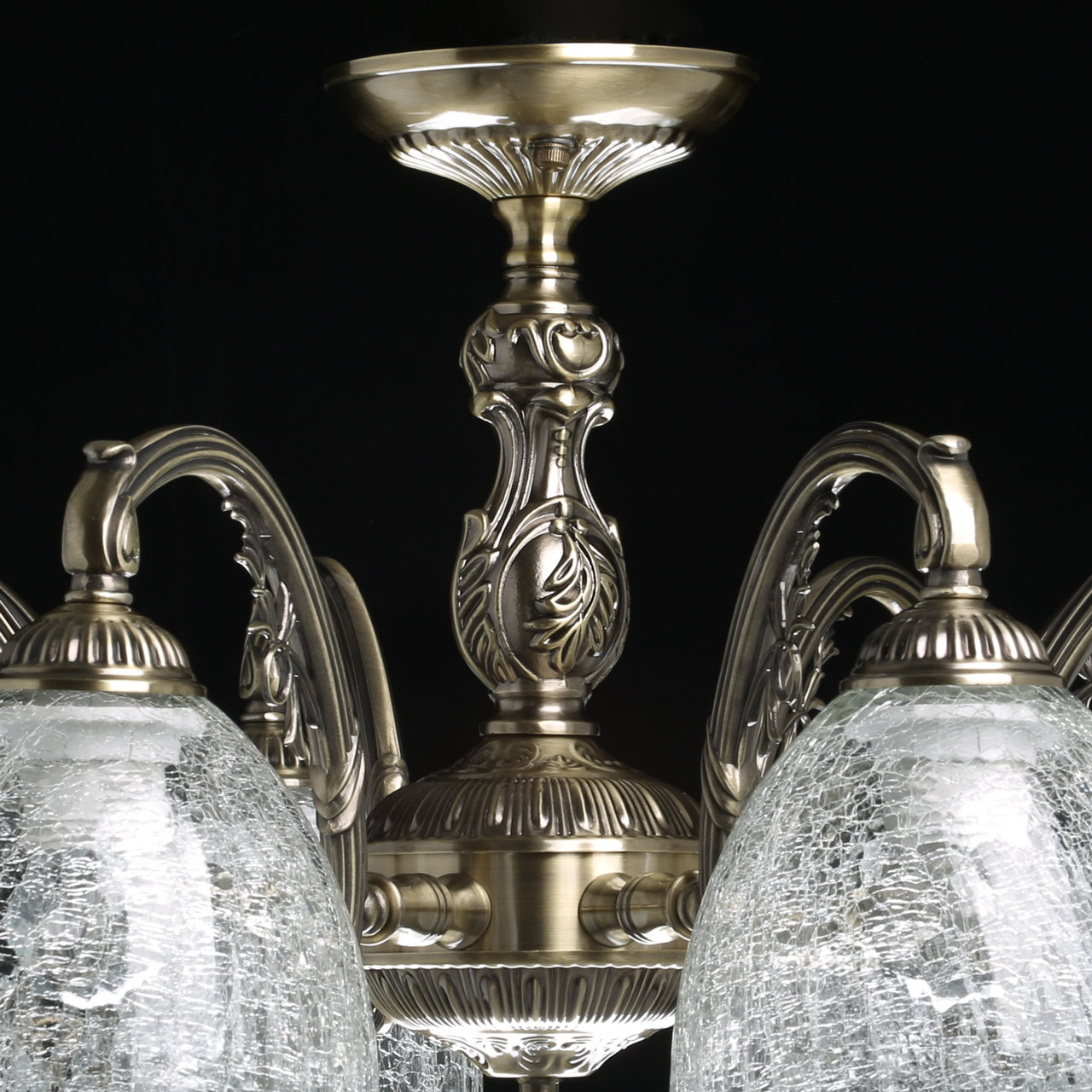 Основание светильника выполнено из комбинации сплавов металлов и гальванизировано в цвет античной бронзы. Корпус и потолочная чаша выполнены из металла по технологии прессования. Рожки и центральная ось выполнены из сплава алюминием с цинком по технологии художественного литья. Потолочная люстра декорирована прозрачными стеклянными плафонами вниз, выполненными по технологии кракелирования.