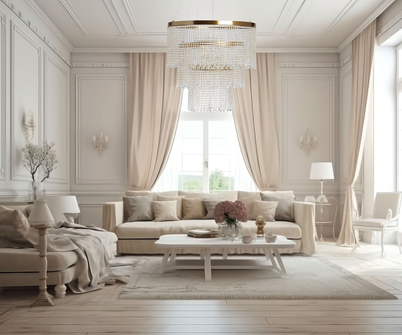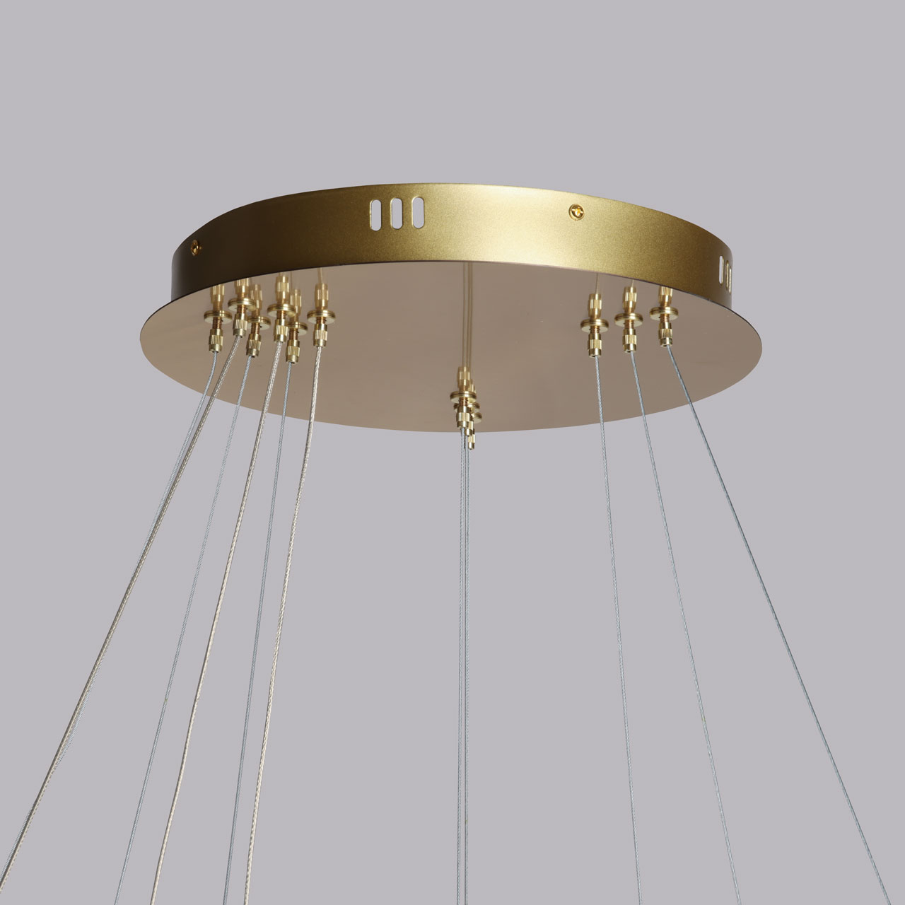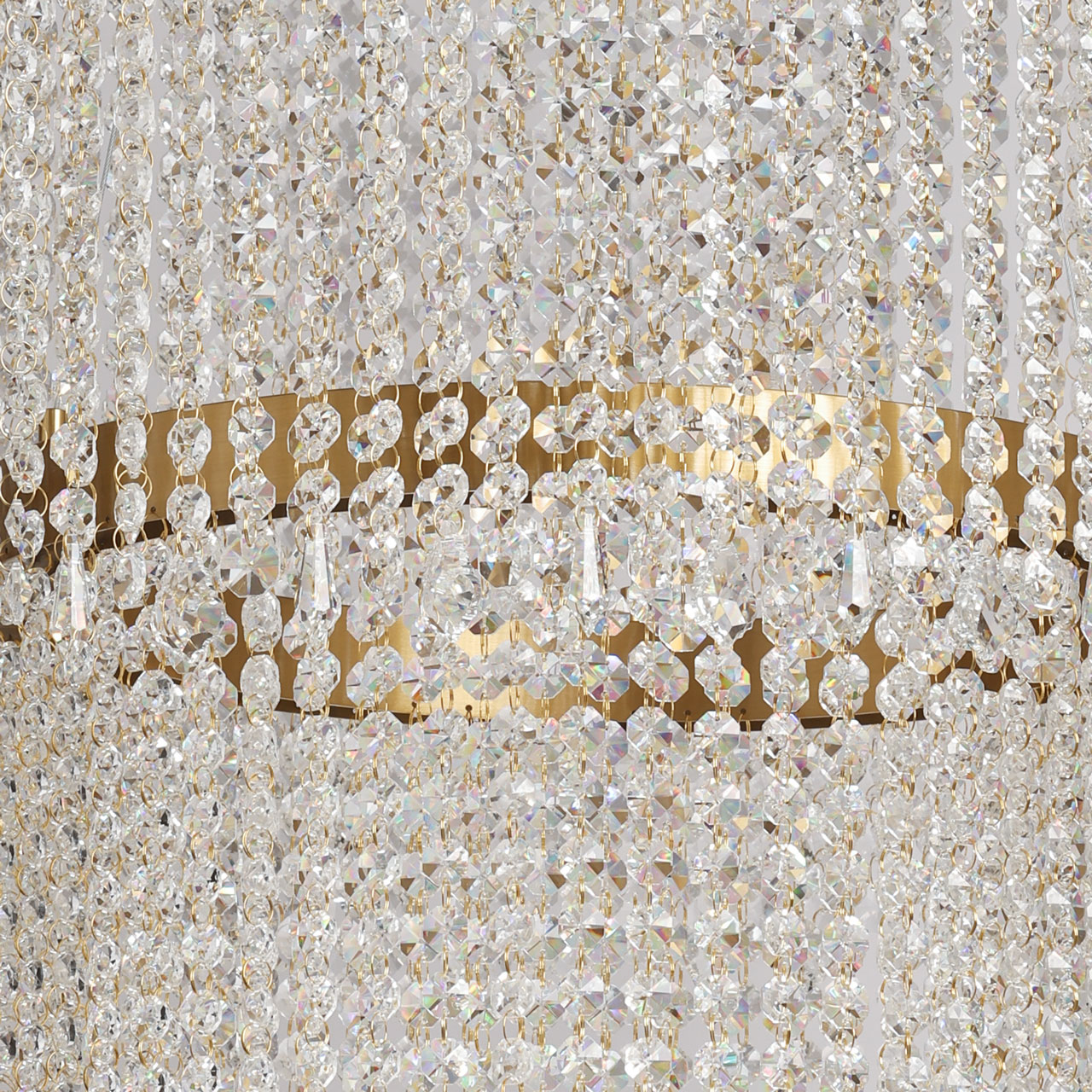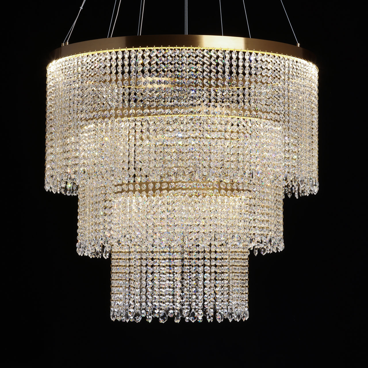 Основание люстры из нержавеющей стали гальванизировано в цвет золота. Люстра декорирована каскадом подвесок из прозрачного хрусталя.