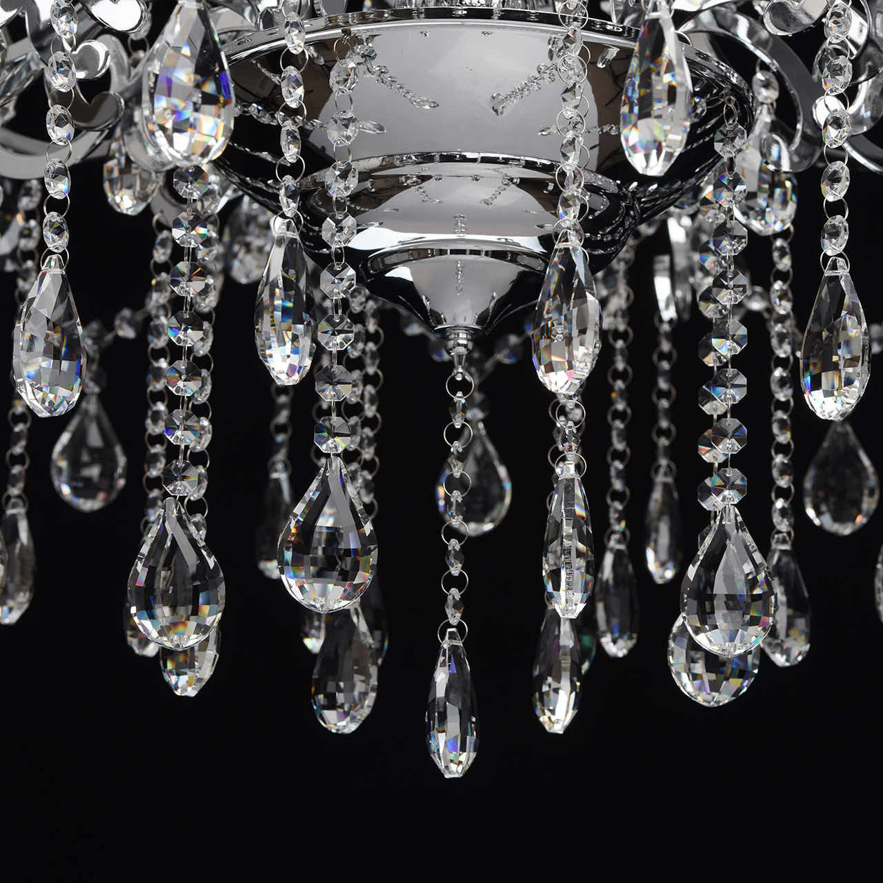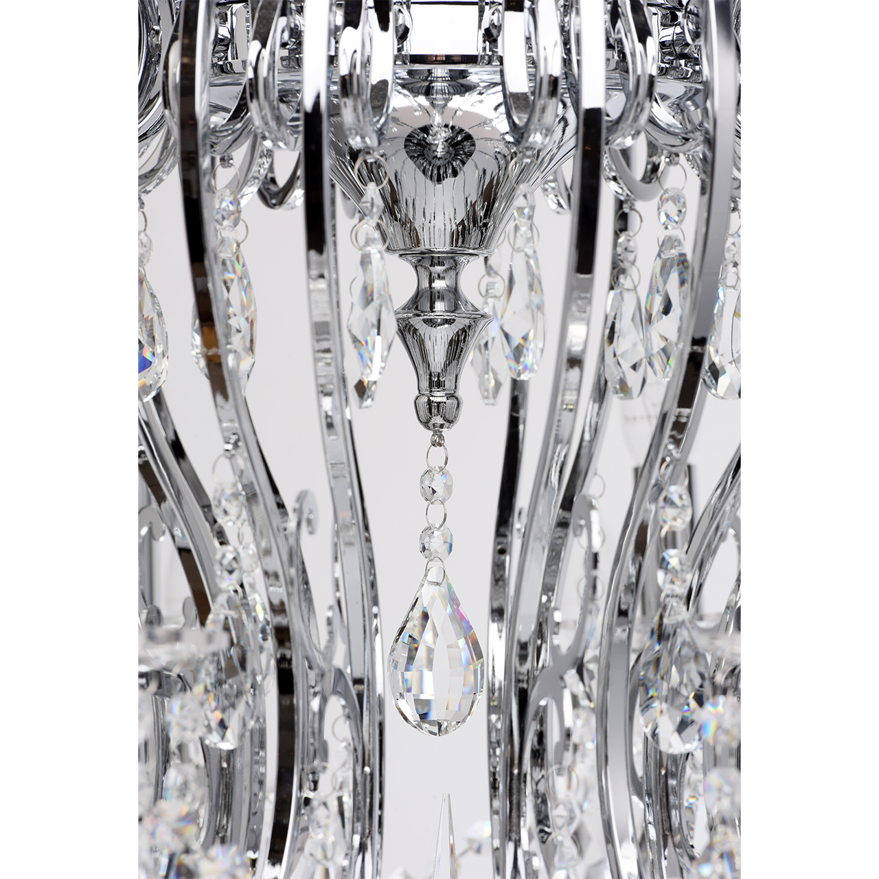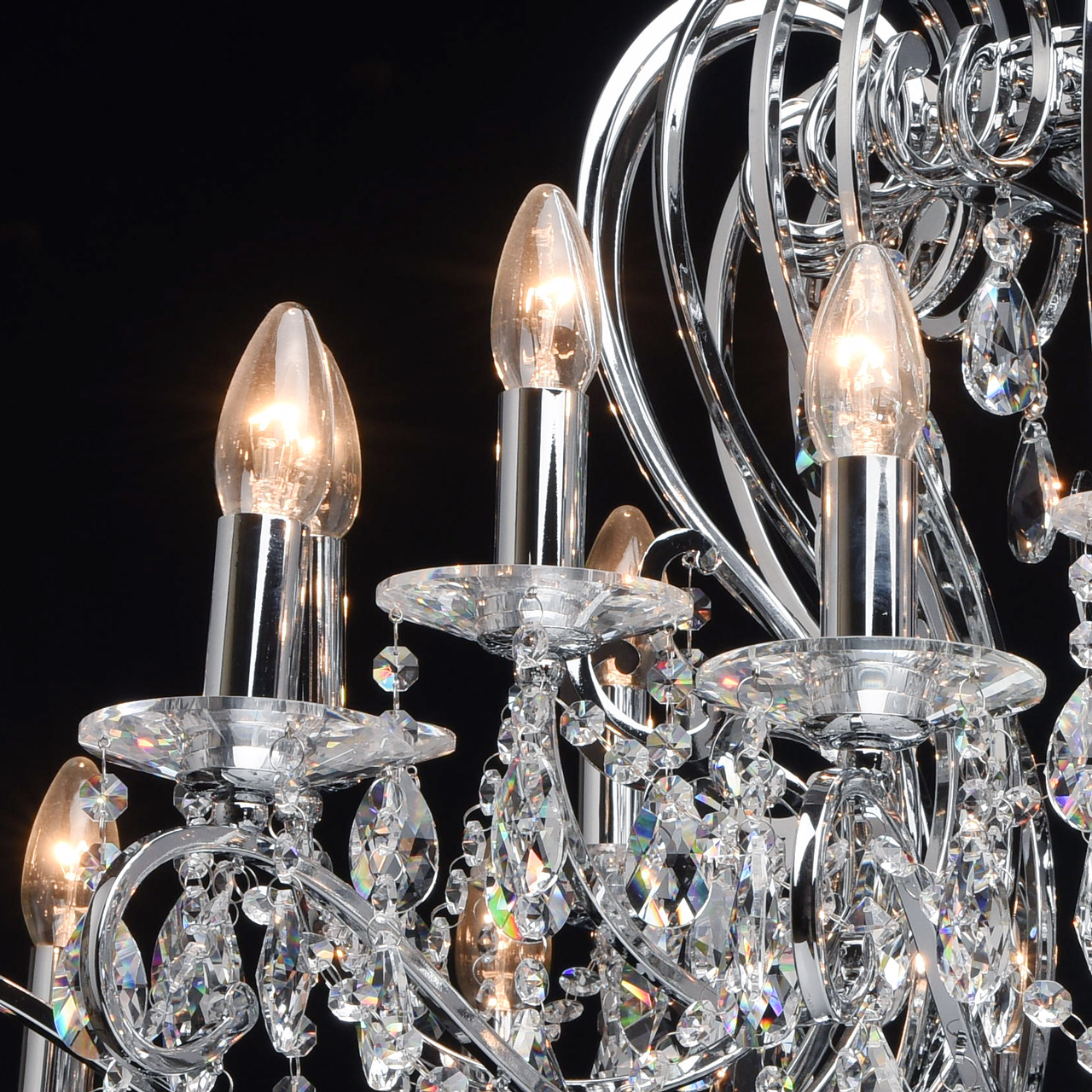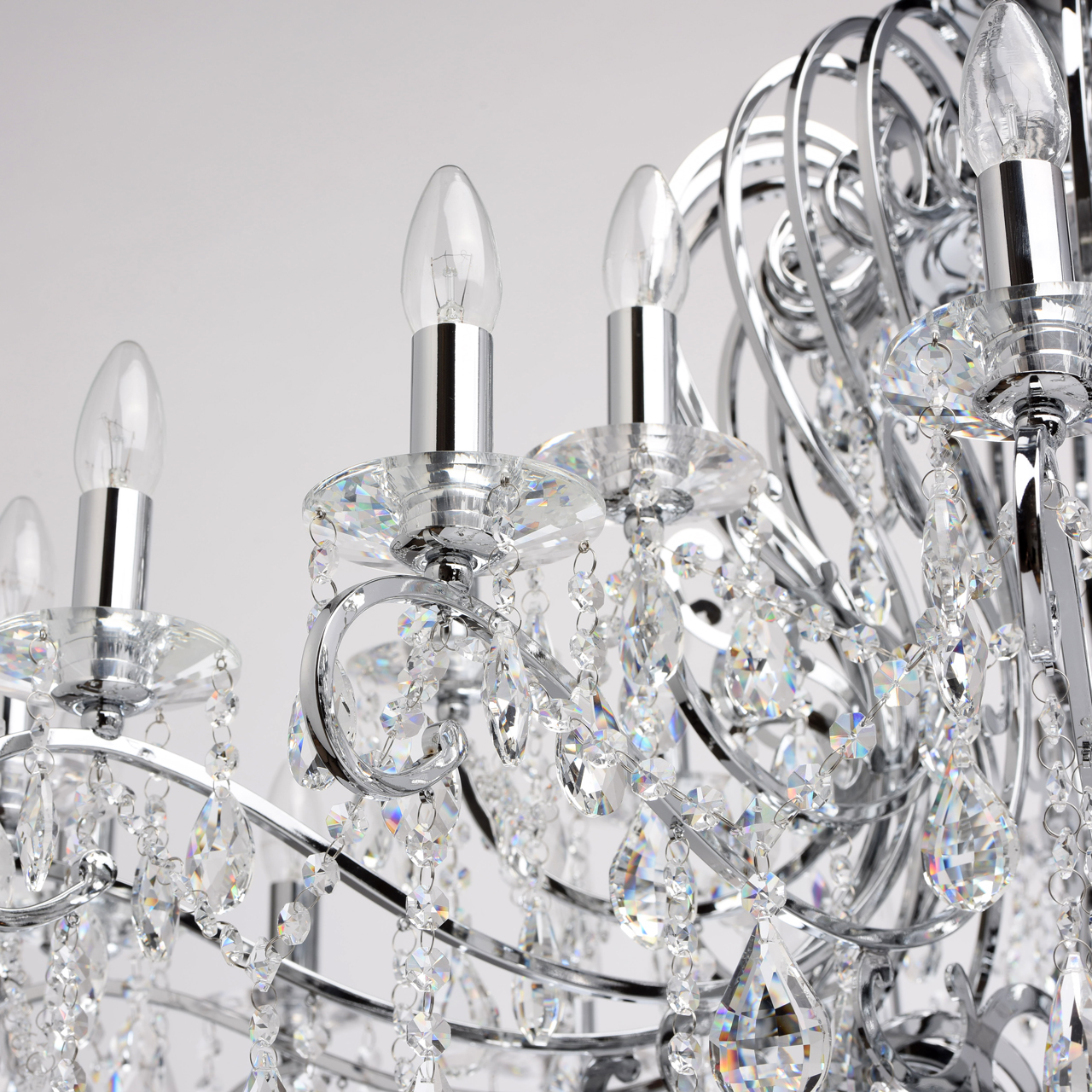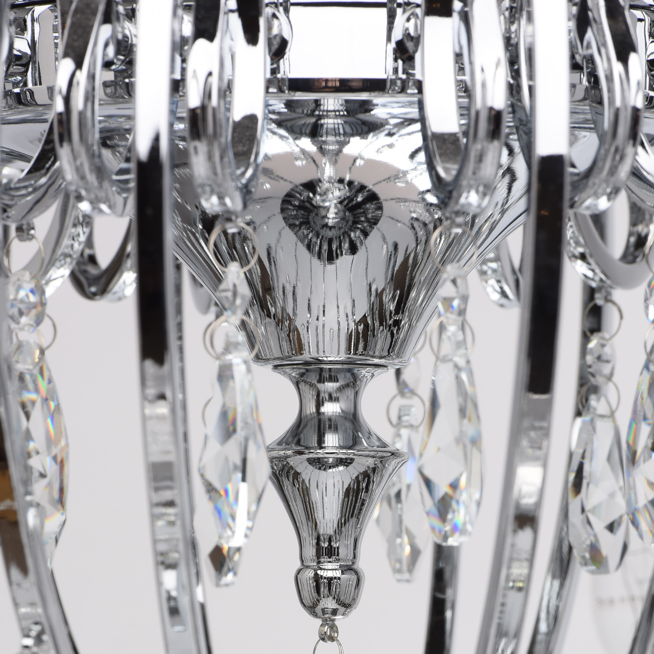 Металлическое основание гальванизировано в цвет хрома. Декоративные розетки выполнены из массива хрусталя ручной калибровки. Светильник декорирован хрусталем в форме миндаля и октагон высокого качества.