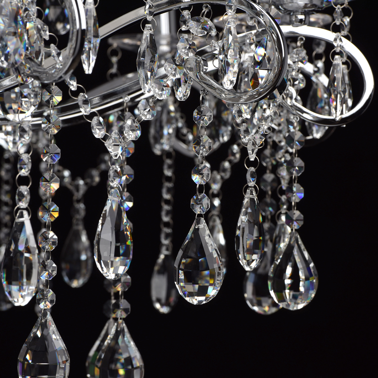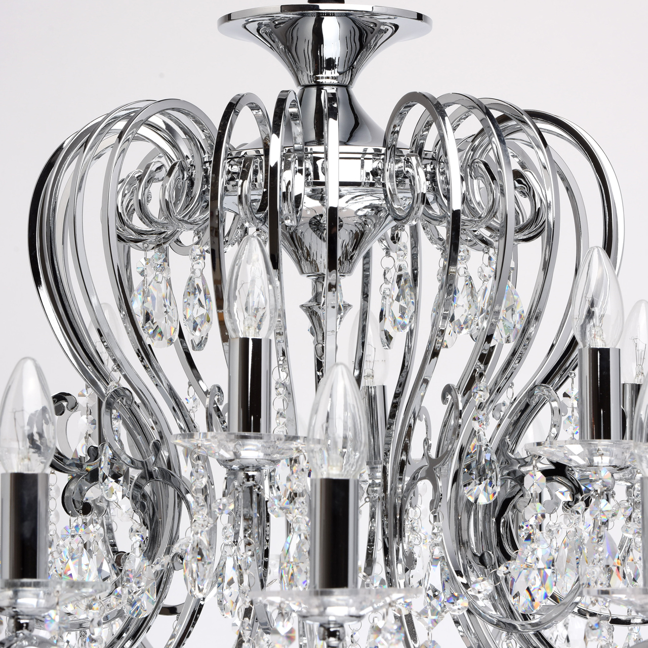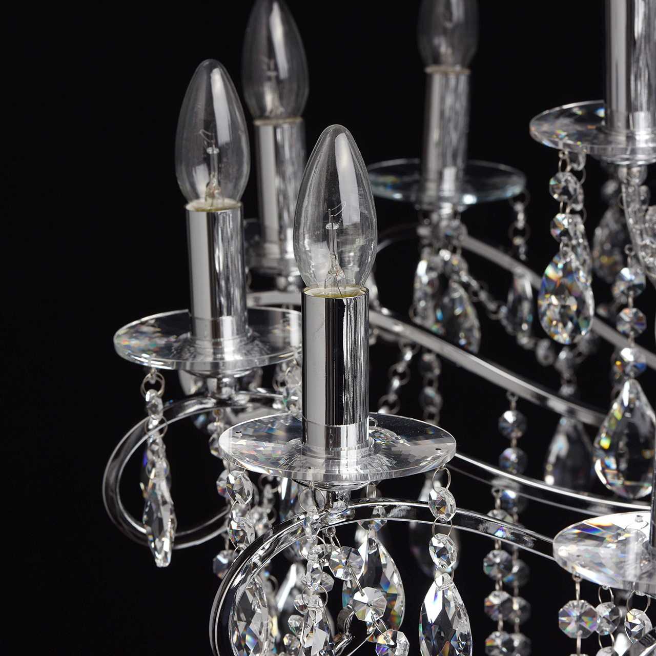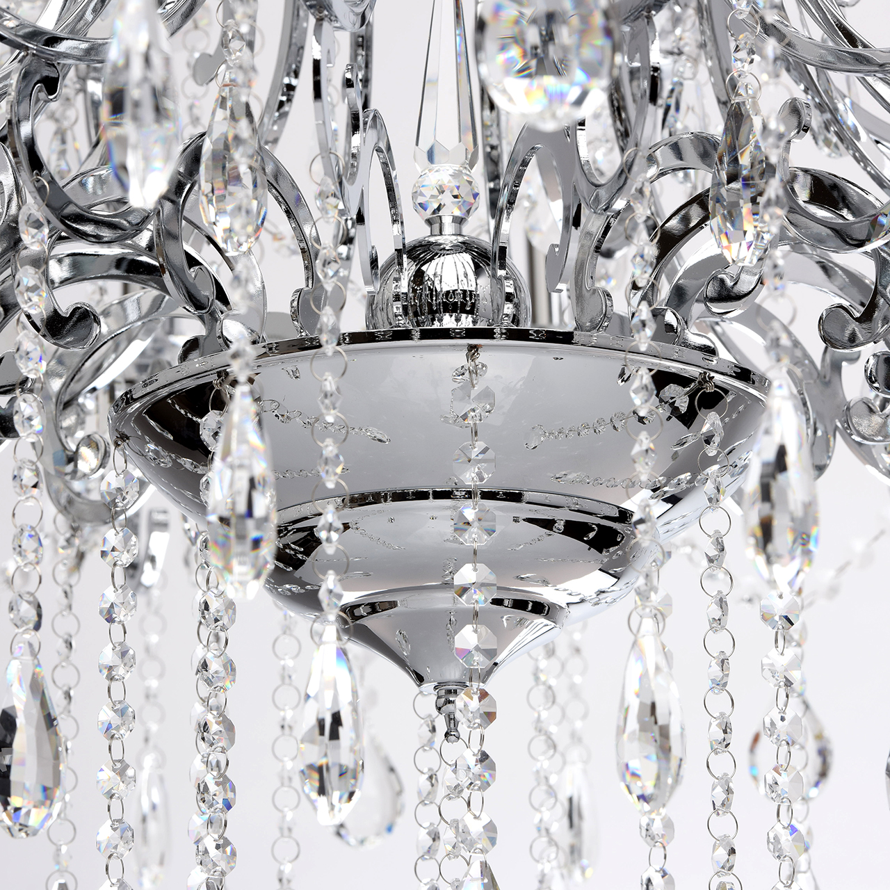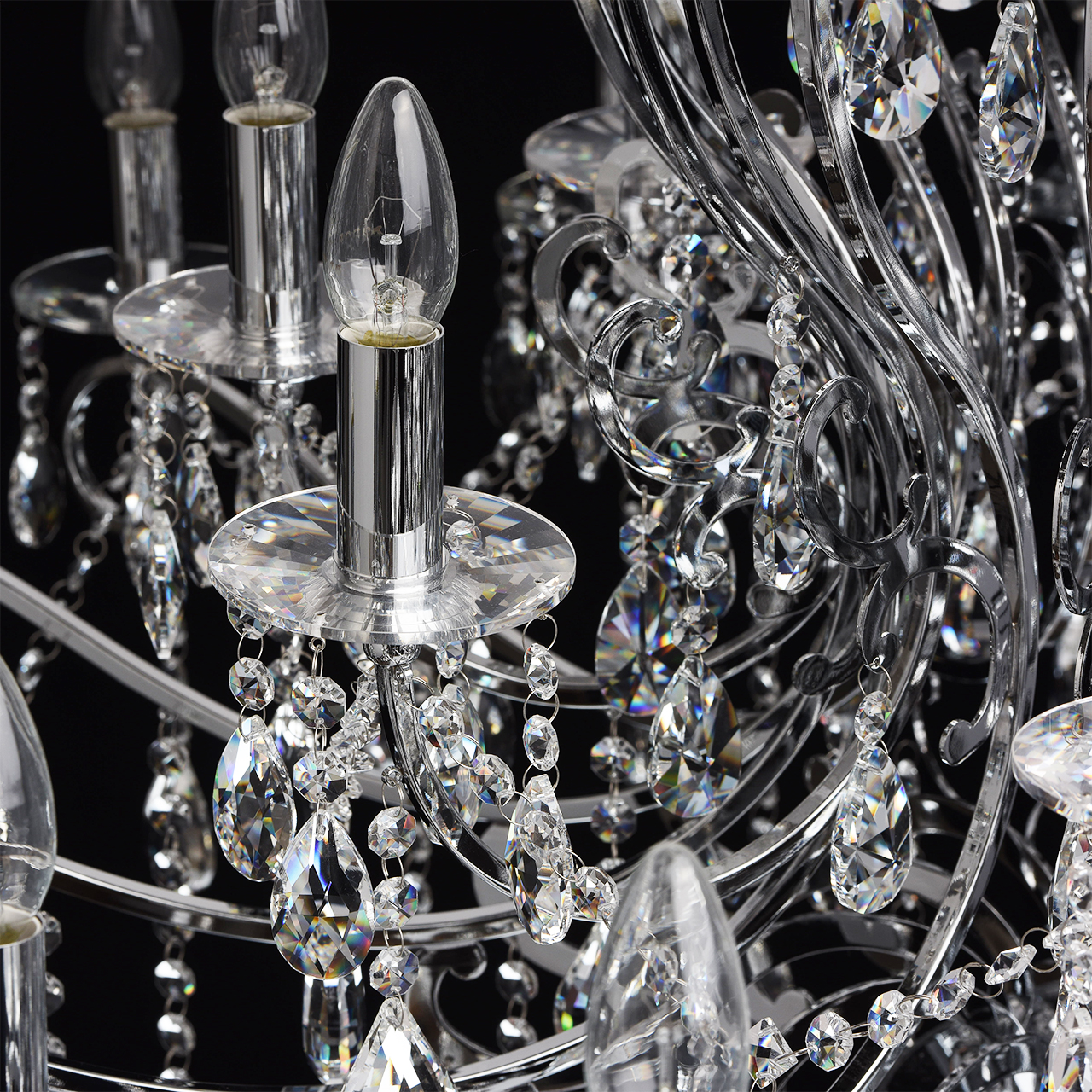 Металлическое основание гальванизировано в цвет хрома. Декоративные розетки выполнены из массива хрусталя ручной калибровки. Светильник декорирован хрусталем в форме миндаля и октагон высокого качества.
