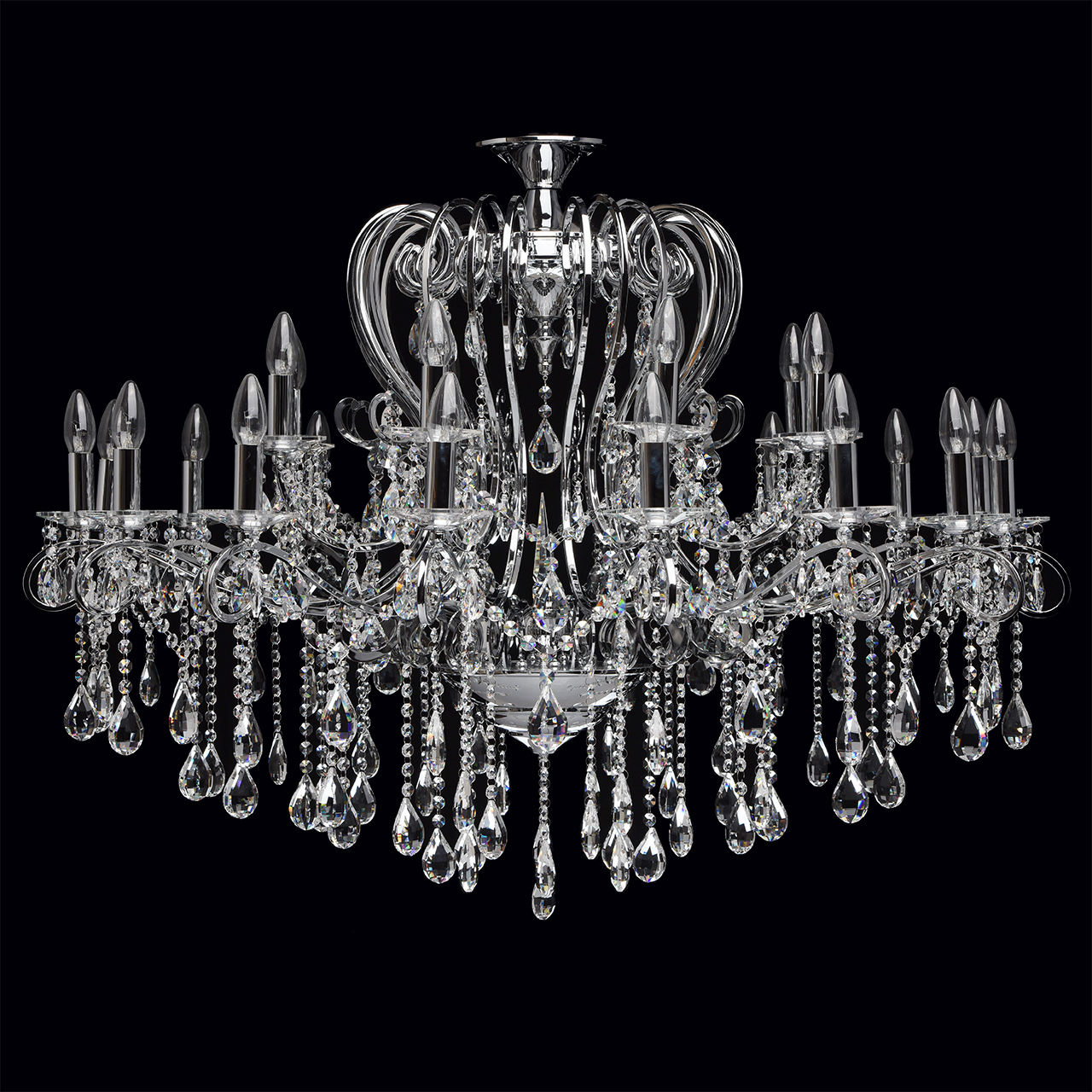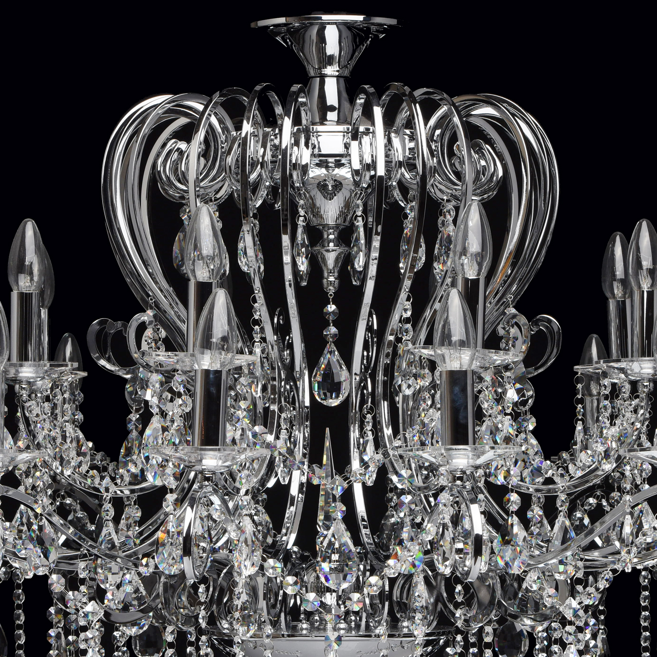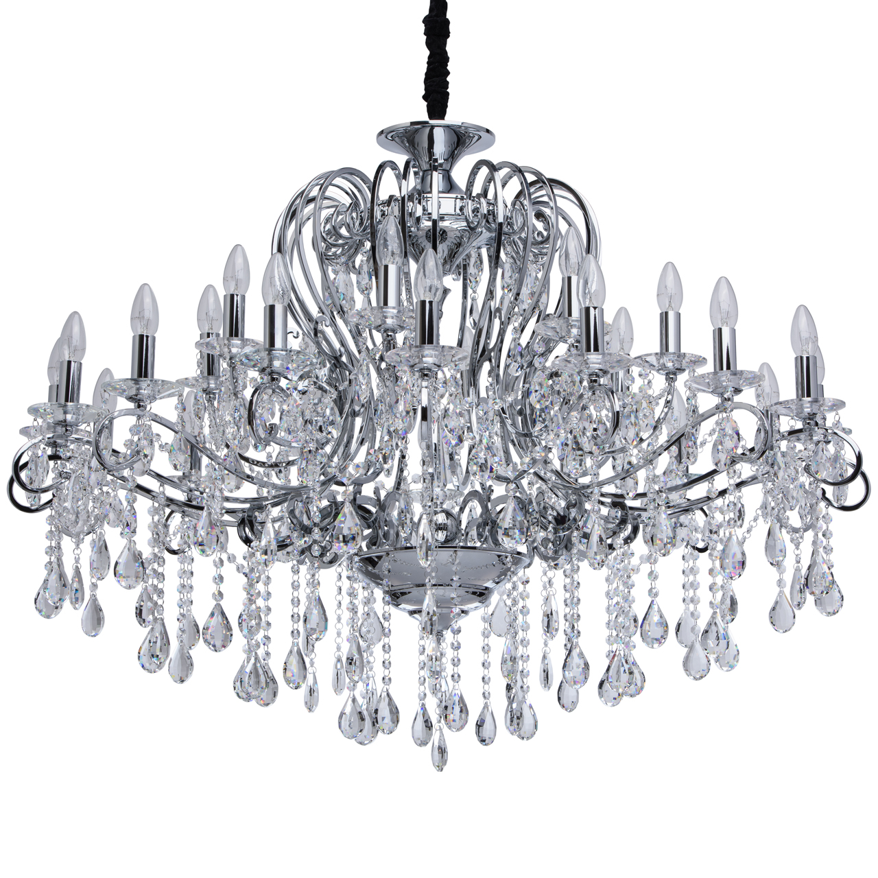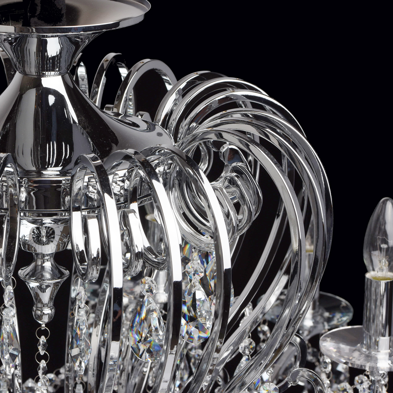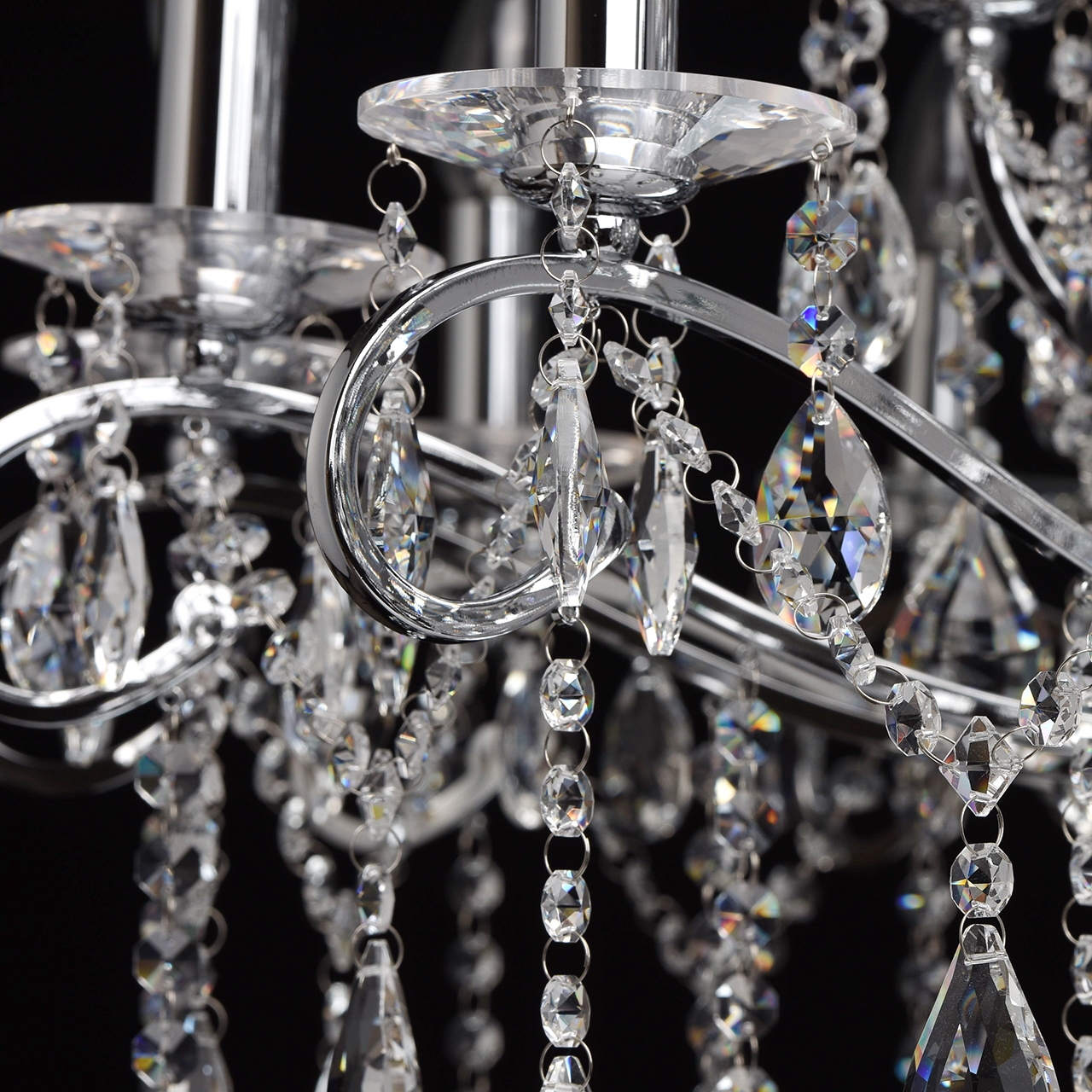 Металлическое основание гальванизировано в цвет хрома. Декоративные розетки выполнены из массива хрусталя ручной калибровки. Светильник декорирован хрусталем в форме миндаля и октагон высокого качества.