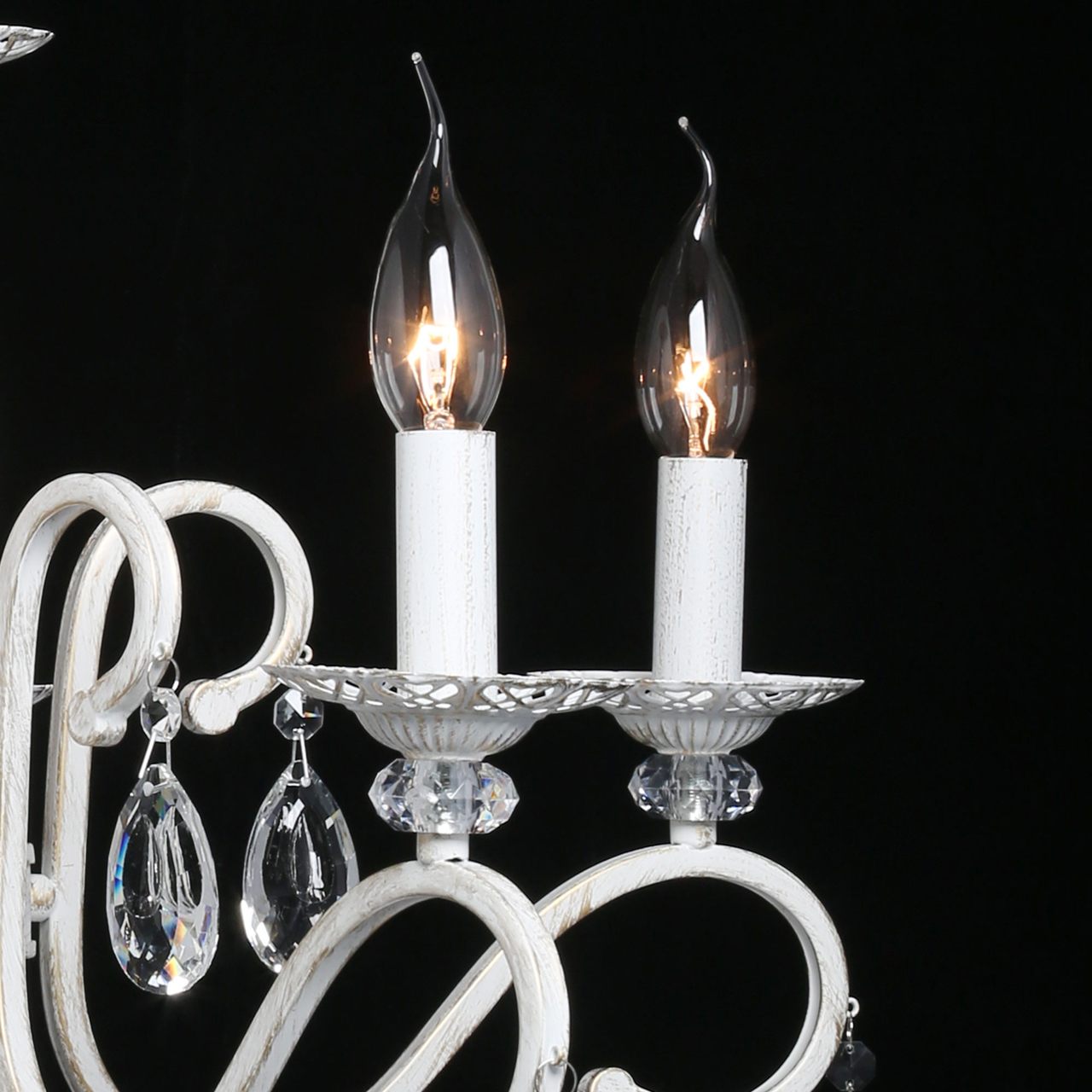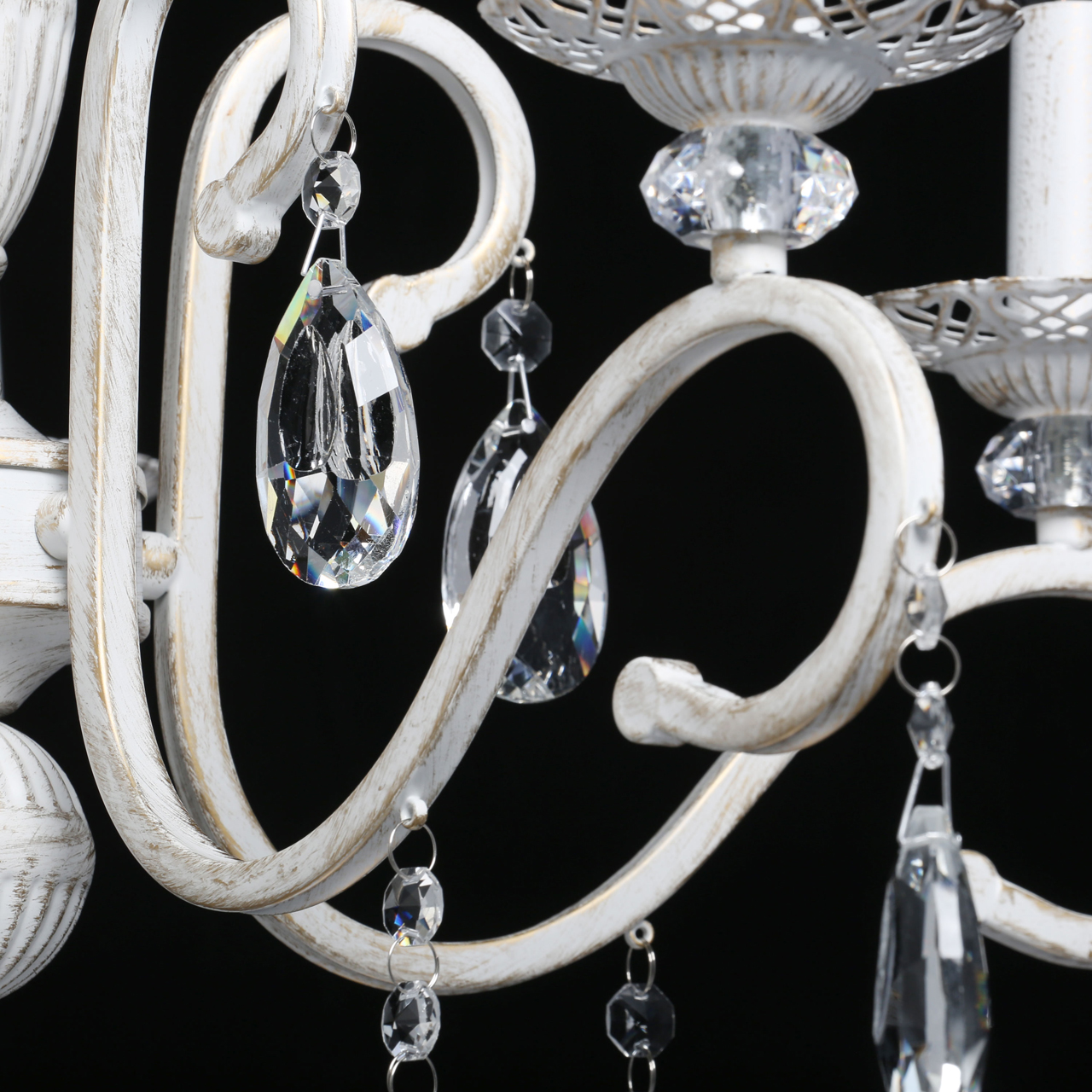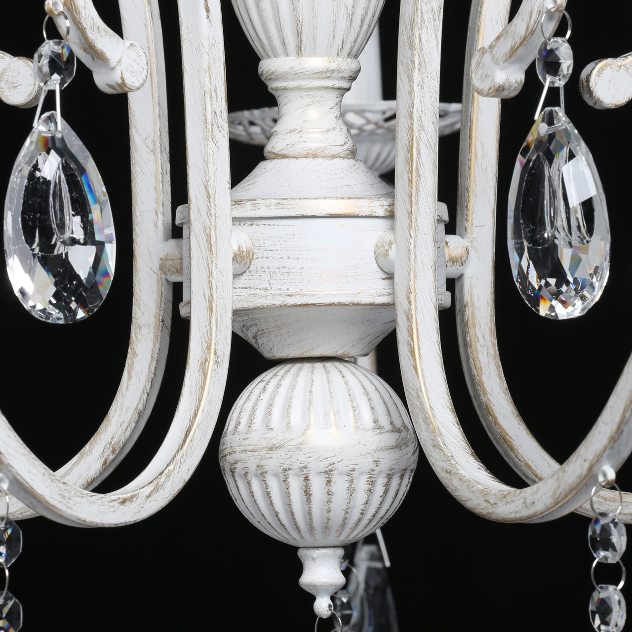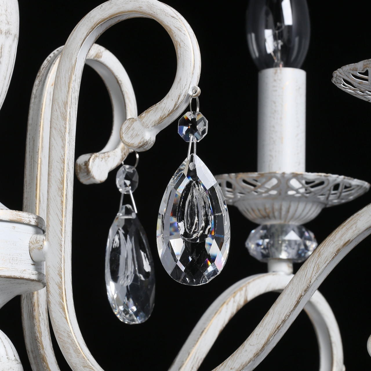 Основание светильника выполнено из металла и обработано по технологии хай-лайт, где основной слой белого цвета, а декоративный слой золотого цвета. Светильник декорирован прозрачным хрусталем. Под декоративными розетками декор из прозрачного акрила.