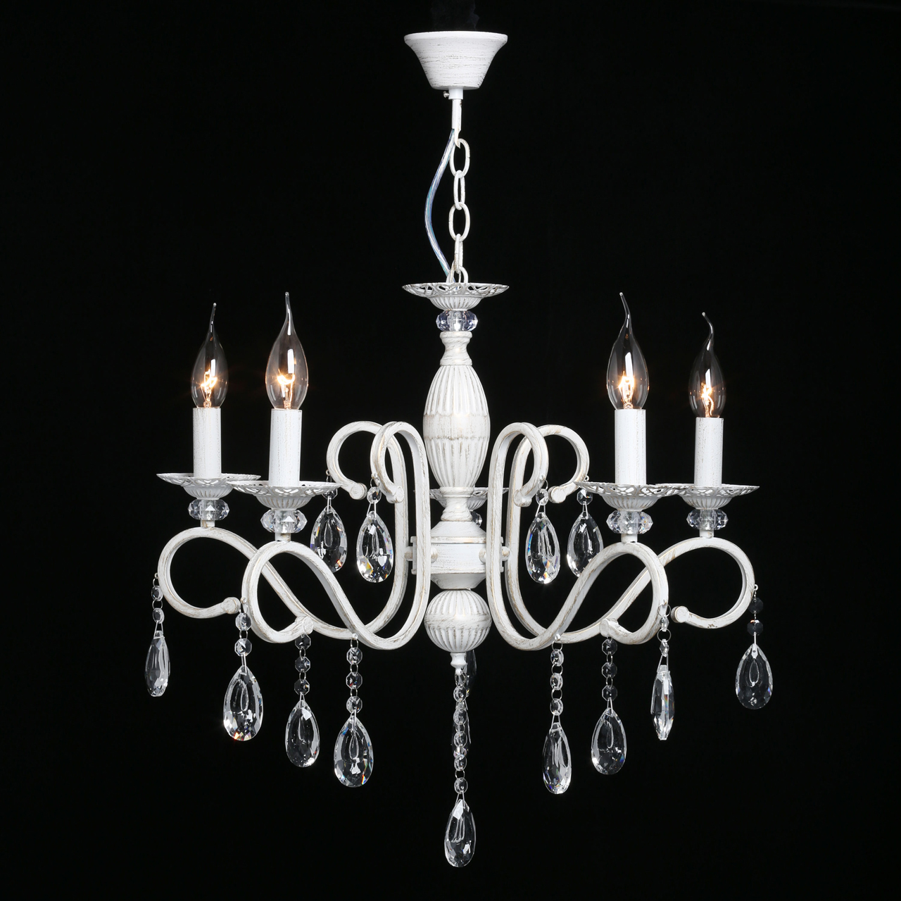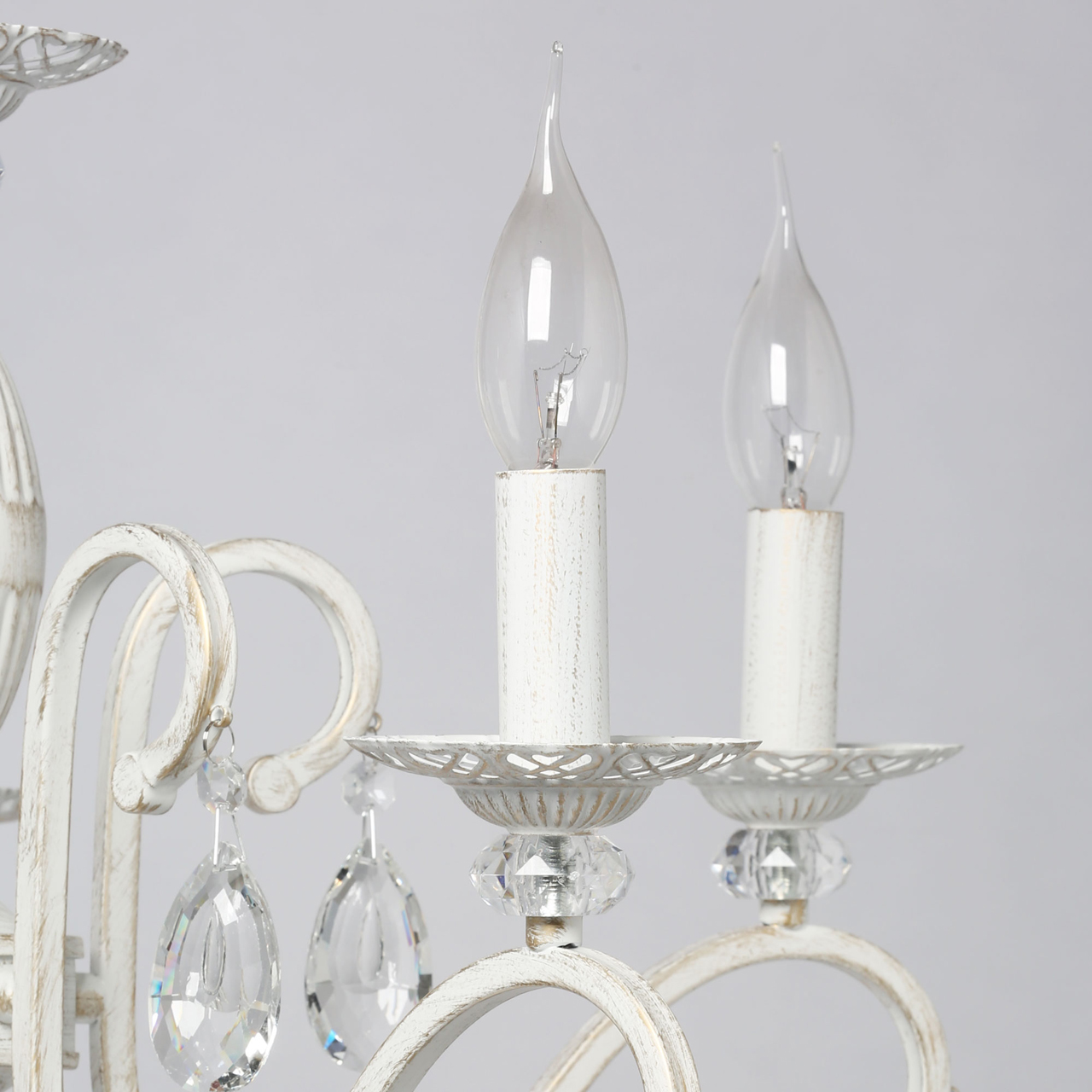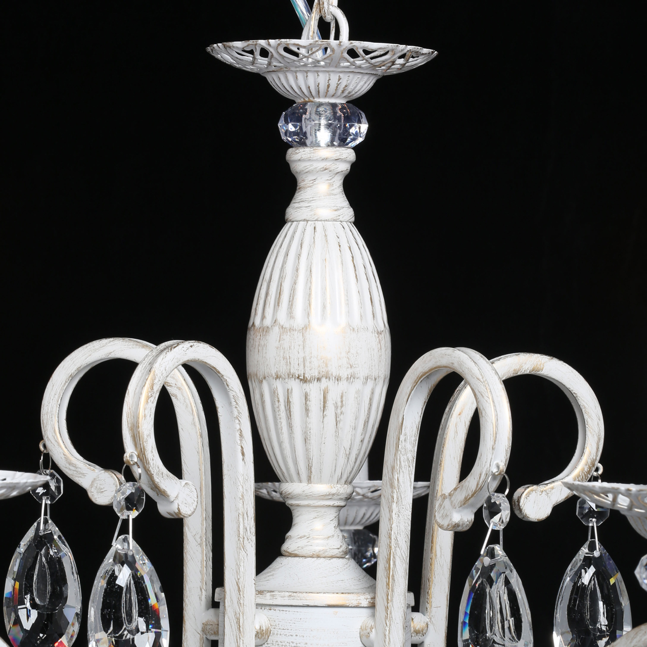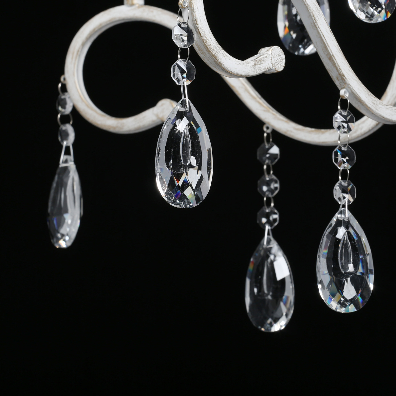 Основание светильника выполнено из металла и обработано по технологии хай-лайт, где основной слой белого цвета, а декоративный слой золотого цвета. Светильник декорирован прозрачным хрусталем. Под декоративными розетками декор из прозрачного акрила.