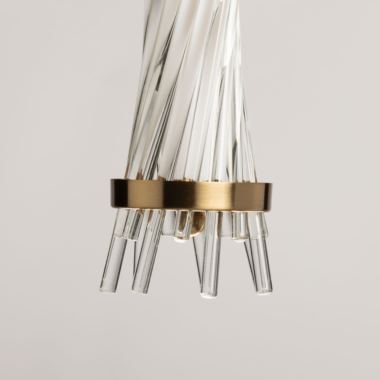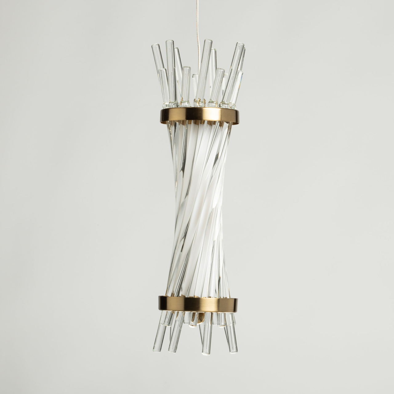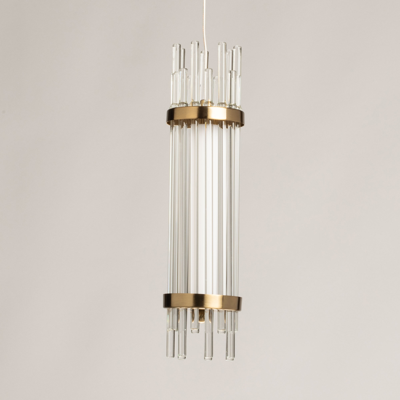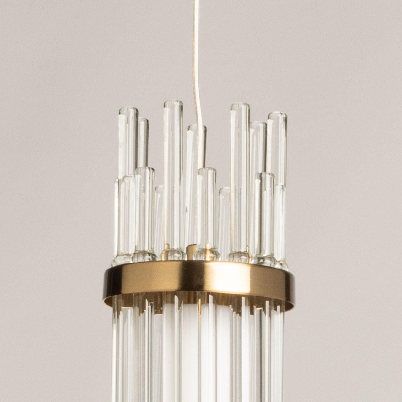 Металлическое основание подвесного светильника гальванизировано в цвет медовой бронзы. Светильник декорирован трубочками из прозрачного стекла вытянутой формы. Светодиодные источники закрыты матовым акрилом.