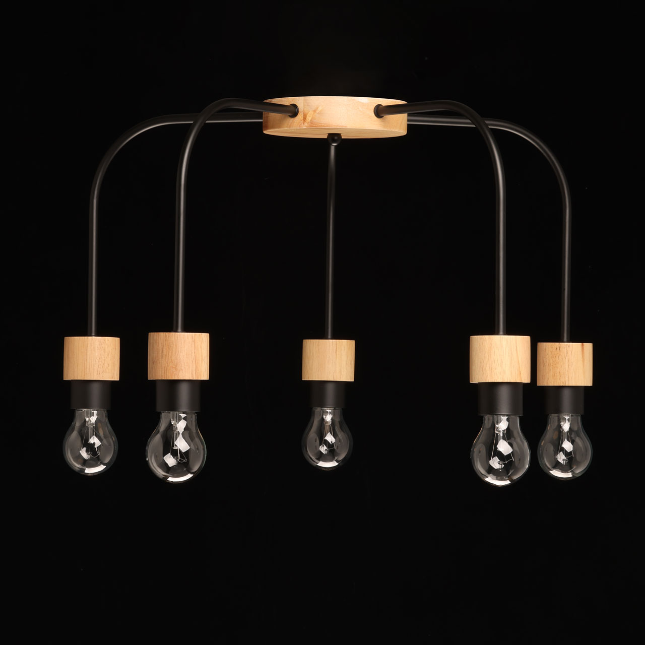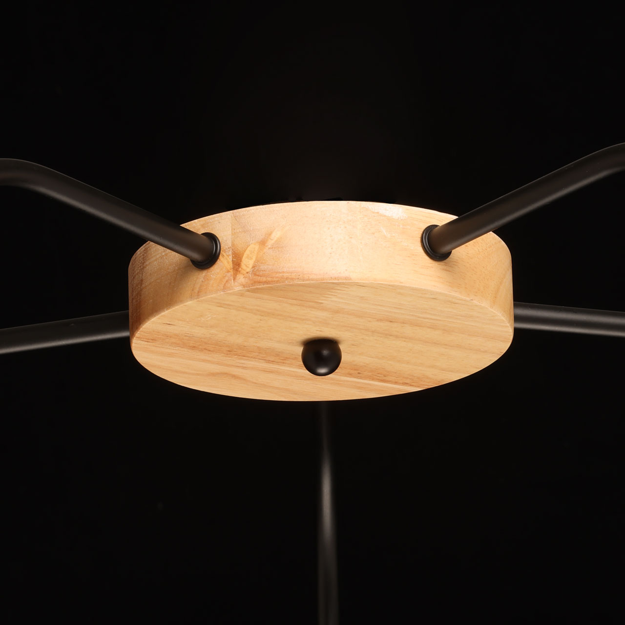 Металлическое основание потолочной люстры окрашено в черный цвет. Люстра декорирована элементами из натурального дерева.
