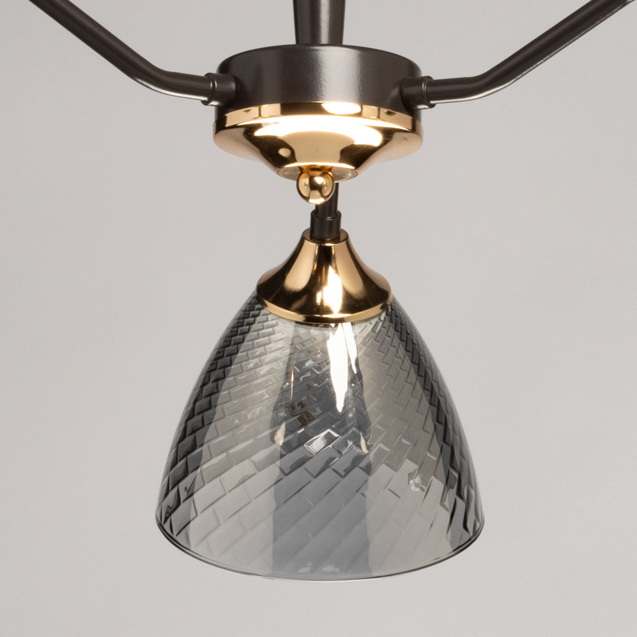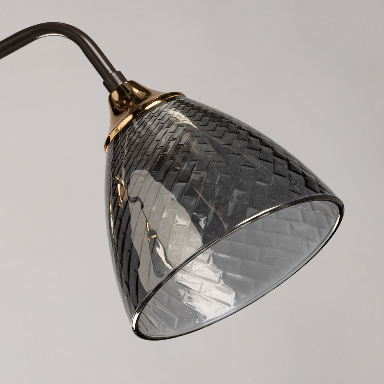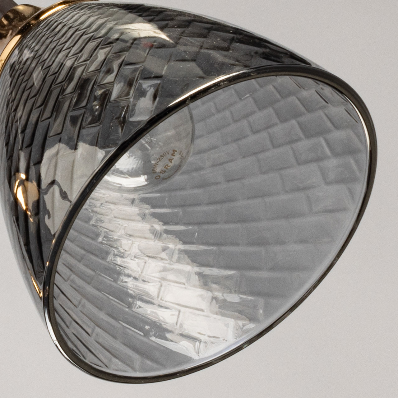 Основание светильника выполнено из металла и окрашено в цвет кофе. Отдельные элементы основания гальванизированы в цвет золота. Стеклянные плафоны отлиты в сложную форму с внутренней текстурой и гальванизированы в дымчатый цвет.