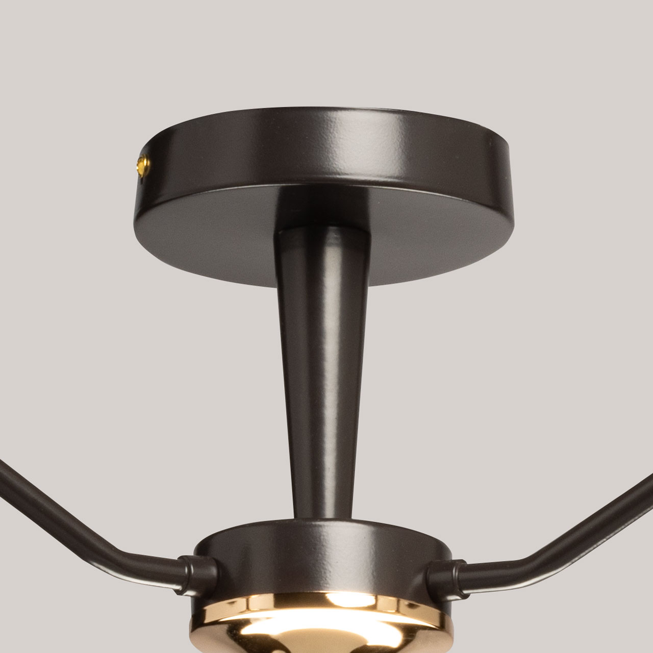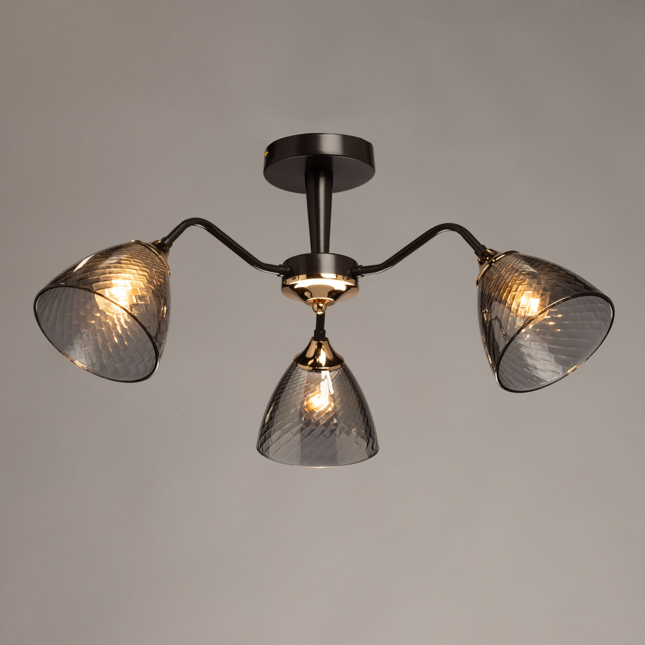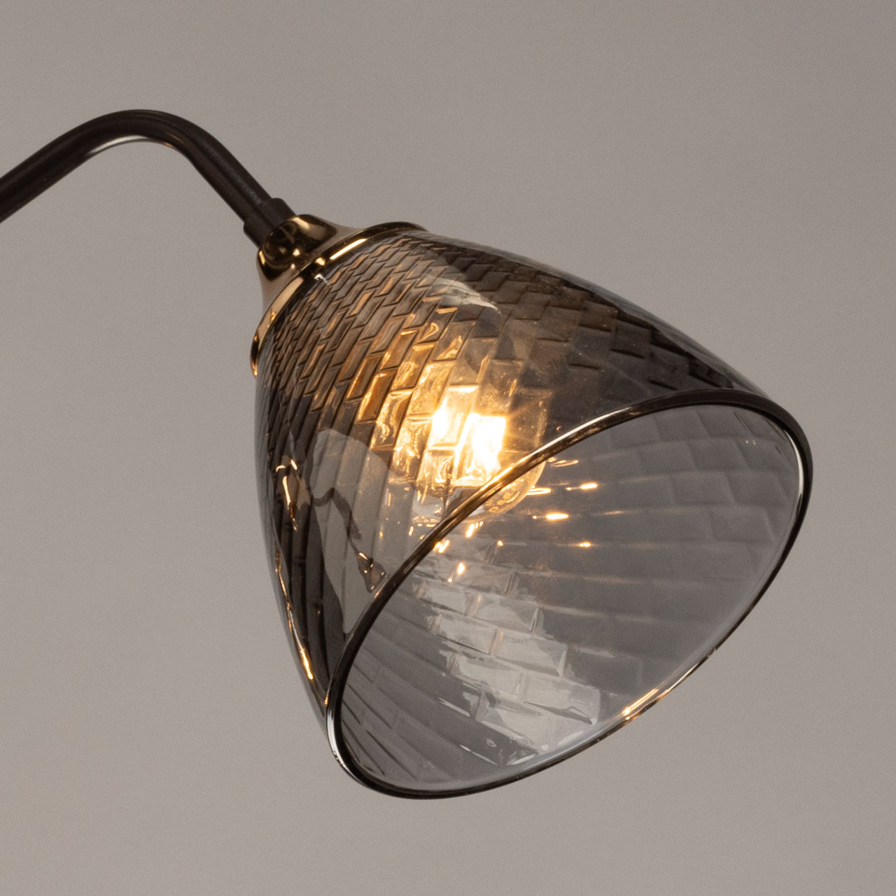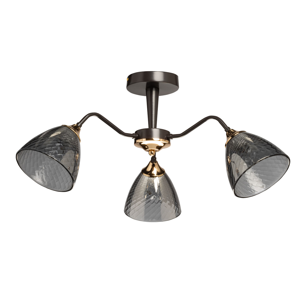 Основание светильника выполнено из металла и окрашено в цвет кофе. Отдельные элементы основания гальванизированы в цвет золота. Стеклянные плафоны отлиты в сложную форму с внутренней текстурой и гальванизированы в дымчатый цвет.