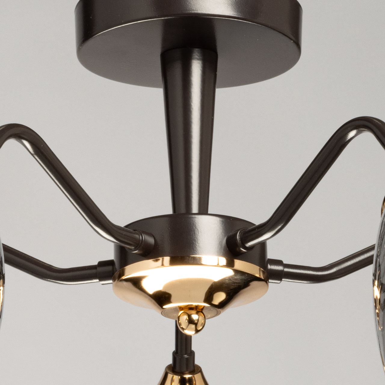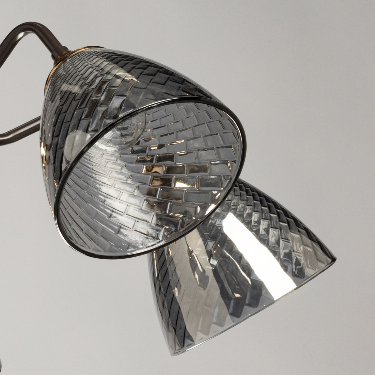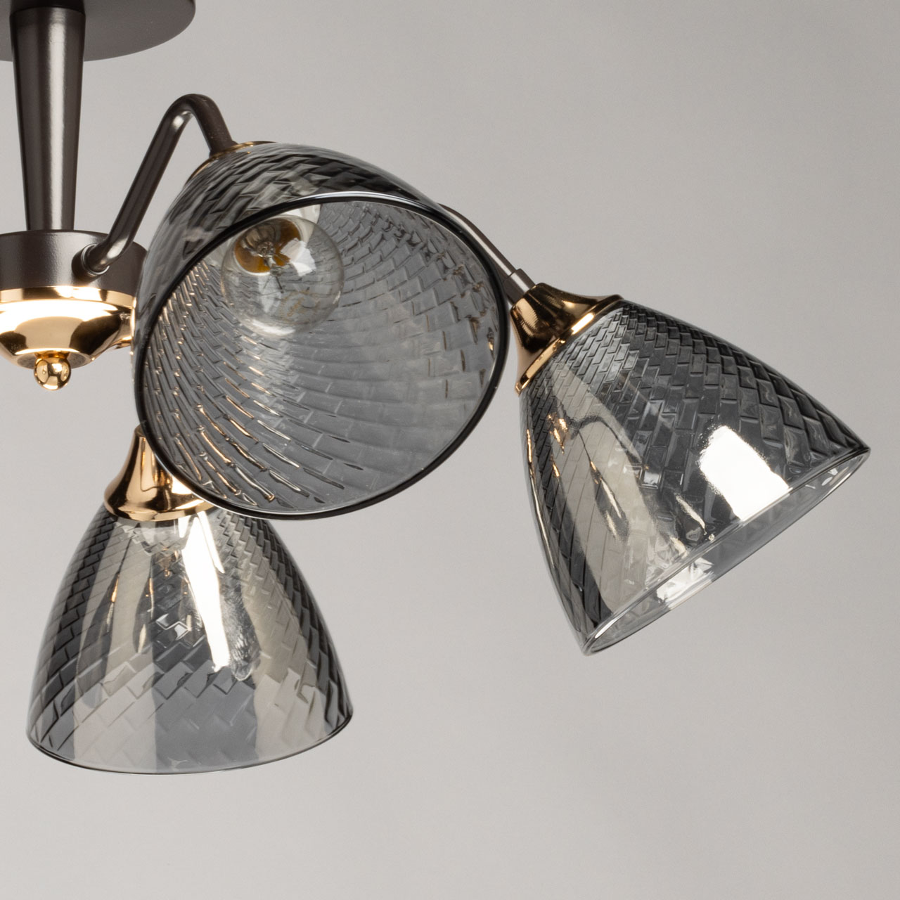 Основание светильника выполнено из металла и окрашено в цвет кофе. Отдельные элементы основания гальванизированы в цвет золота. Стеклянные плафоны отлиты в сложную форму с внутренней текстурой и гальванизированы в дымчатый цвет.