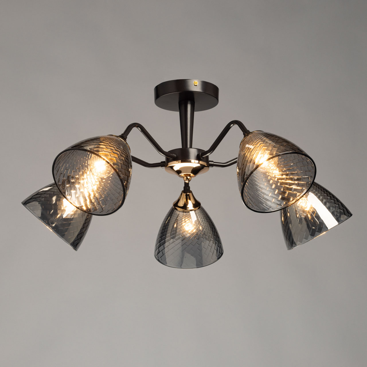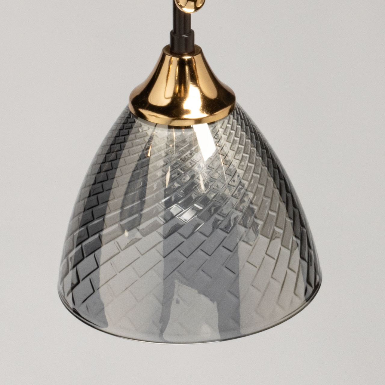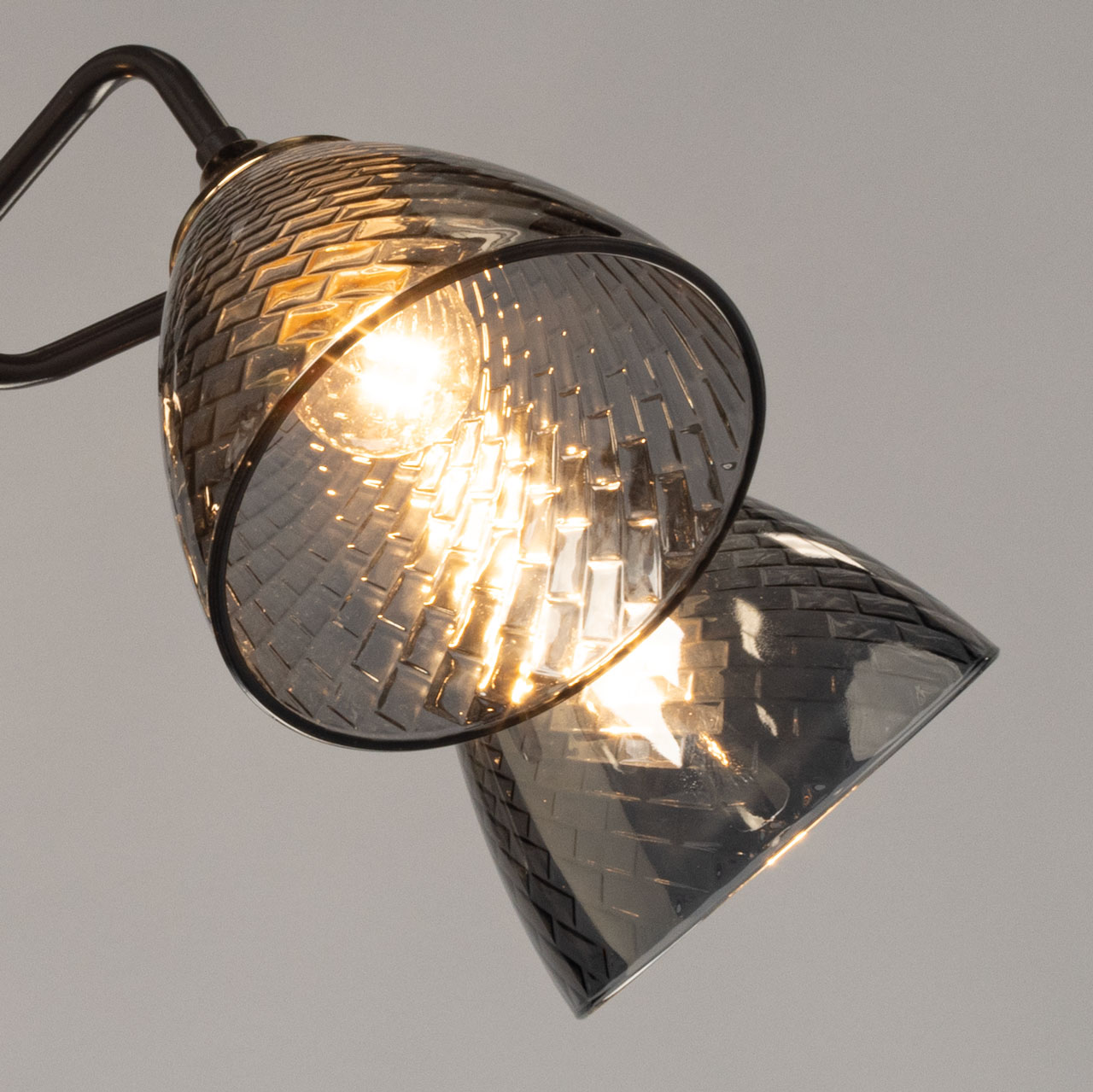 Основание светильника выполнено из металла и окрашено в цвет кофе. Отдельные элементы основания гальванизированы в цвет золота. Стеклянные плафоны отлиты в сложную форму с внутренней текстурой и гальванизированы в дымчатый цвет.