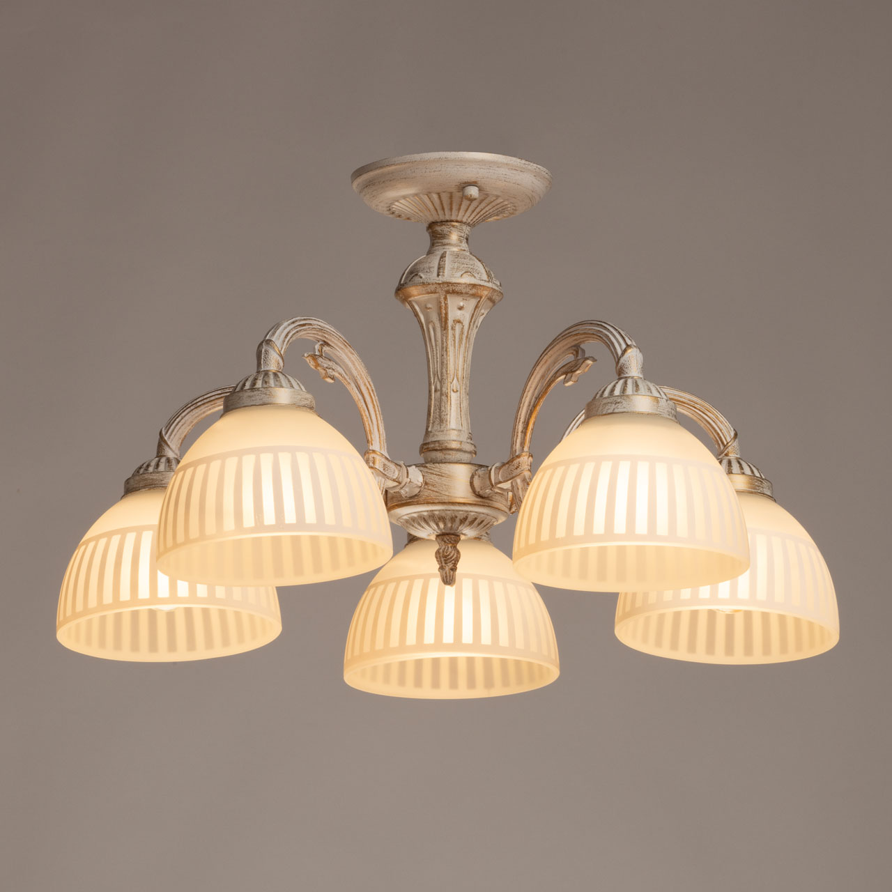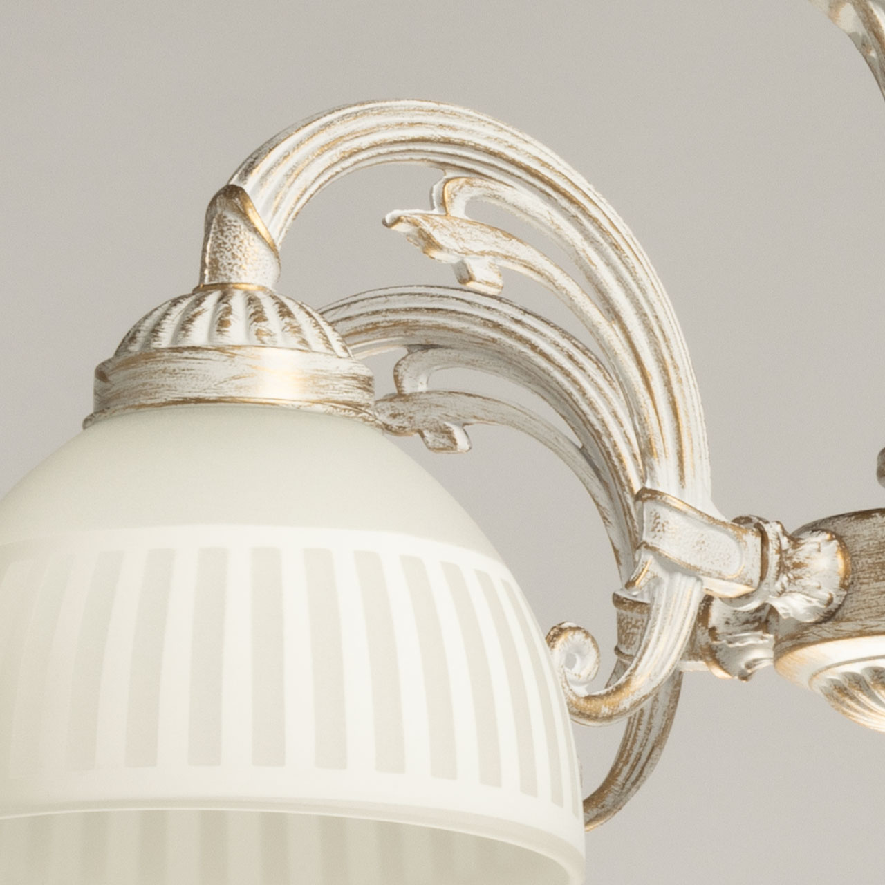 Основание и рожки выполнены из комбинации сплавов металлов и обработаны по технологии двойного окрашивания, основной слой — белый, декоративный слой — золотого цвета. Рожки выполнены по технологии художественного литья. Стеклянные плафоны отлиты в форму и окрашены в белый цвет.