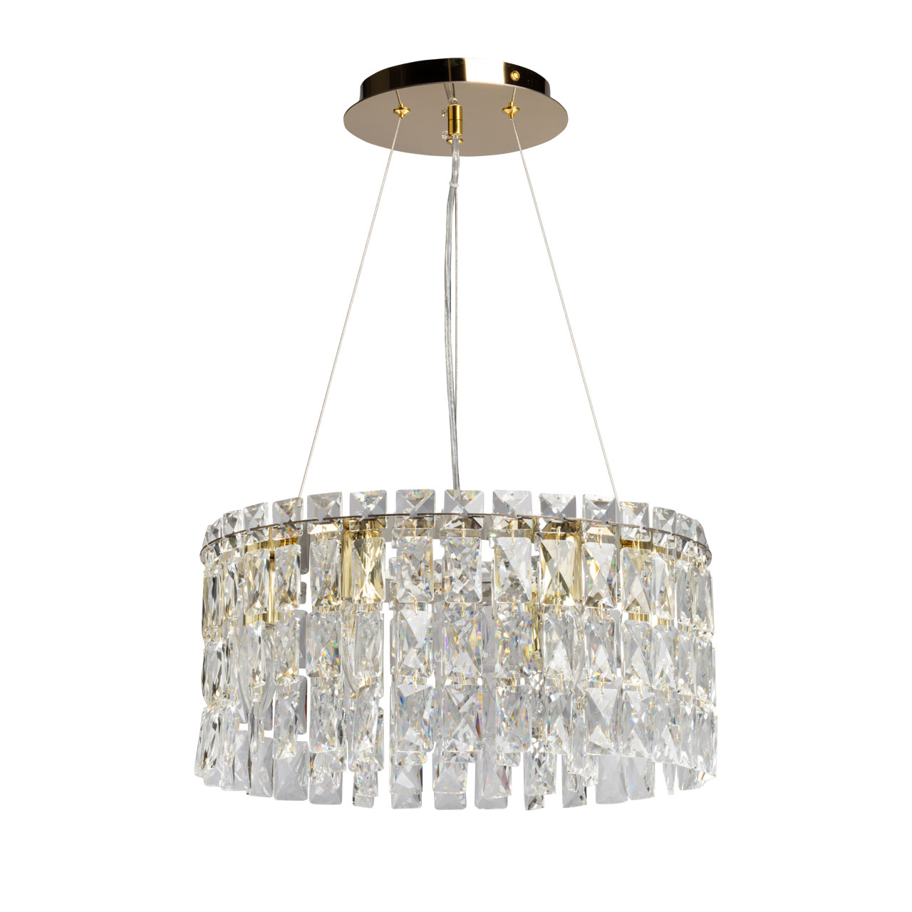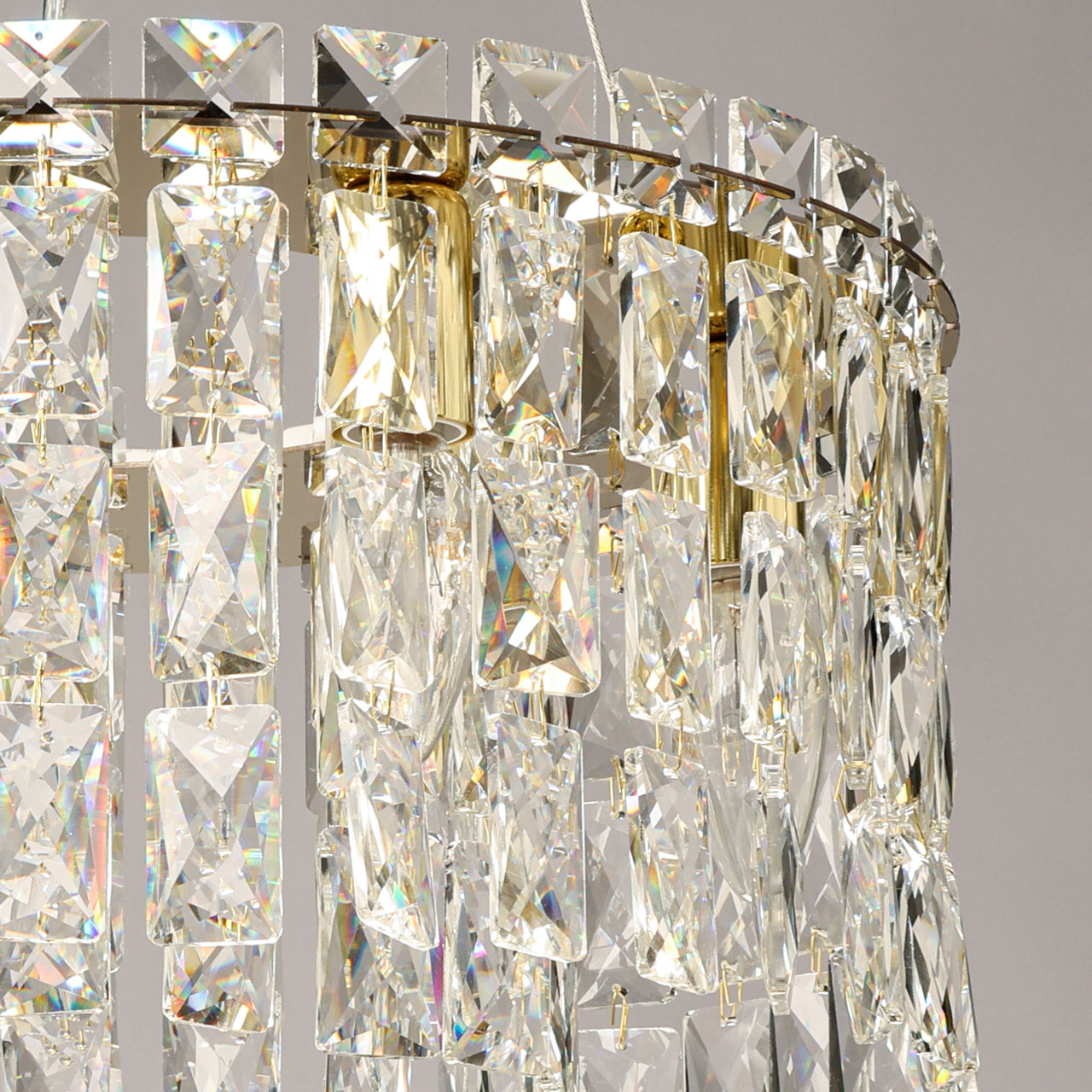 Металлическое основание люстры гальванизировано в цвет золота. Светильник декорирован прозрачным хрусталем прямоугольной и квадратной формы.