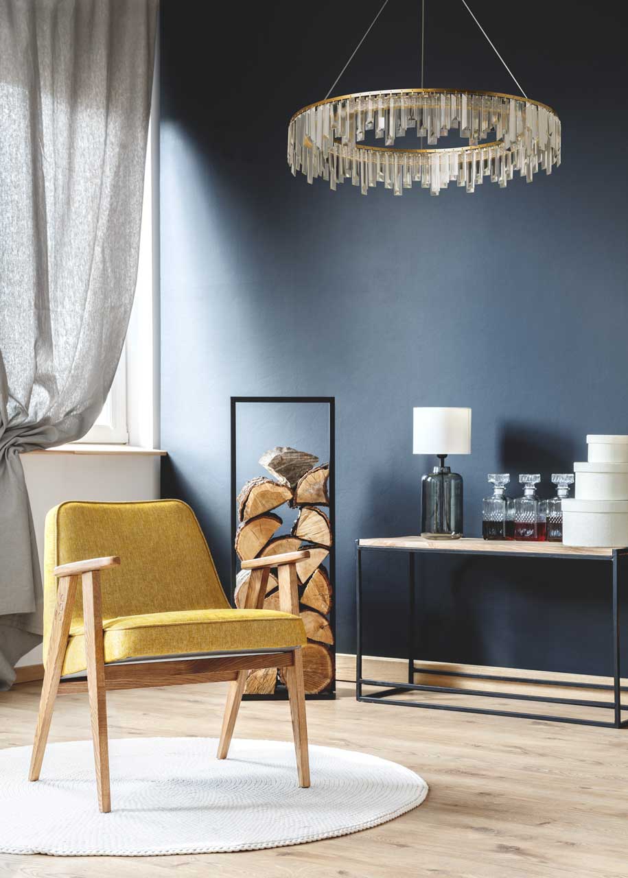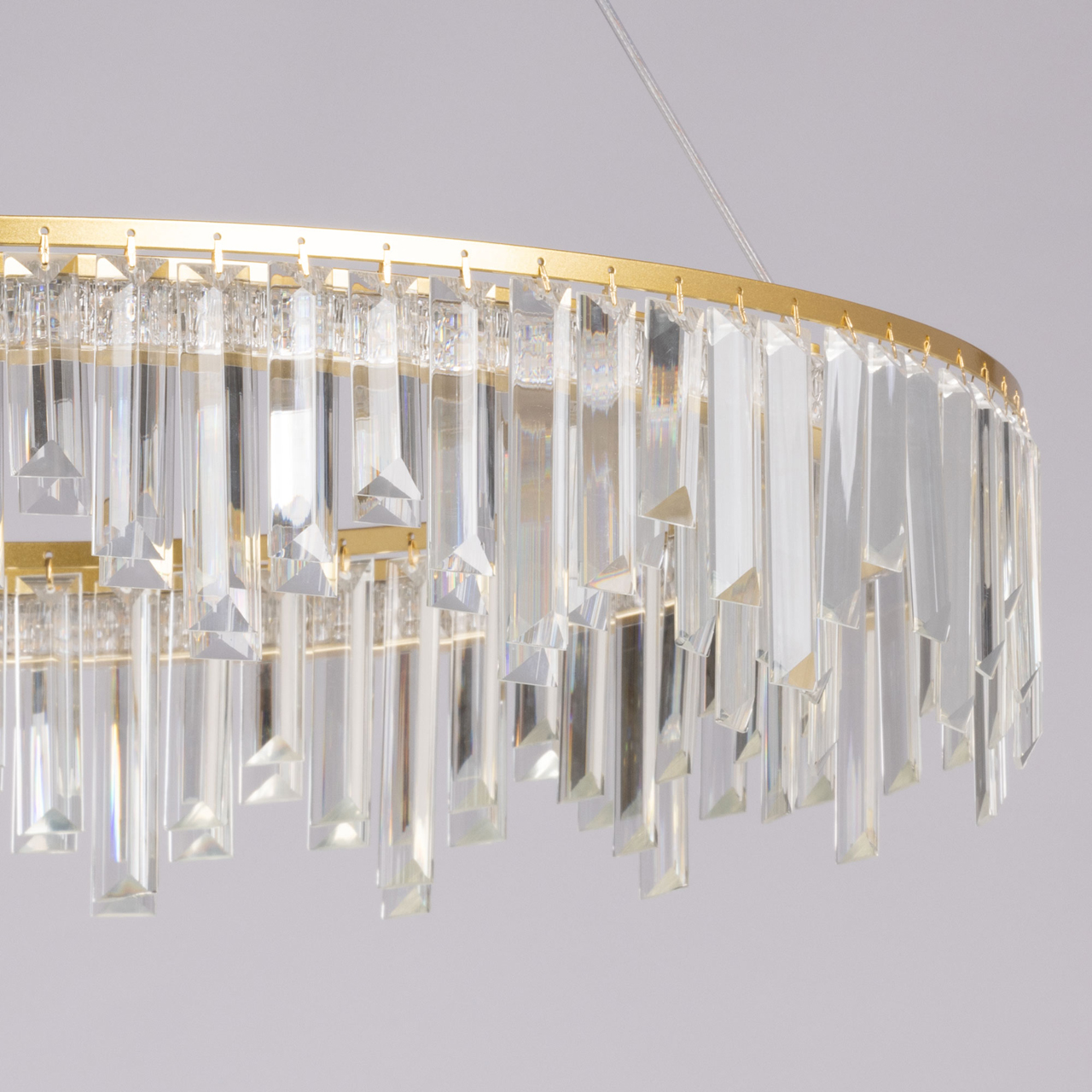 Металлическое основание подвесной люстры окрашено в цвет матового золота. Люстра декорирована прозрачным хрусталем вытянутой формы.