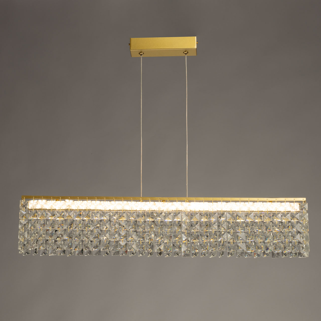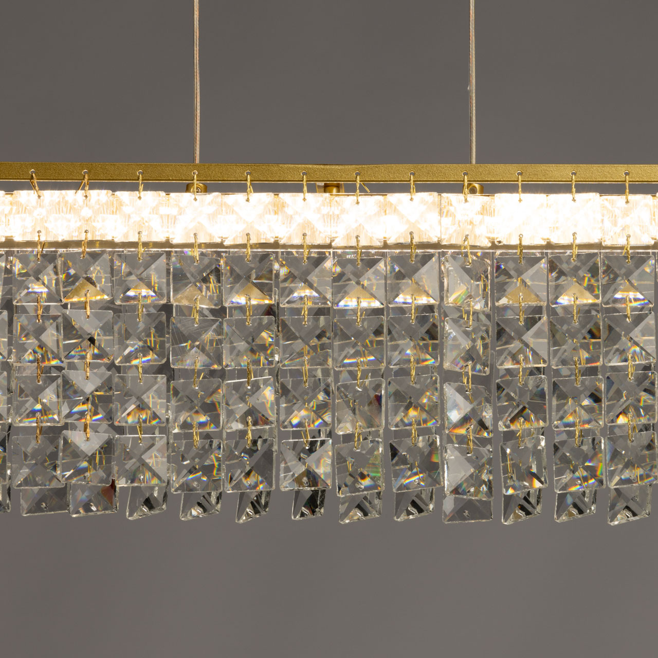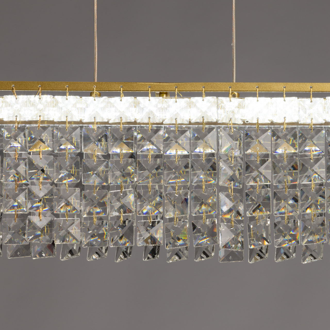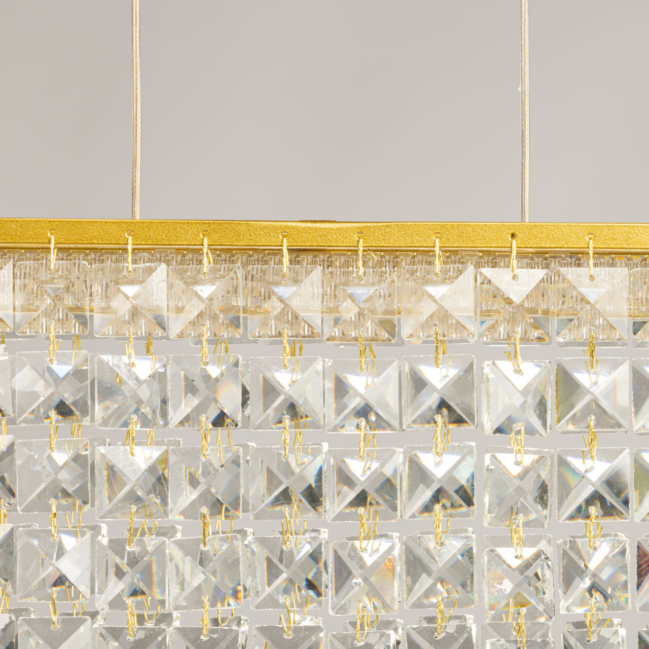 Металлическое основание люстры гальванизировано в цвет золота. Светильник декорирован прозрачным хрусталем в форме квадрата.