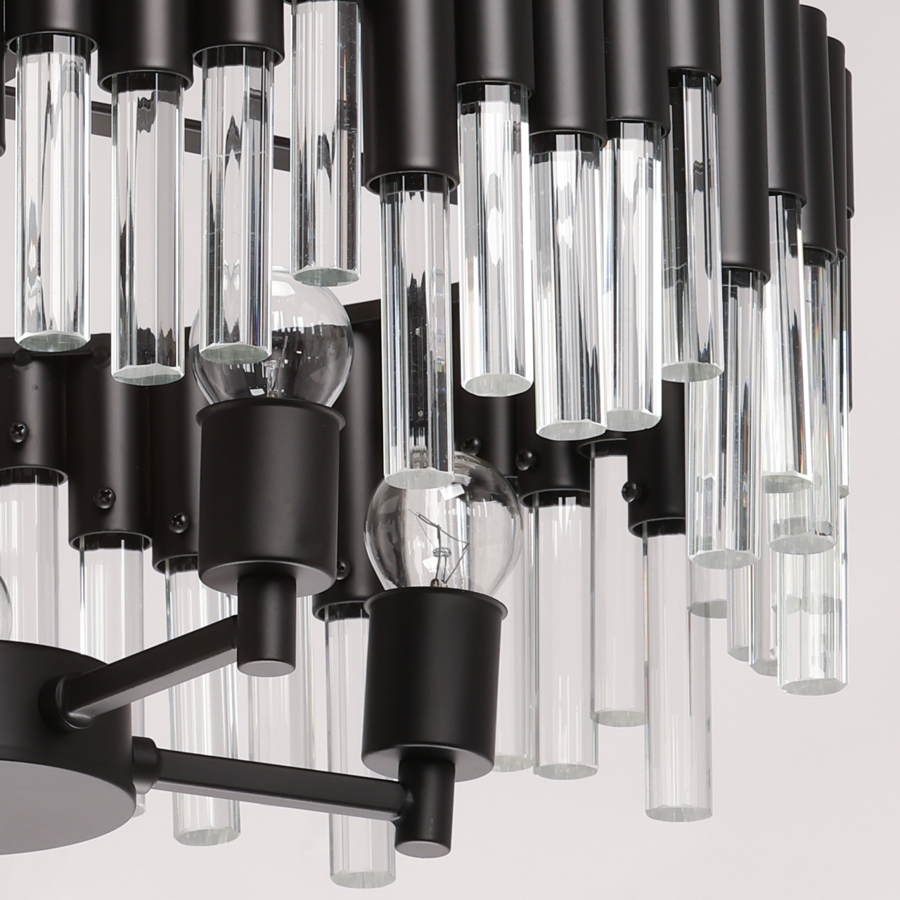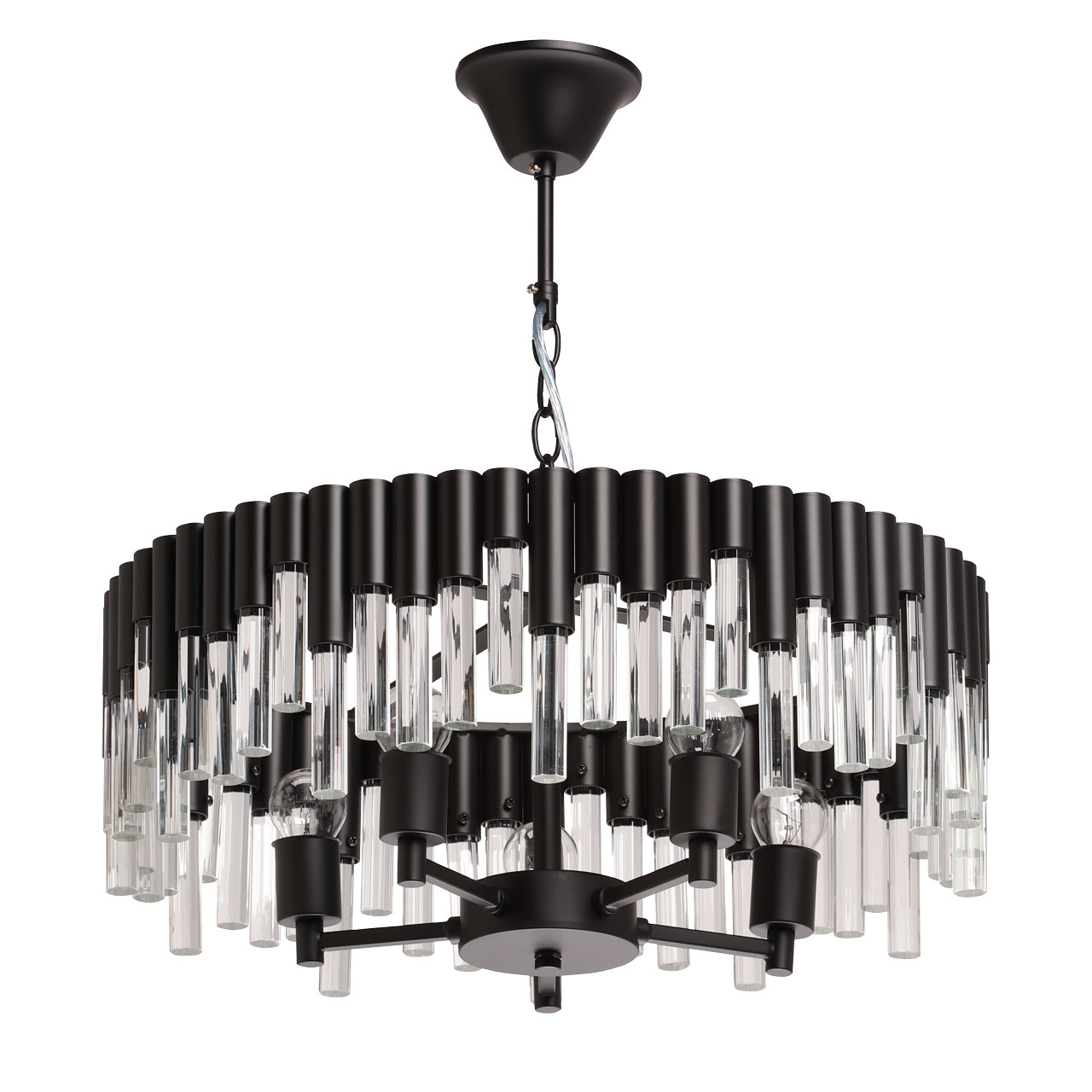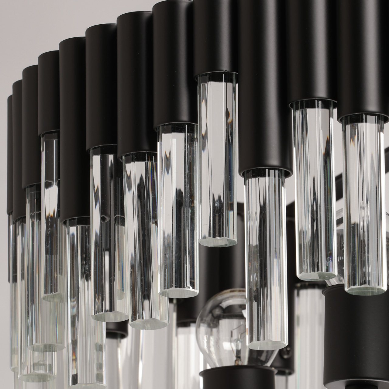 Металлическое основание люстры окрашено в чёрный цвет. Плафон выполнен из комбинации металлических трубочек черного цвета и прозрачных стеклянных элементов.