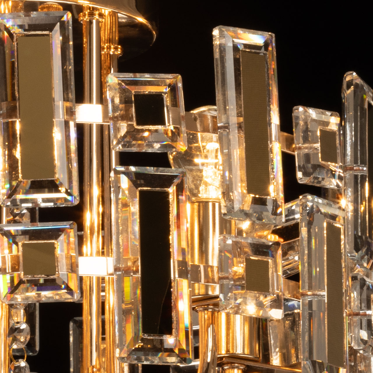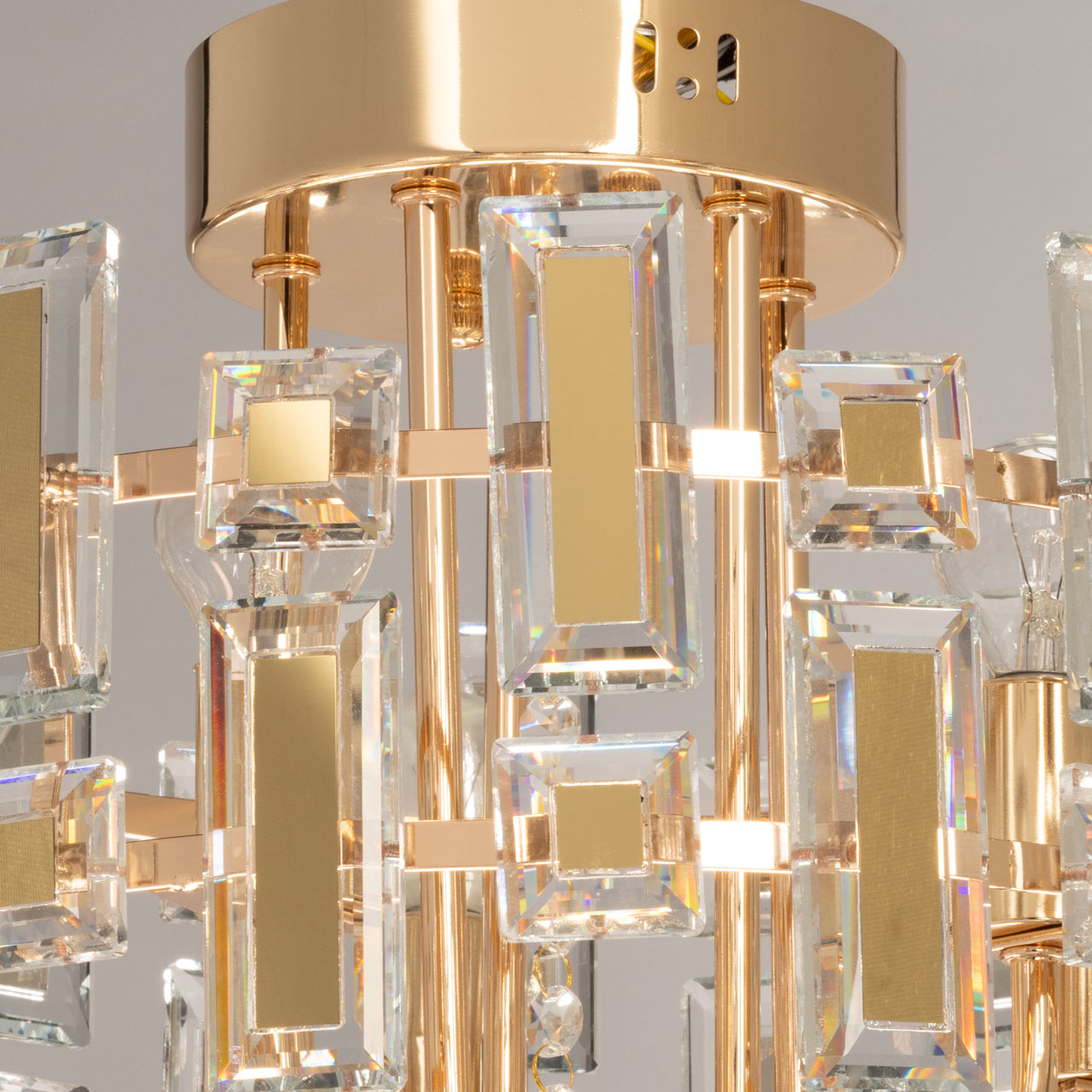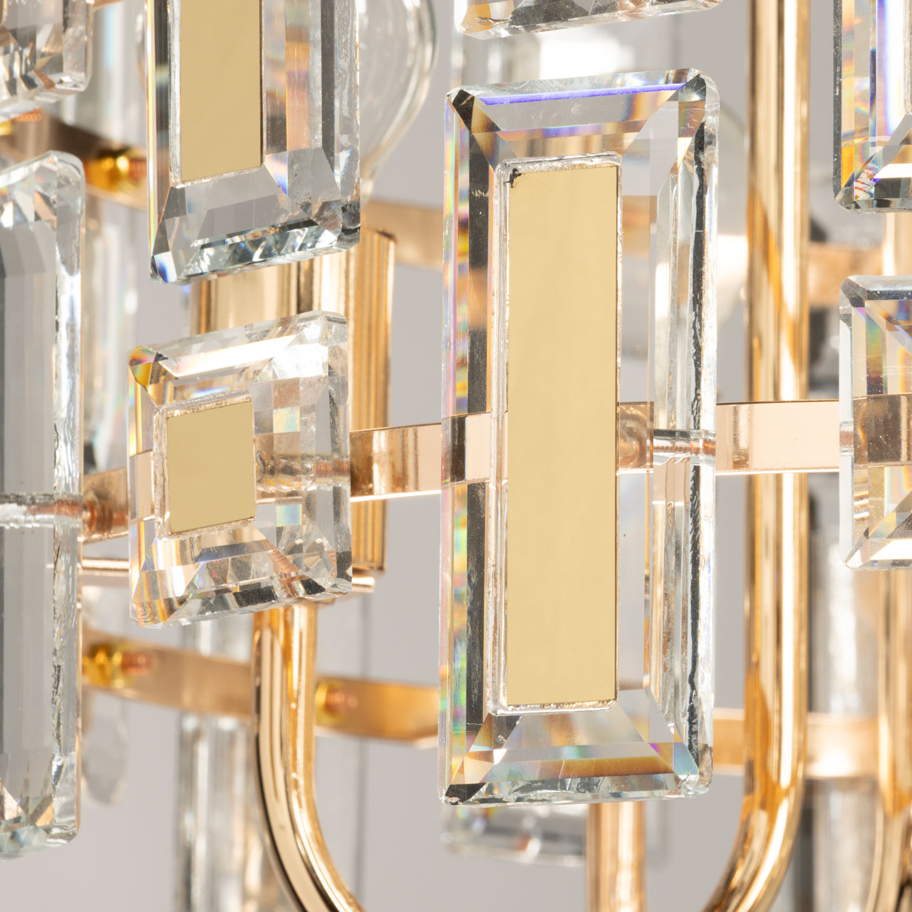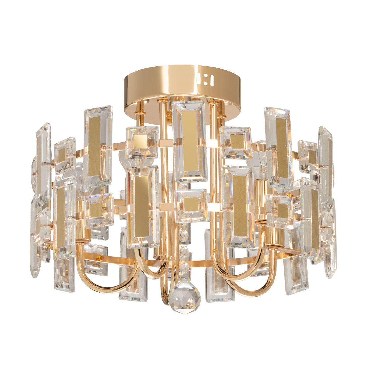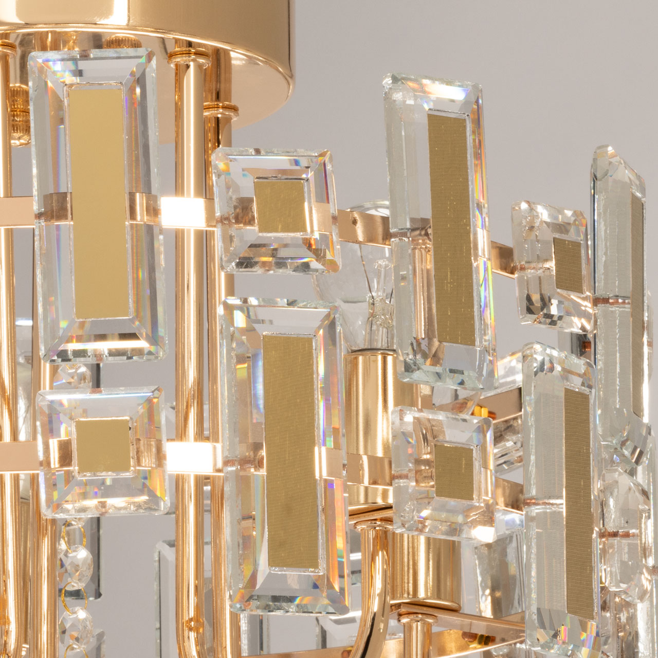 Металлическое основание потолочной люстры гальванизировано в цвет золота. Люстра декорирована прозрачным хрусталем прямоугольной формы и формы шара. Хрустальные элементы разного размера дополнительно декорированы металлическими пластинами, гальванизированными в цвет основания.