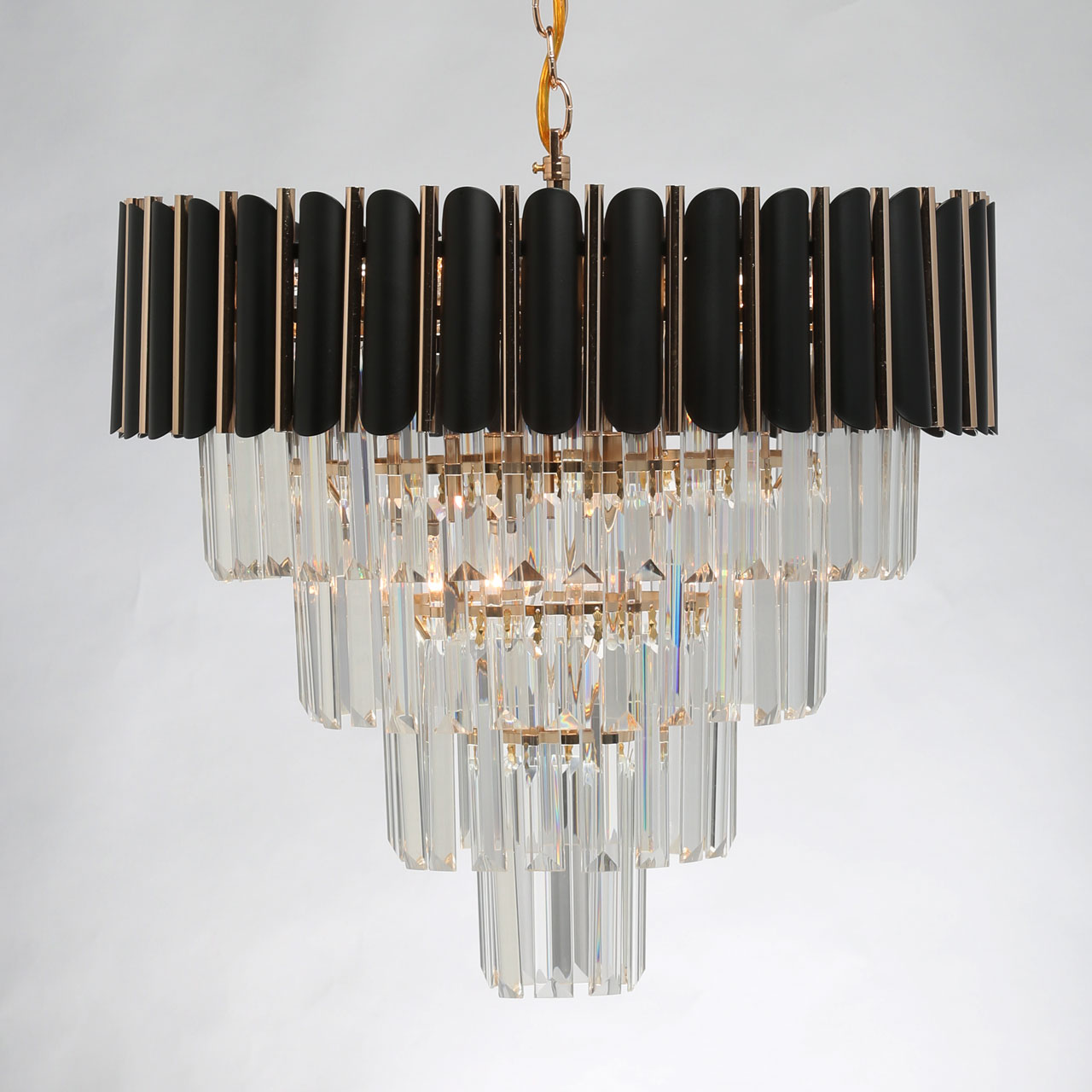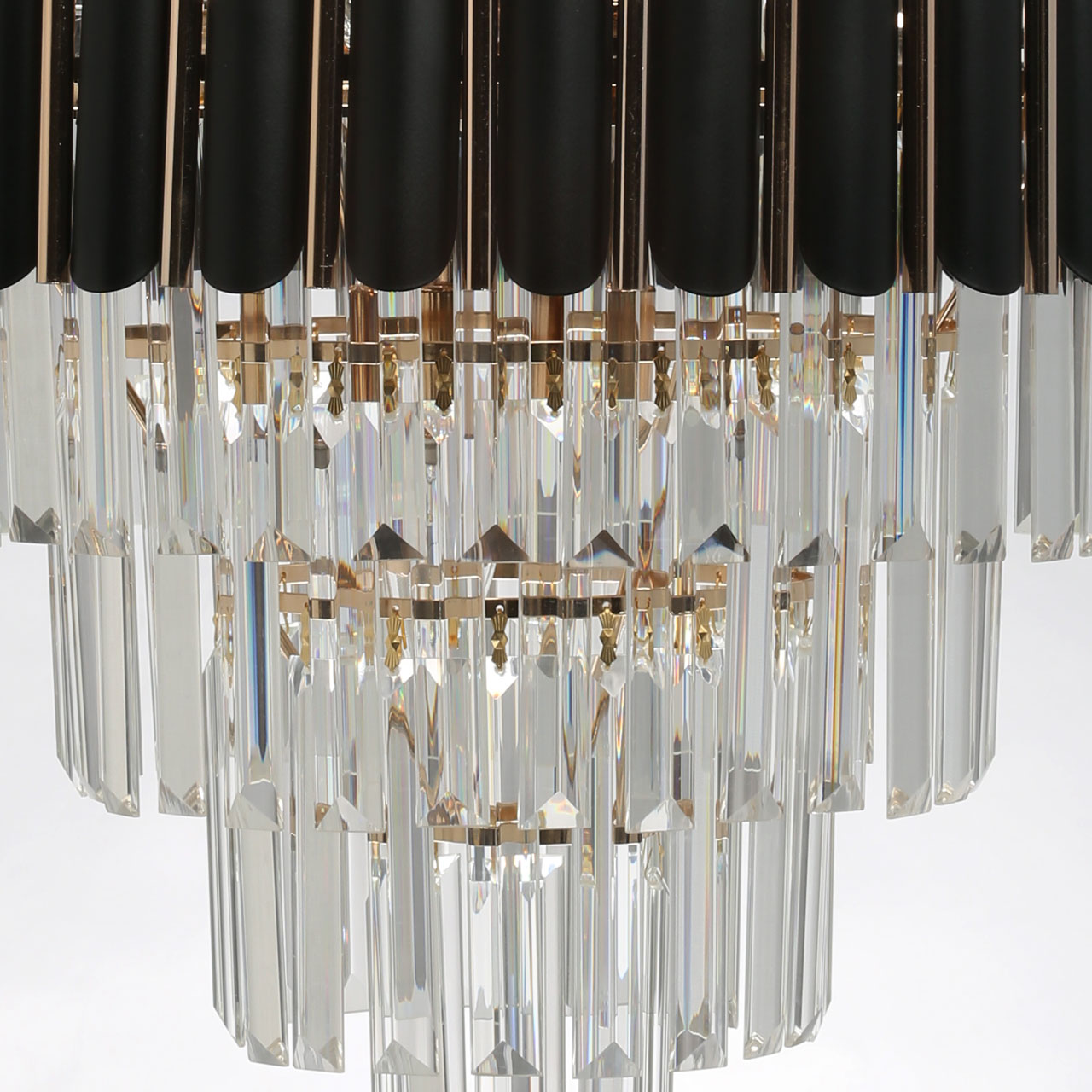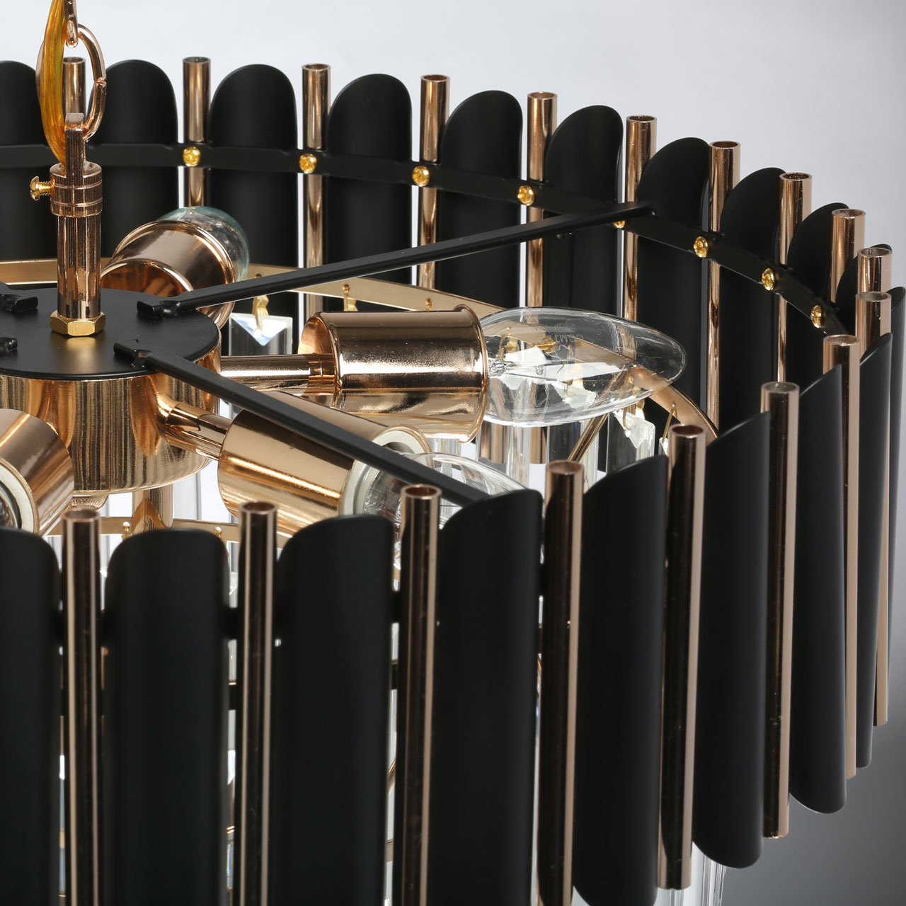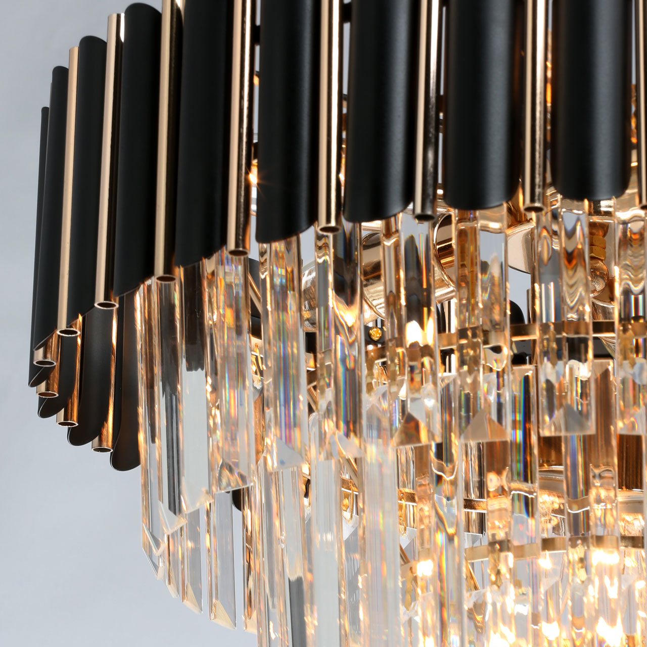 Металлическое основание светильника гальванизировано в цвет золота. Металлический плафон состоит из трубочек, окрашенных в черный цвет и гальванизированных в цвет золота. Светильник декорирован хрусталем прямоугольной формы