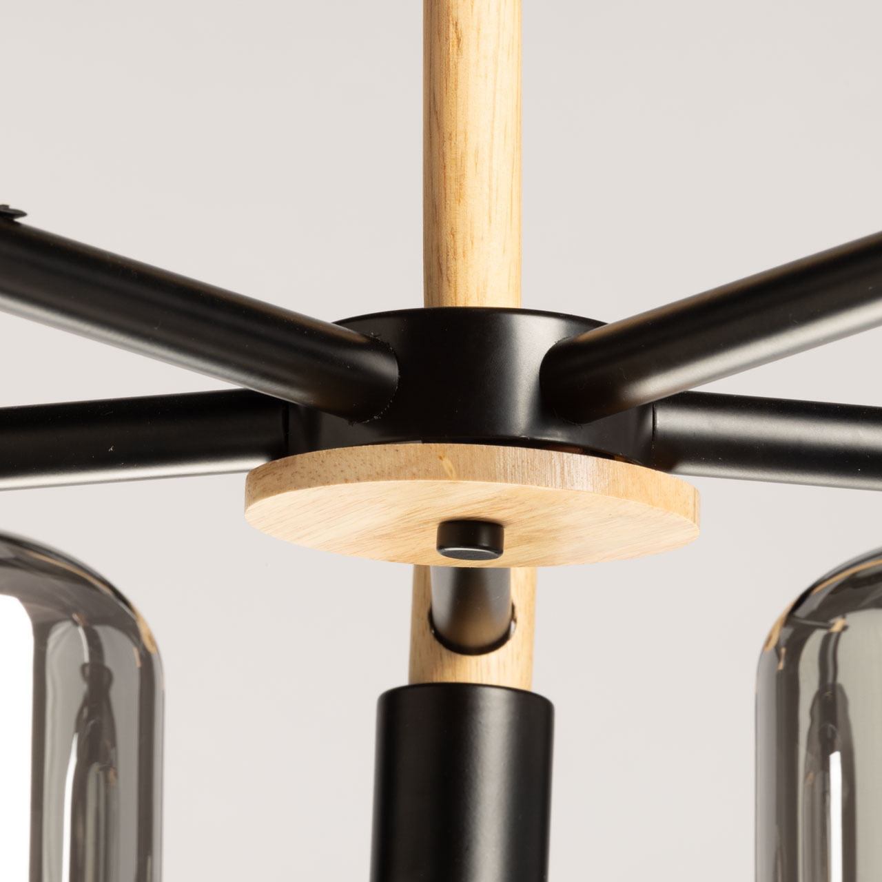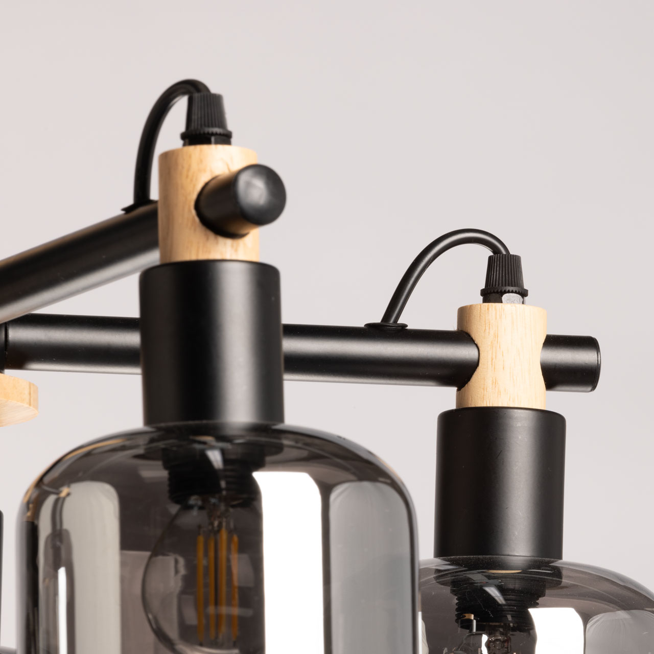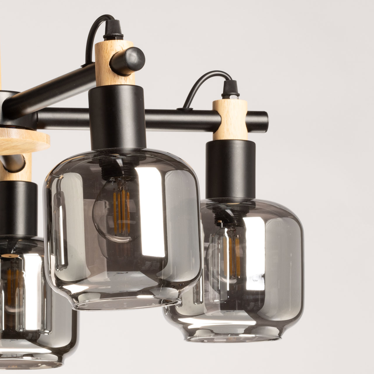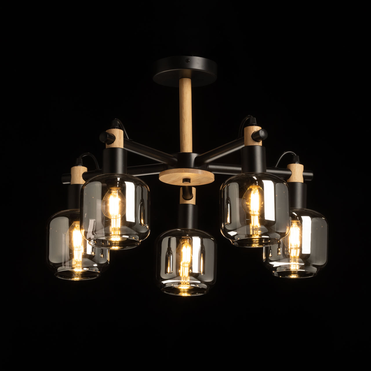 Металлическое основание потолочной люстры окрашено в черный цвет. Стеклянные плафоны отлиты в оригинальную форму и гальванизированы в дымчатый цвет. Потолочная люстра декорирована элементами из натурального светлого дерева.