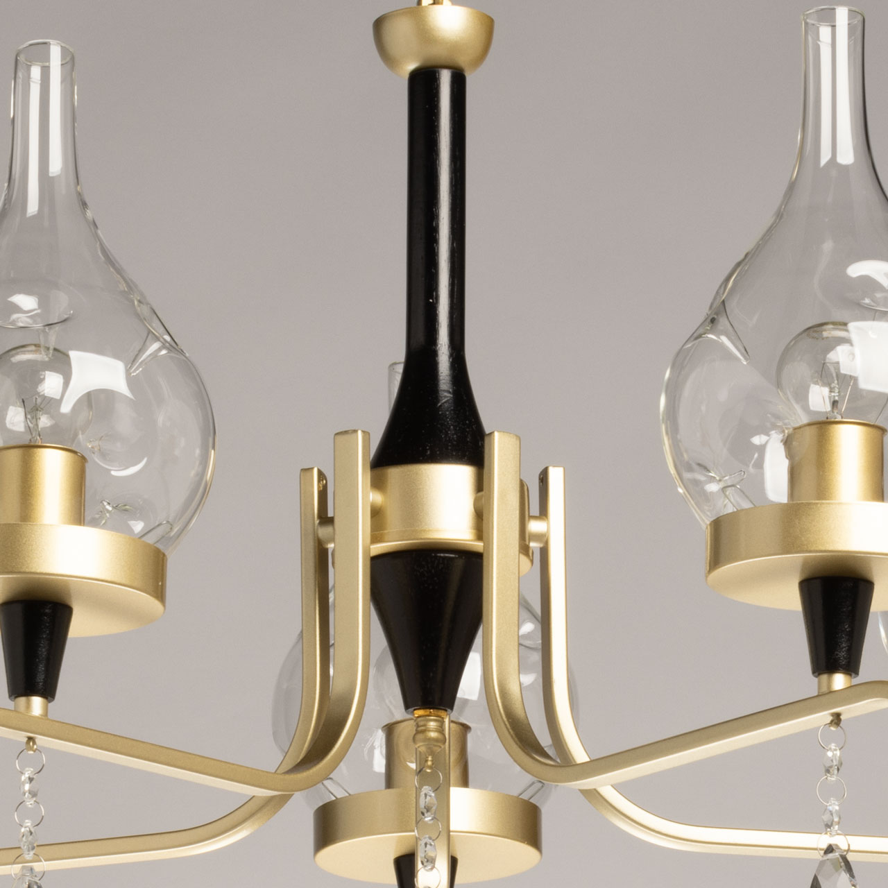 Металлическое основание подвесной люстры обработано по технологии порошкового окрашивания в цвет золота. Отдельные элементы основания окрашены в черный цвет. Люстра декорирована плафонами из прозрачного стекла оригинальной формы.