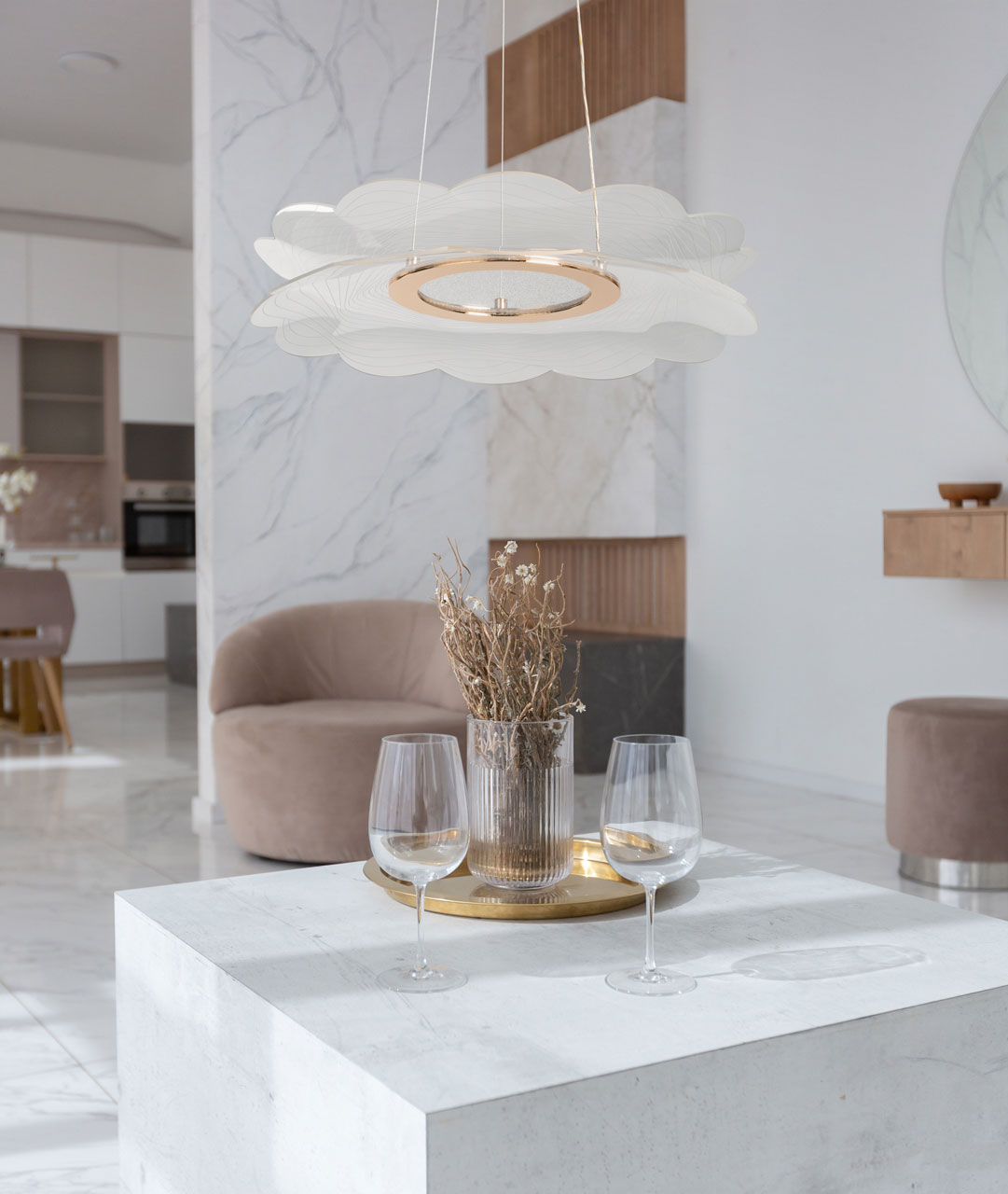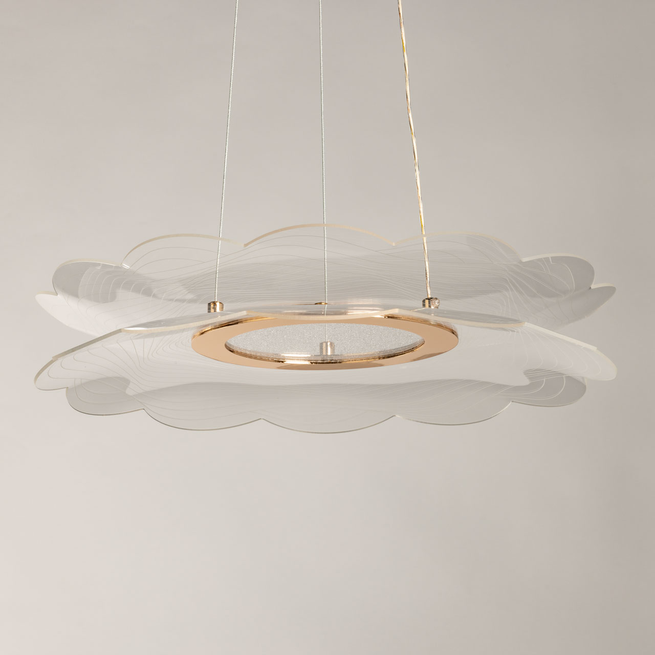 Металлическое основание подвесной люстры окрашено в черный цвет. Корпус плафона выполнен из сплава алюминия и гальванизирован в цвет золота. Люстра декорирована прозрачным акрилом с рисунком оригинальной формы.