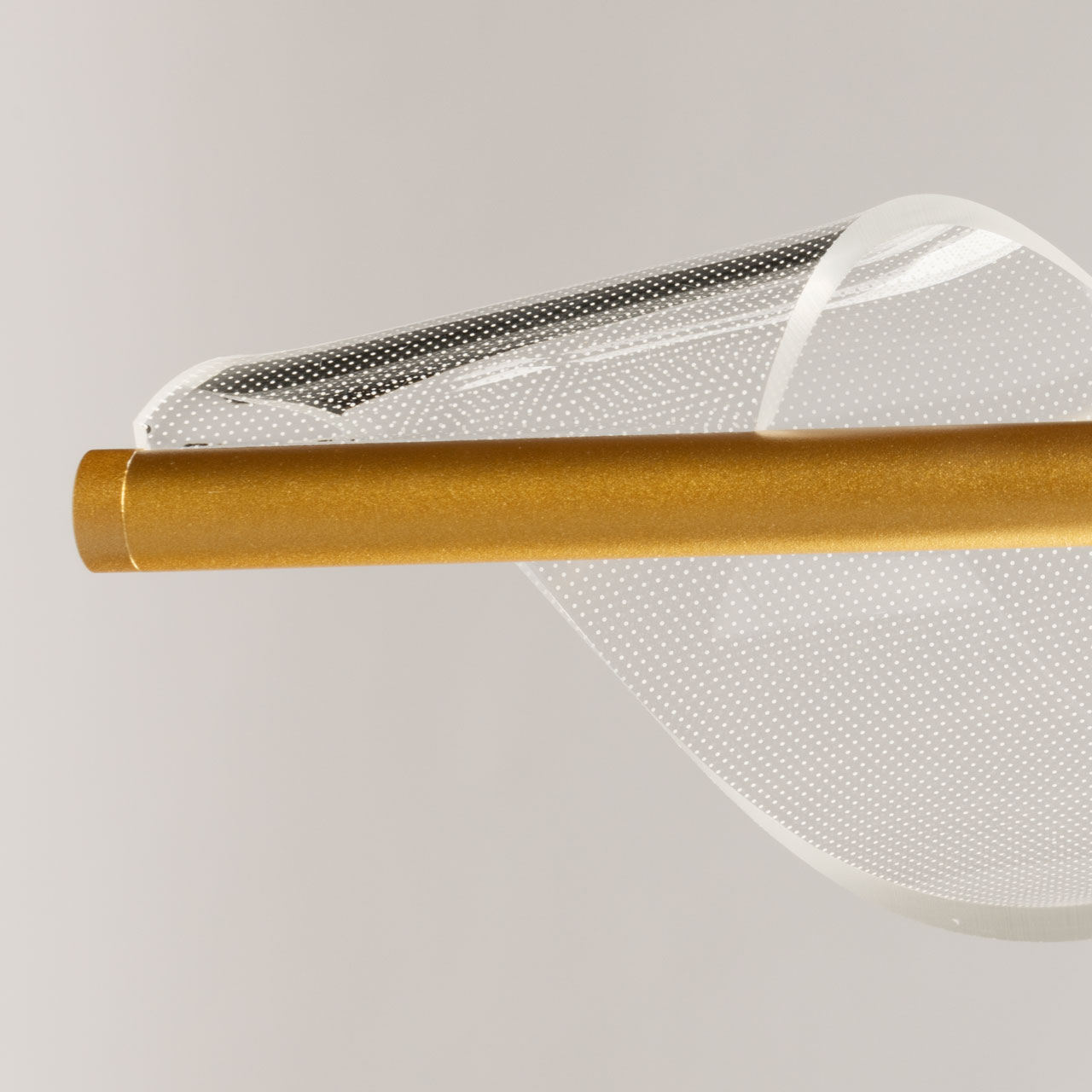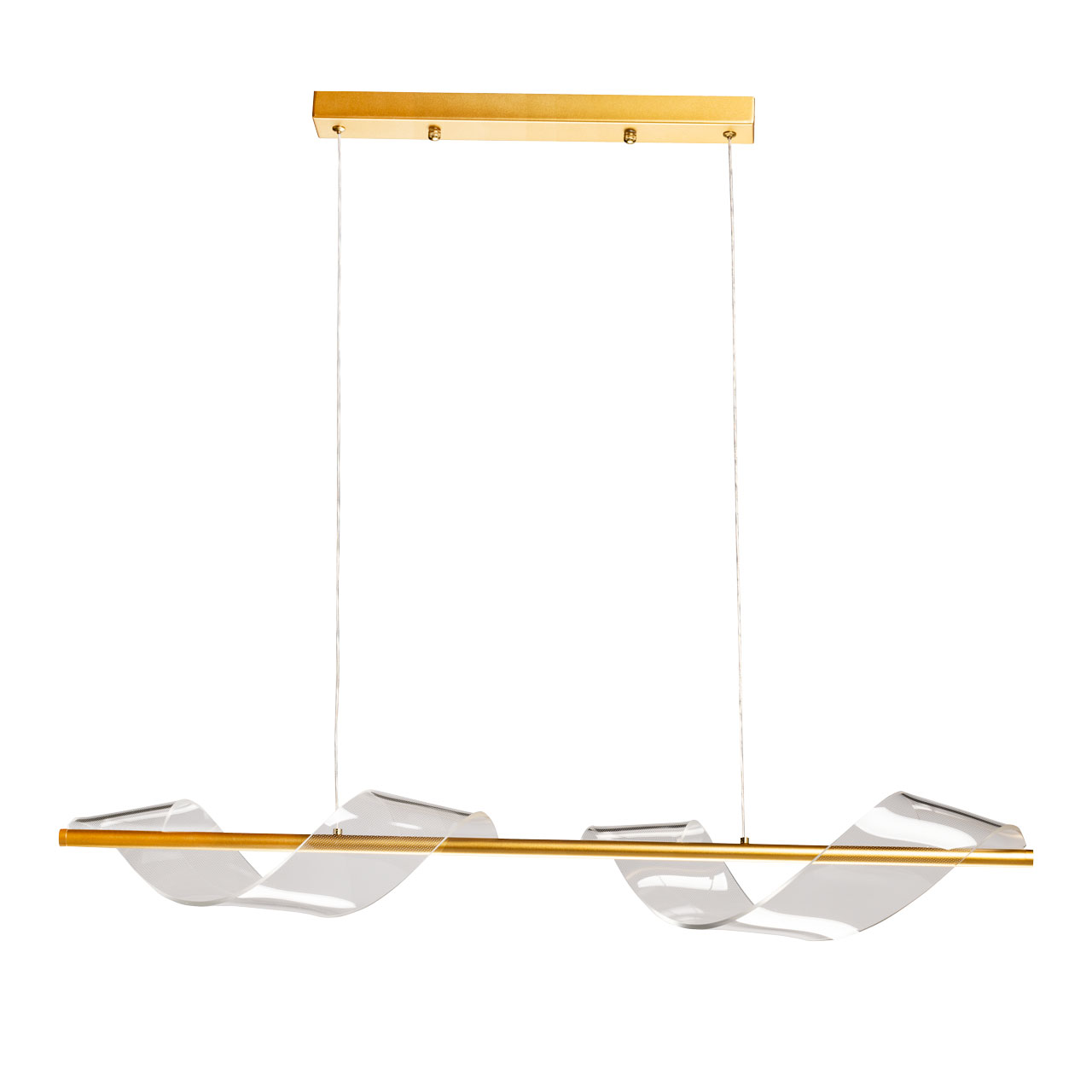 Металлическое основание подвесной люстры гальванизировано в цвет золота. Люстра декорирована прозрачным акрилом с точечным рисунком оригинальной формы с линейной фактурой.