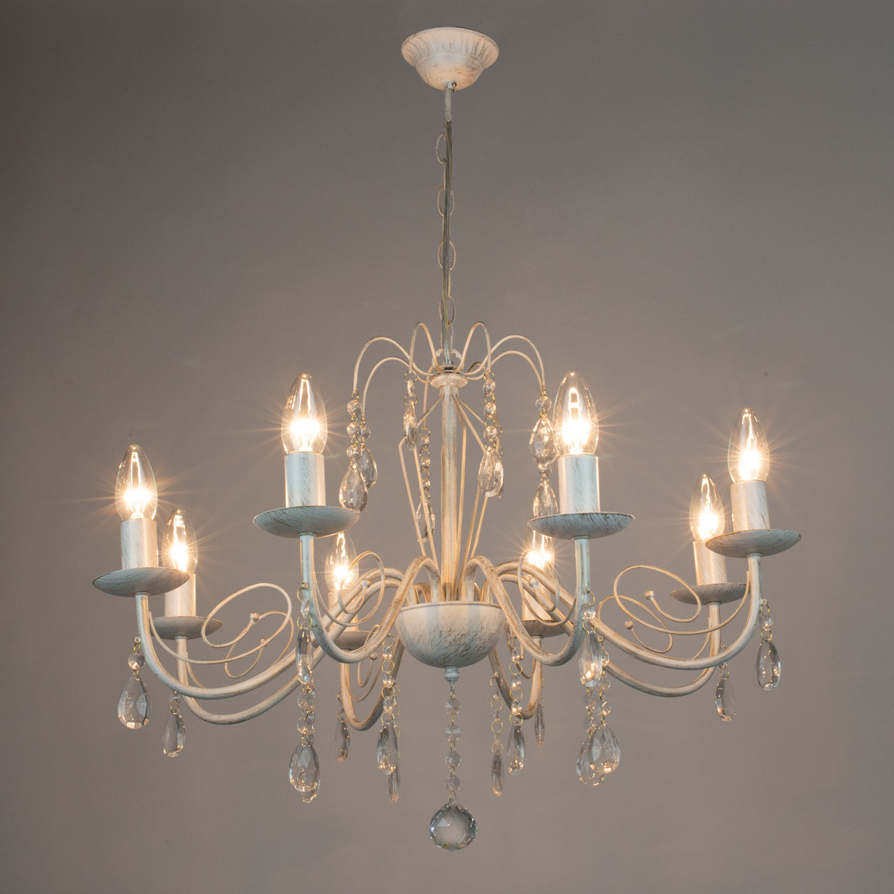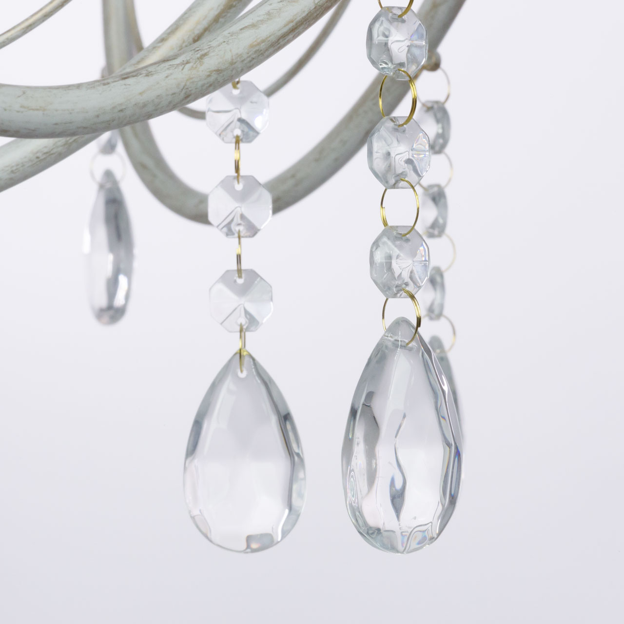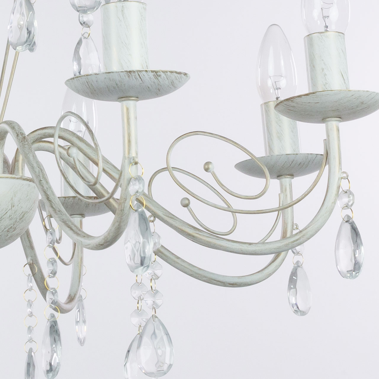 Металлическое основание подвесной люстры окрашено по технологии хай-лайт, где на основной слой белого цвета наносится штрихами декоративный слой золотого цвета. Люстра декорирована прозрачным хрустальным стеклом миндалевидной формы.