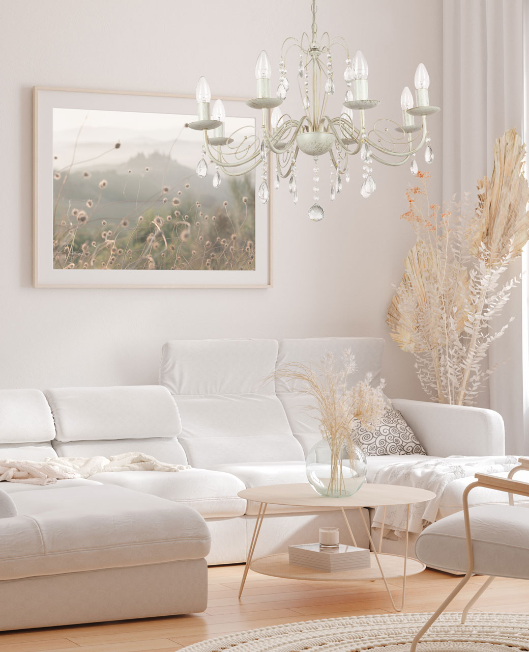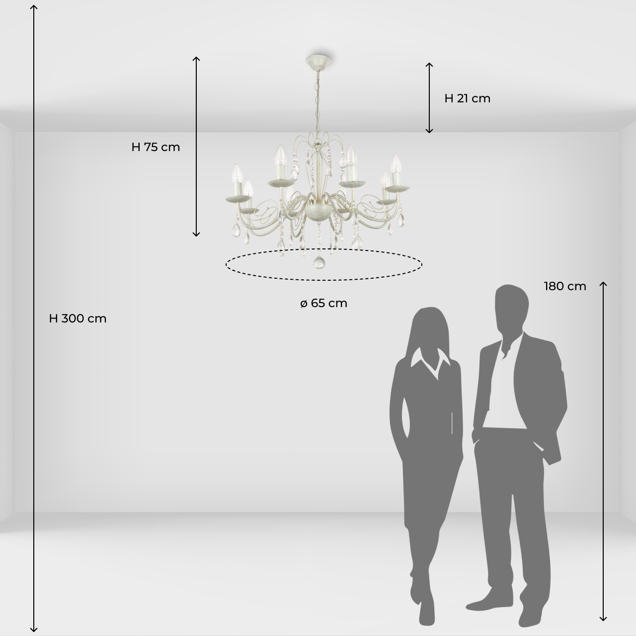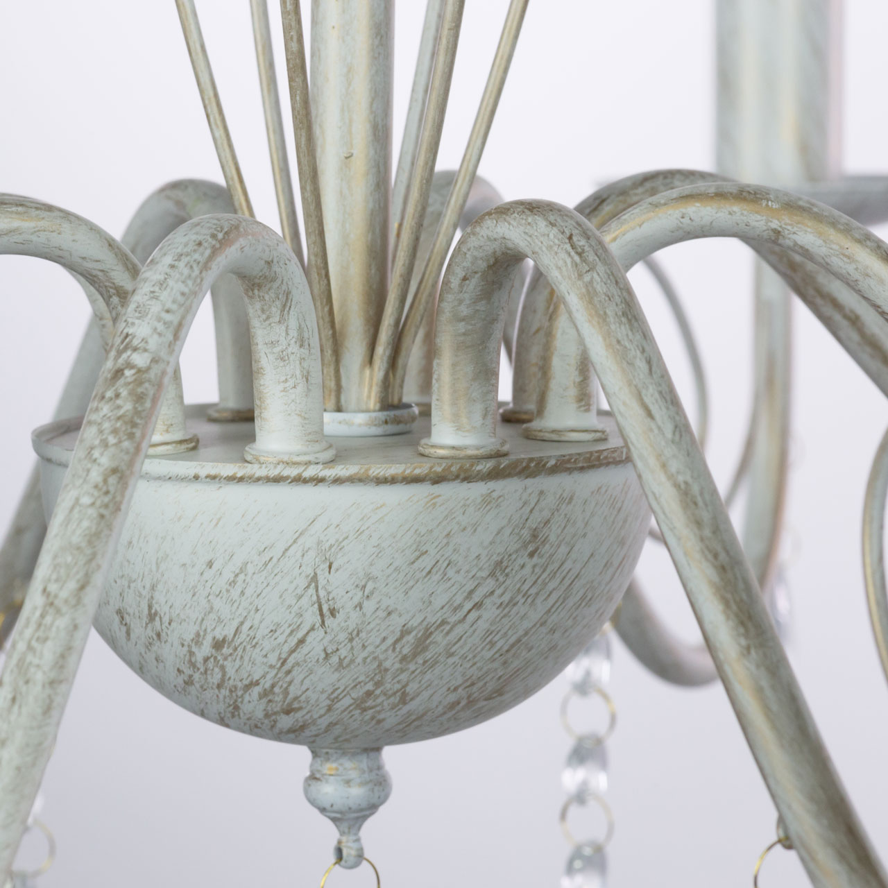 Металлическое основание подвесной люстры окрашено по технологии хай-лайт, где на основной слой белого цвета наносится штрихами декоративный слой золотого цвета. Люстра декорирована прозрачным хрустальным стеклом миндалевидной формы.