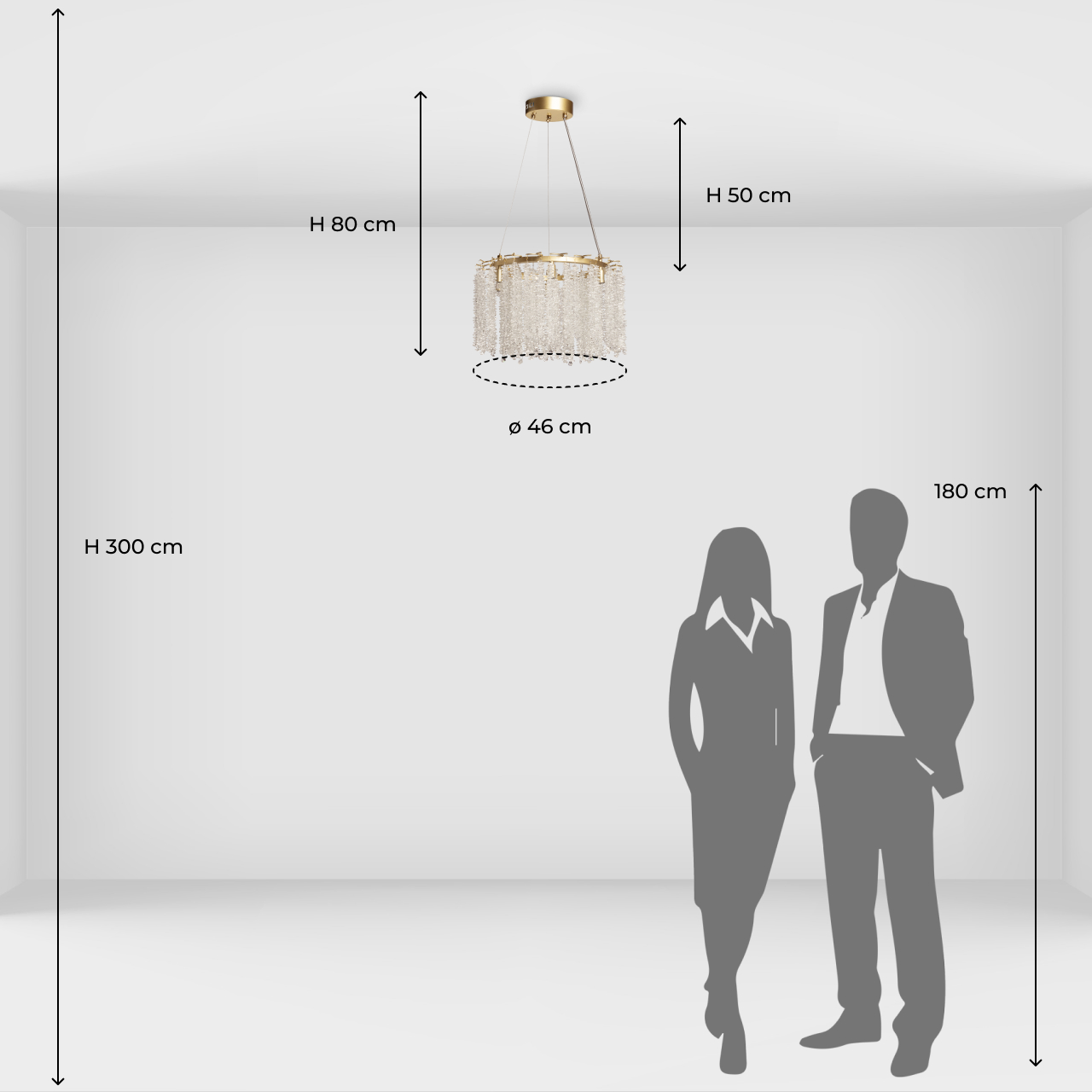 Металлическое основание подвесной люстры гальванизировано в цвет золота. Люстра декорирована прозрачным хрусталем.