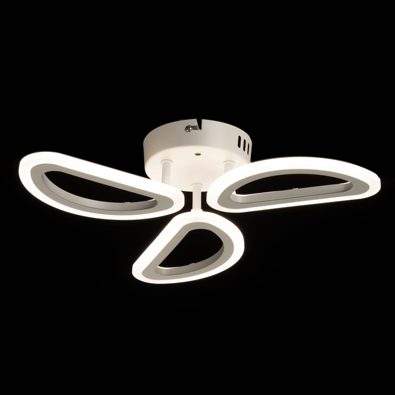 Металлическое основание потолочной люстры окрашено в белый цвет. Корпус плафонов выполнен из сплава алюминия с цинком и окрашен в цвет основания. Светодиодные источники света закрыты белым матовым акрилом.