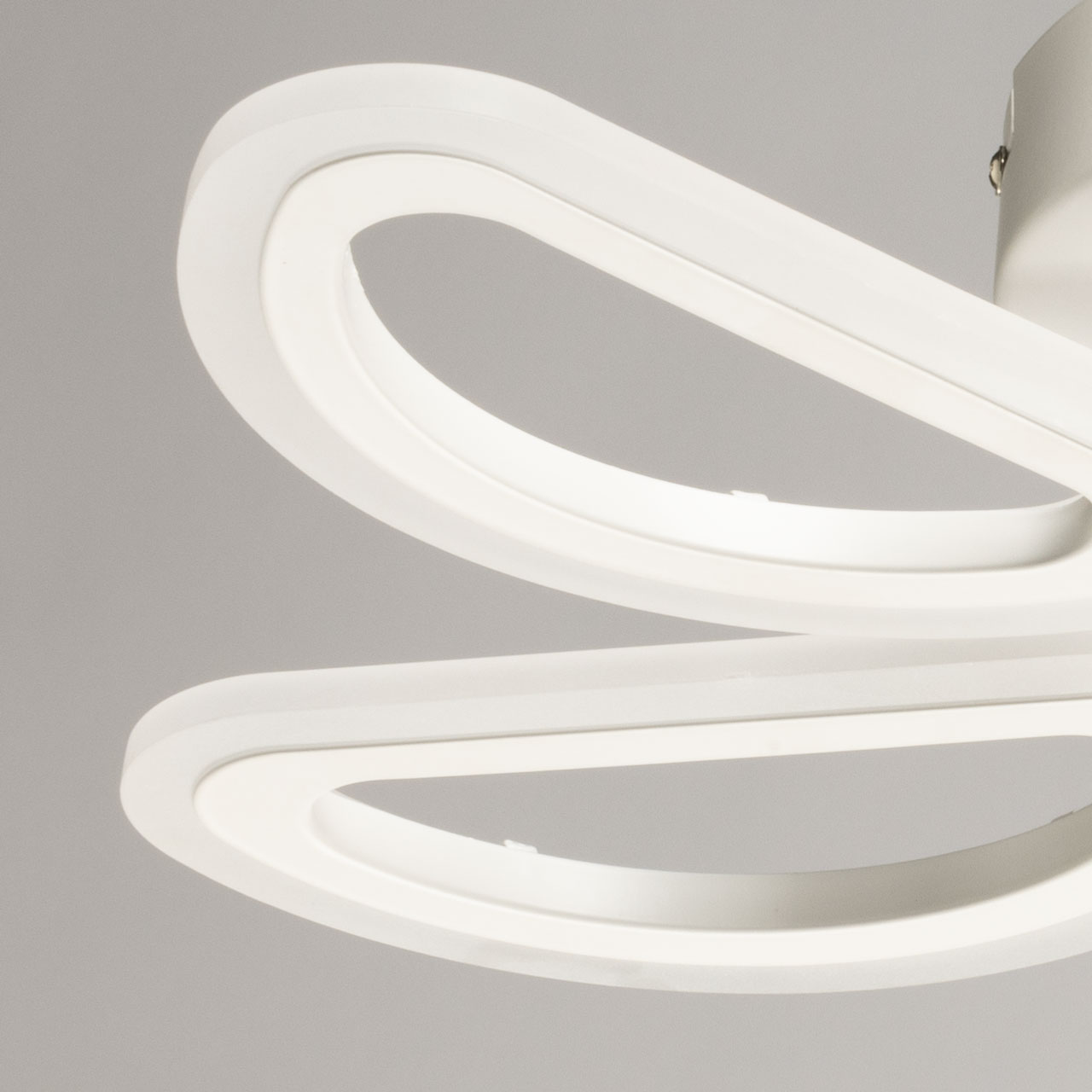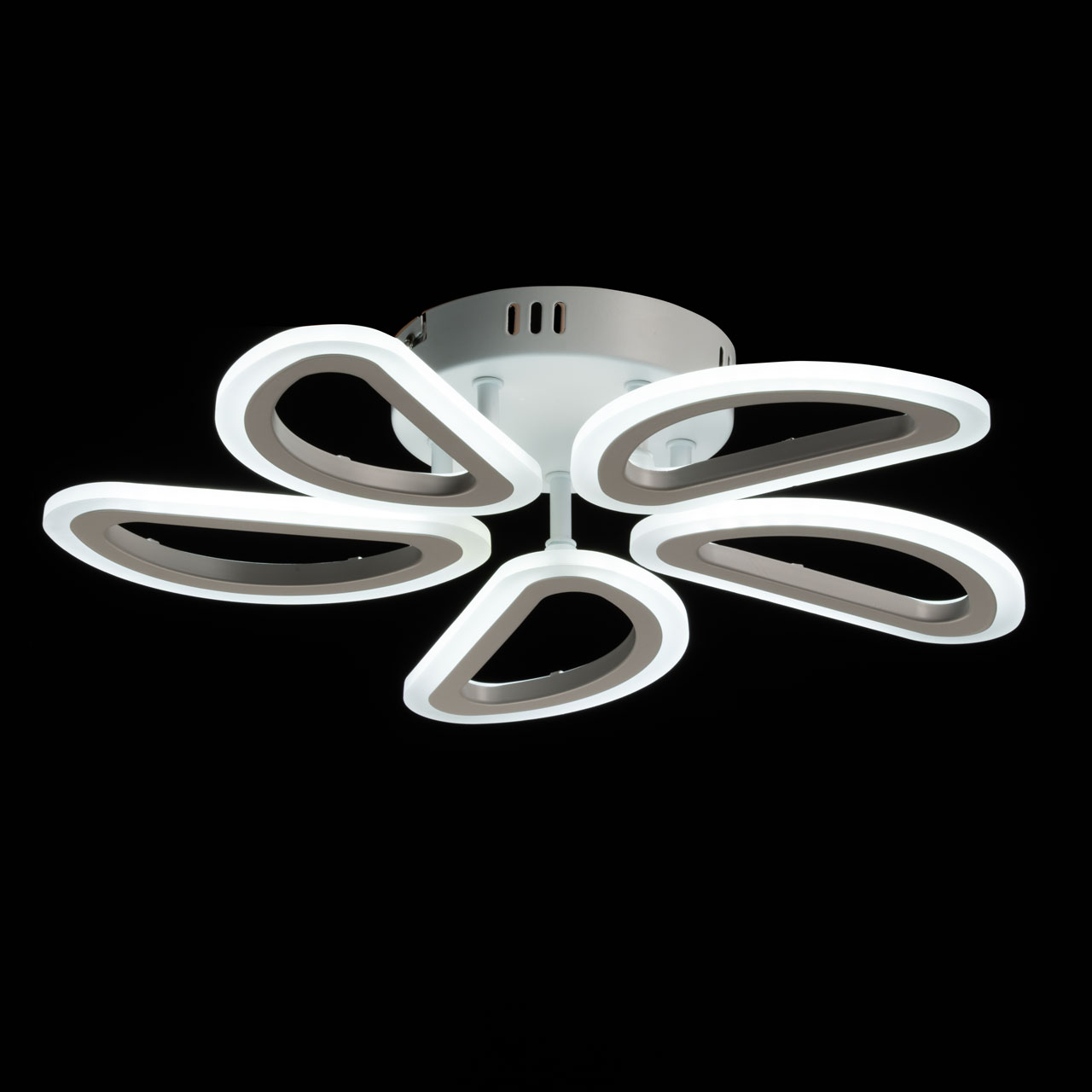 Металлическое основание потолочной люстры окрашено в белый цвет. Корпус плафонов выполнен из сплава алюминия с цинком и окрашен в цвет основания. Светодиодные источники света закрыты белым матовым акрилом.
