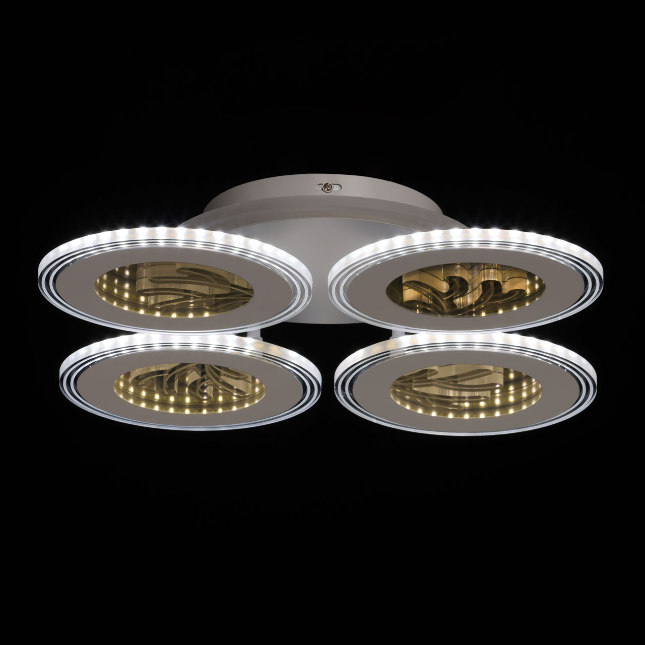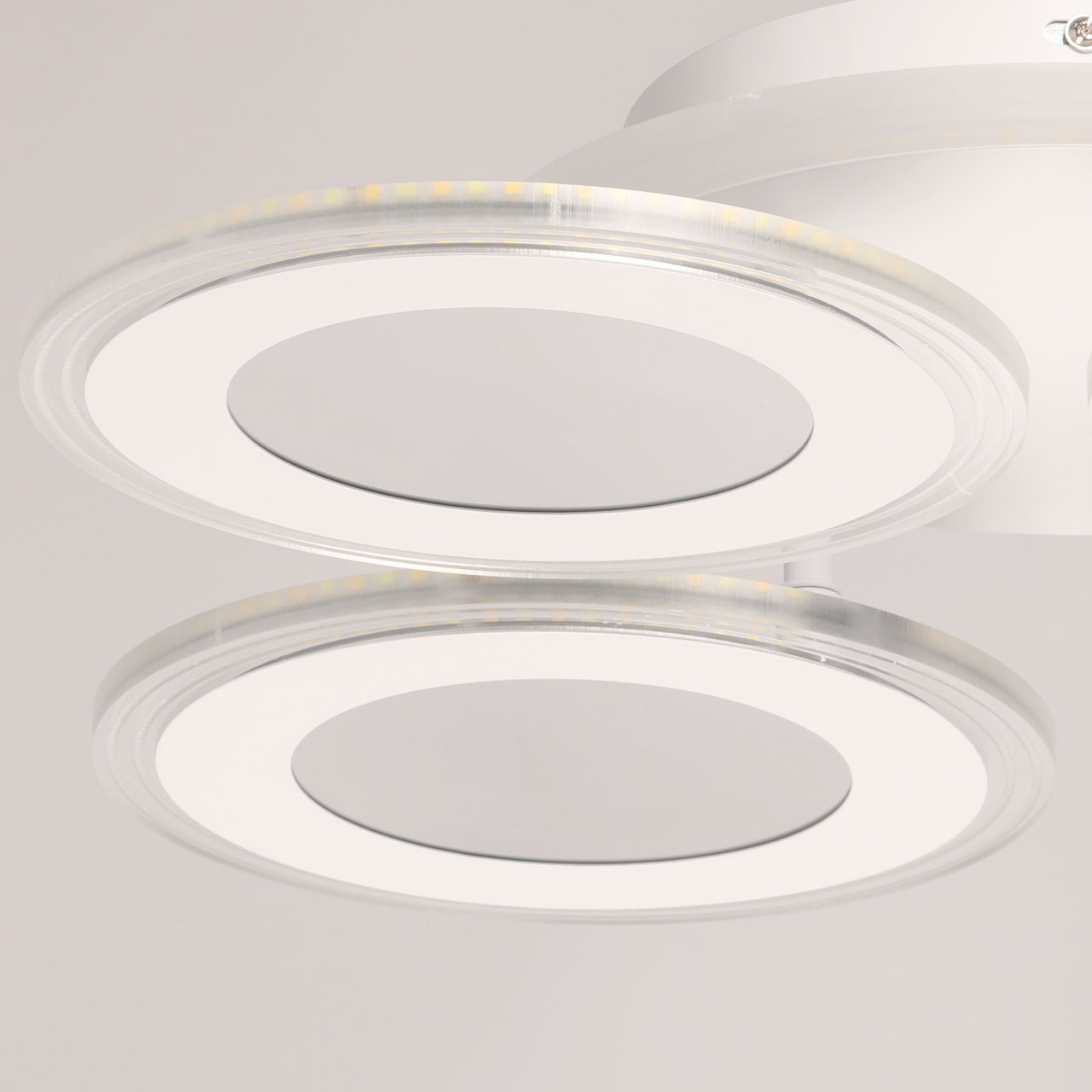Металлическое основание потолочной люстры окрашено в белый цвет. Корпус плафонов выполнен из сплава алюминия с цинком и окрашен в цвет основания. Светодиодные источники света закрыты белым матовым акрилом. Люстра декорирована прозрачным акрилом с 3D-эффектом.