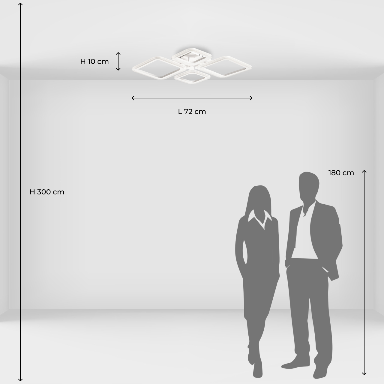Металлическое основание потолочной люстры окрашено в белый цвет. Корпус плафона выполнен из сплава алюминия с цинком и окрашен в цвет основания. Светодиодный источник света закрыт полупрозрачным акрилом.