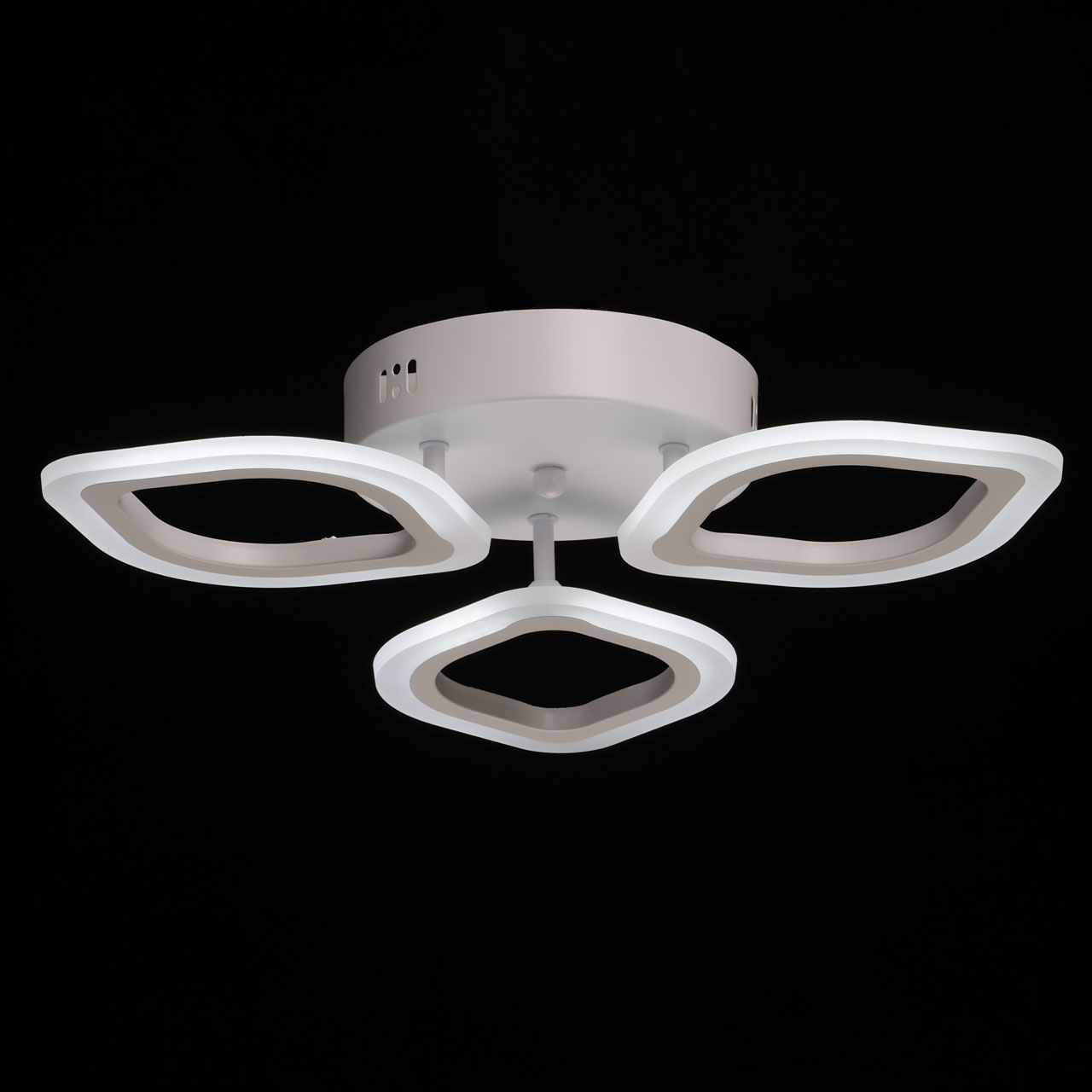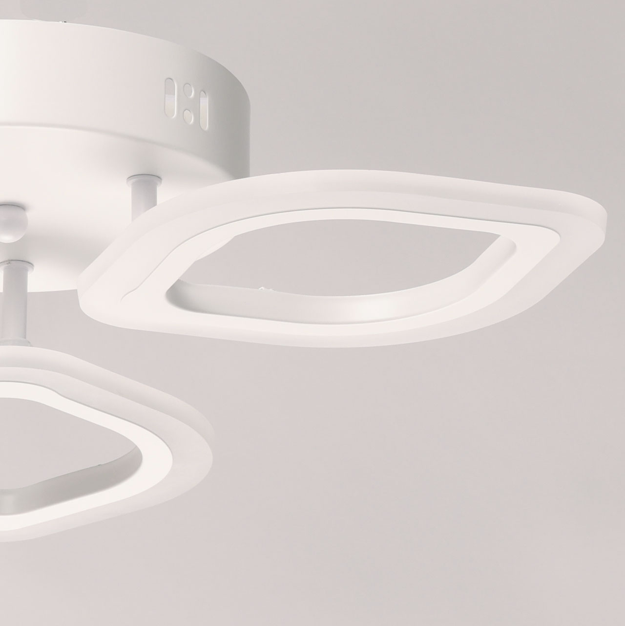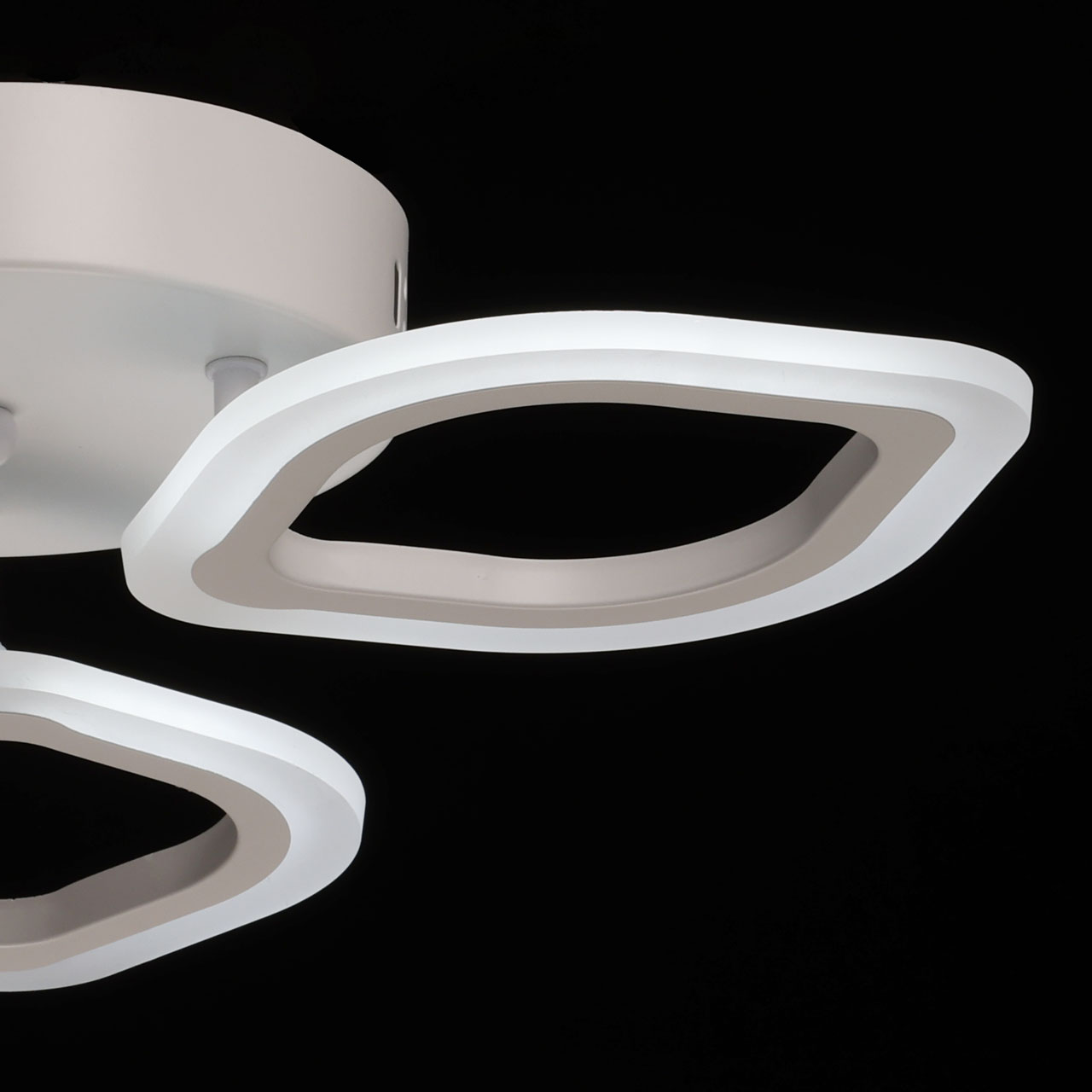 Металлическое основание потолочной люстры окрашено в белый цвет. Корпус плафона выполнен из сплава алюминия с цинком и окрашен в цвет основания. Светодиодные источники света закрыты белым матовым акрилом. Светильник приходит в состоянии частичной сборки в компактной упаковке: вся электрика подсоединена, достаточно закрепить плафоны на корпусе.