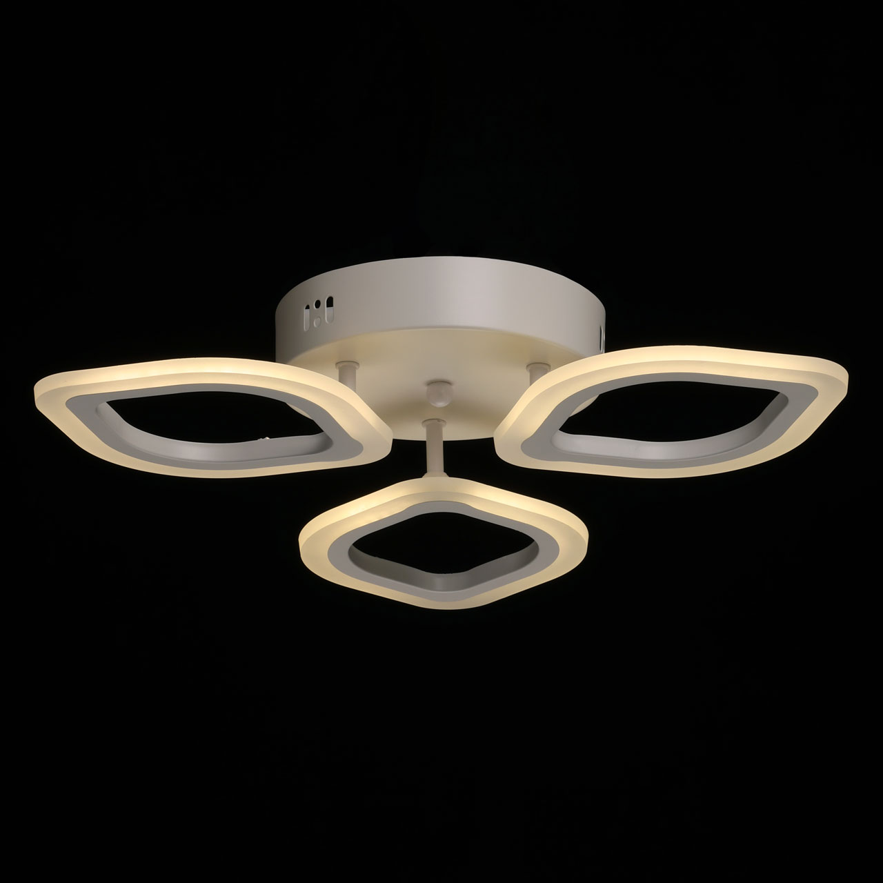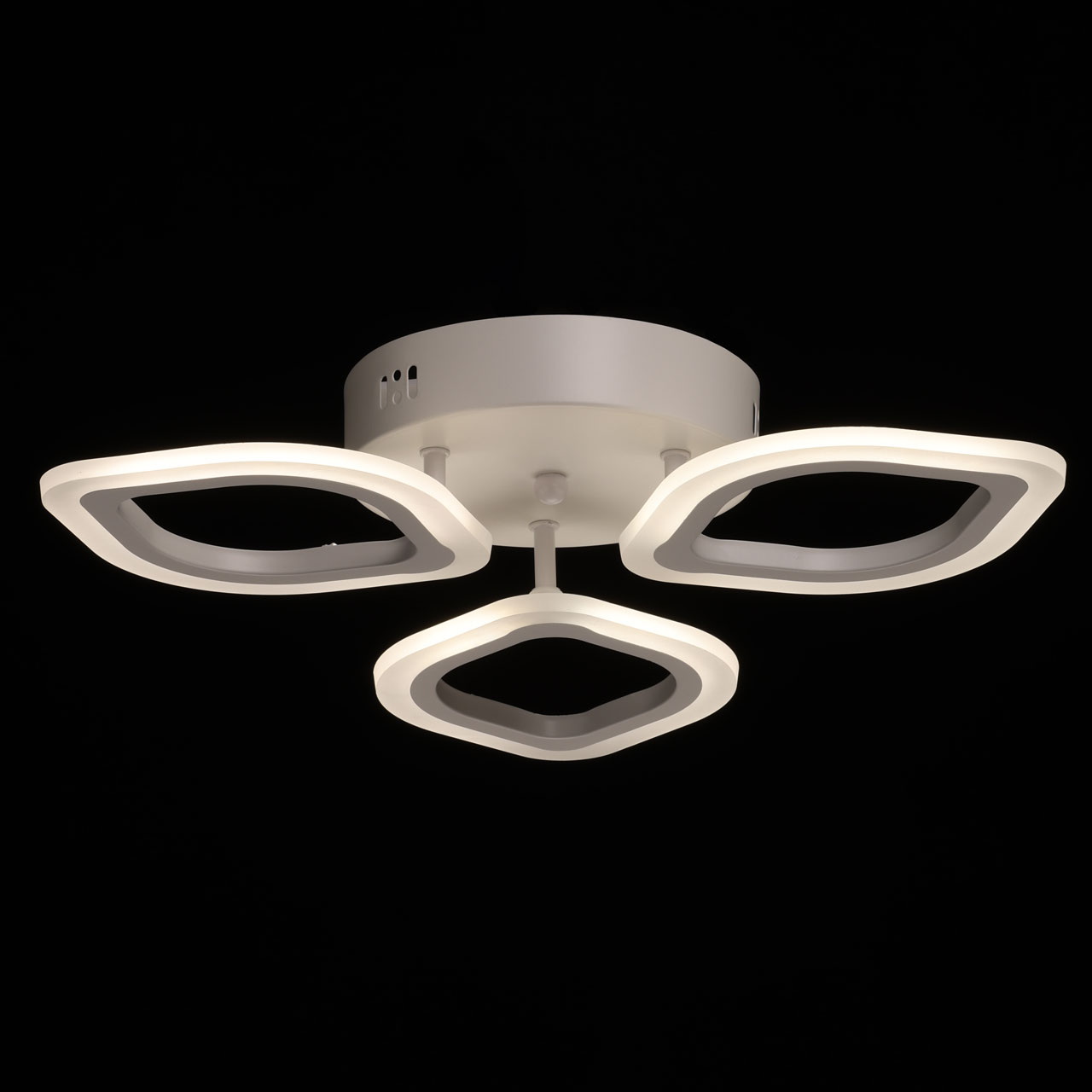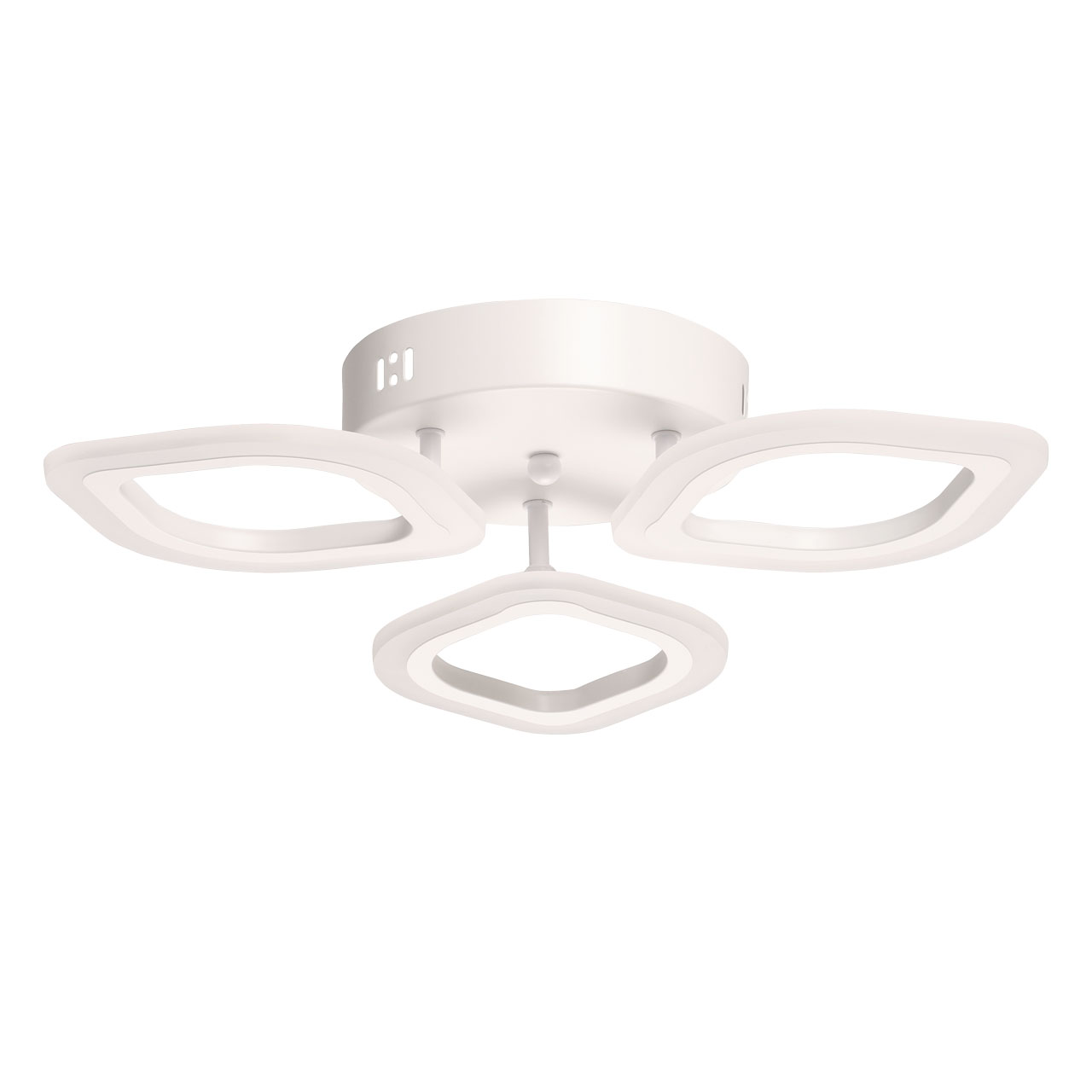 Металлическое основание потолочной люстры окрашено в белый цвет. Корпус плафона выполнен из сплава алюминия с цинком и окрашен в цвет основания. Светодиодные источники света закрыты белым матовым акрилом. Светильник приходит в состоянии частичной сборки в компактной упаковке: вся электрика подсоединена, достаточно закрепить плафоны на корпусе.
