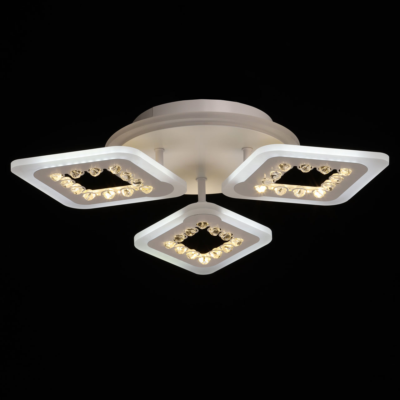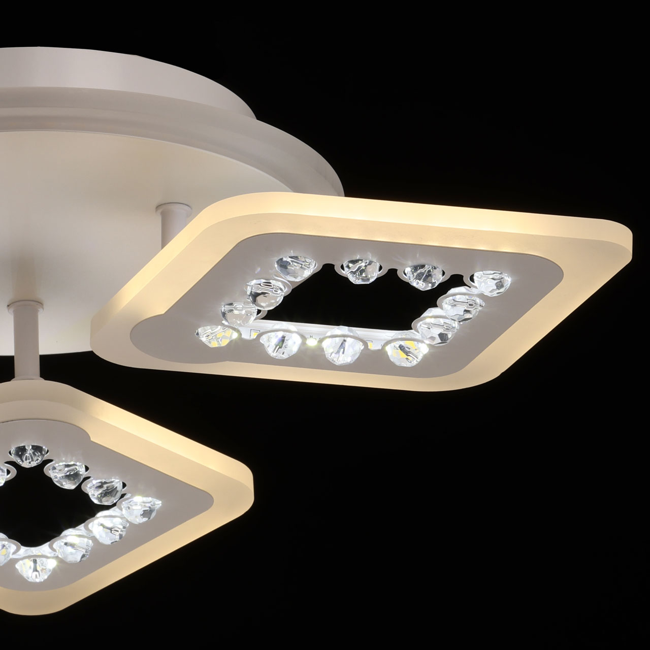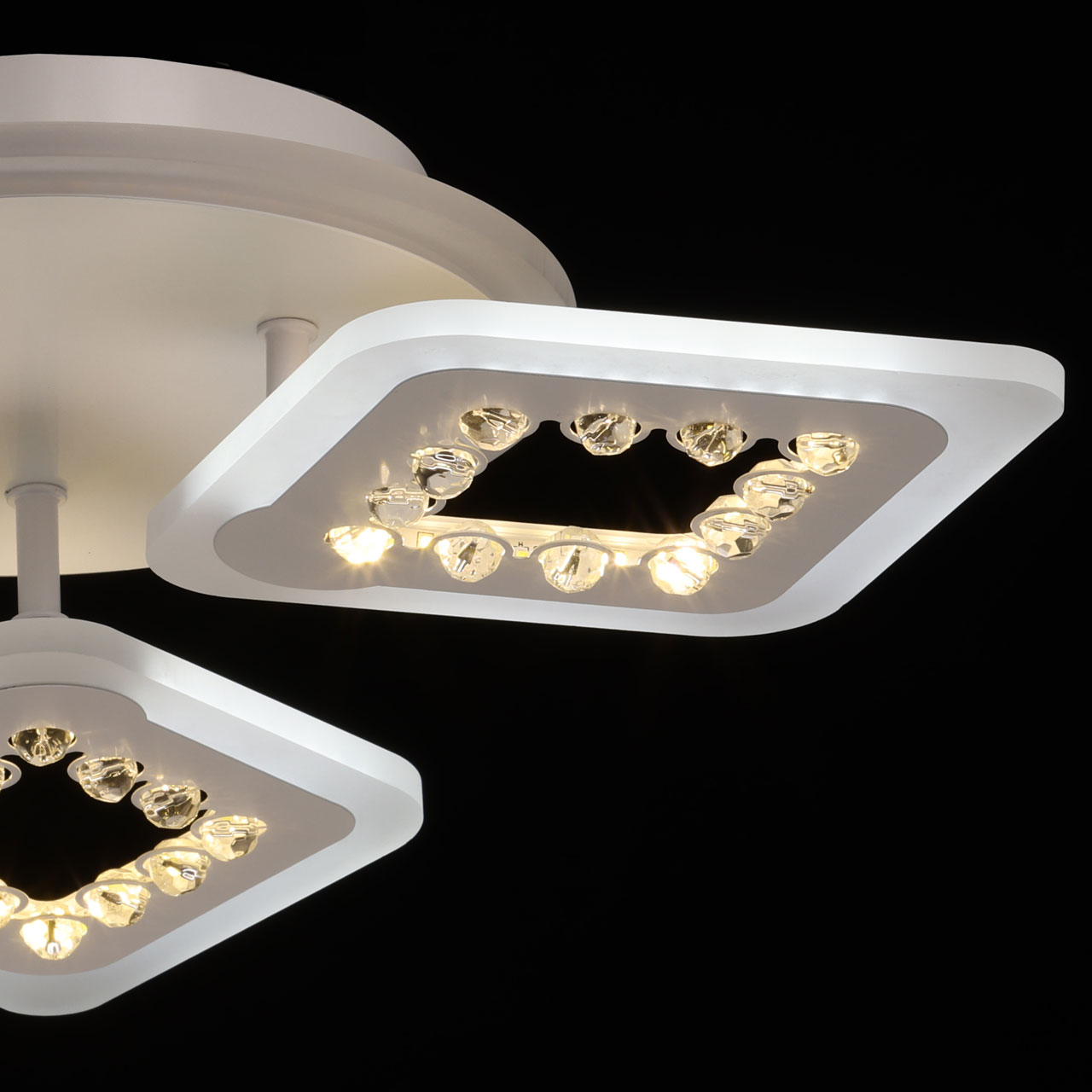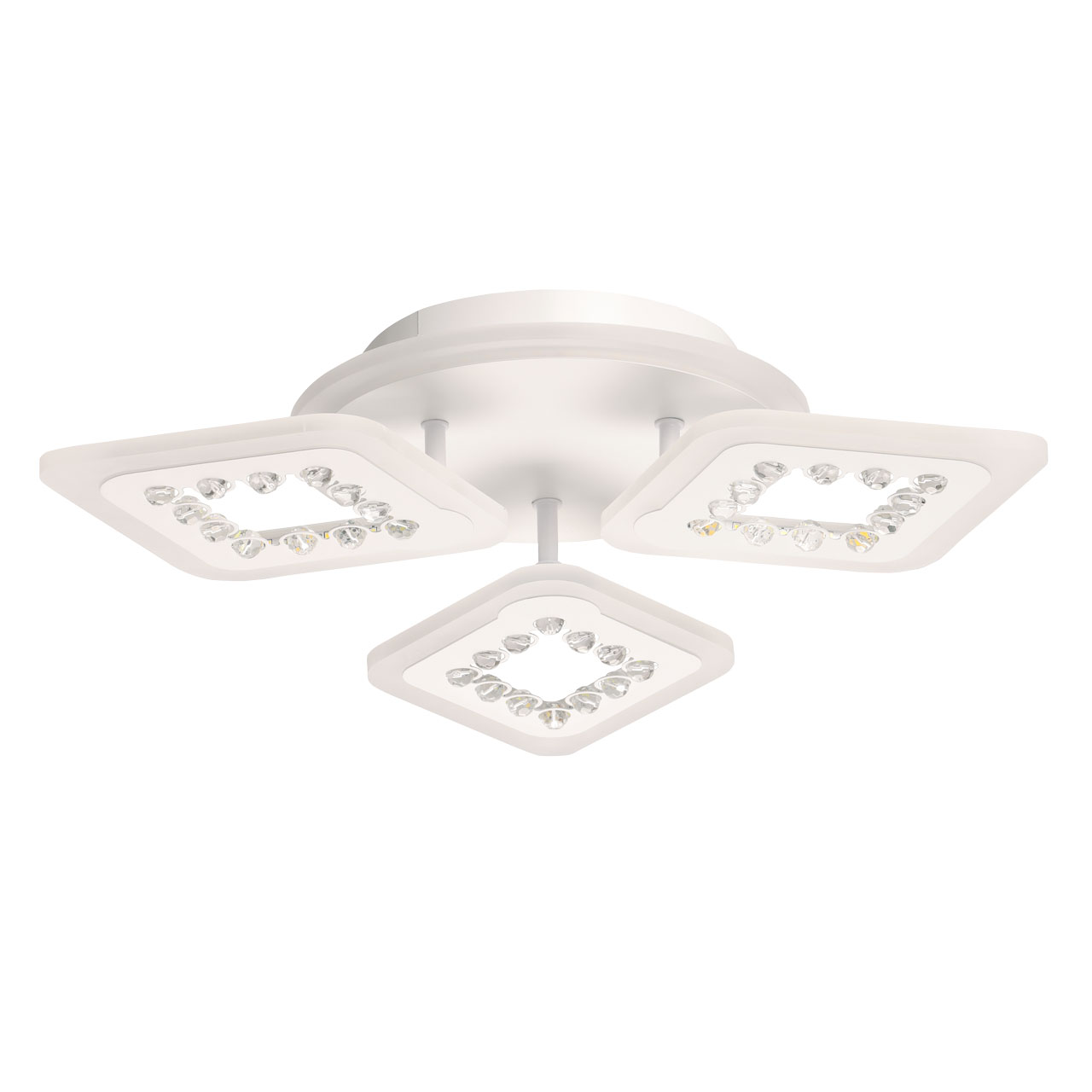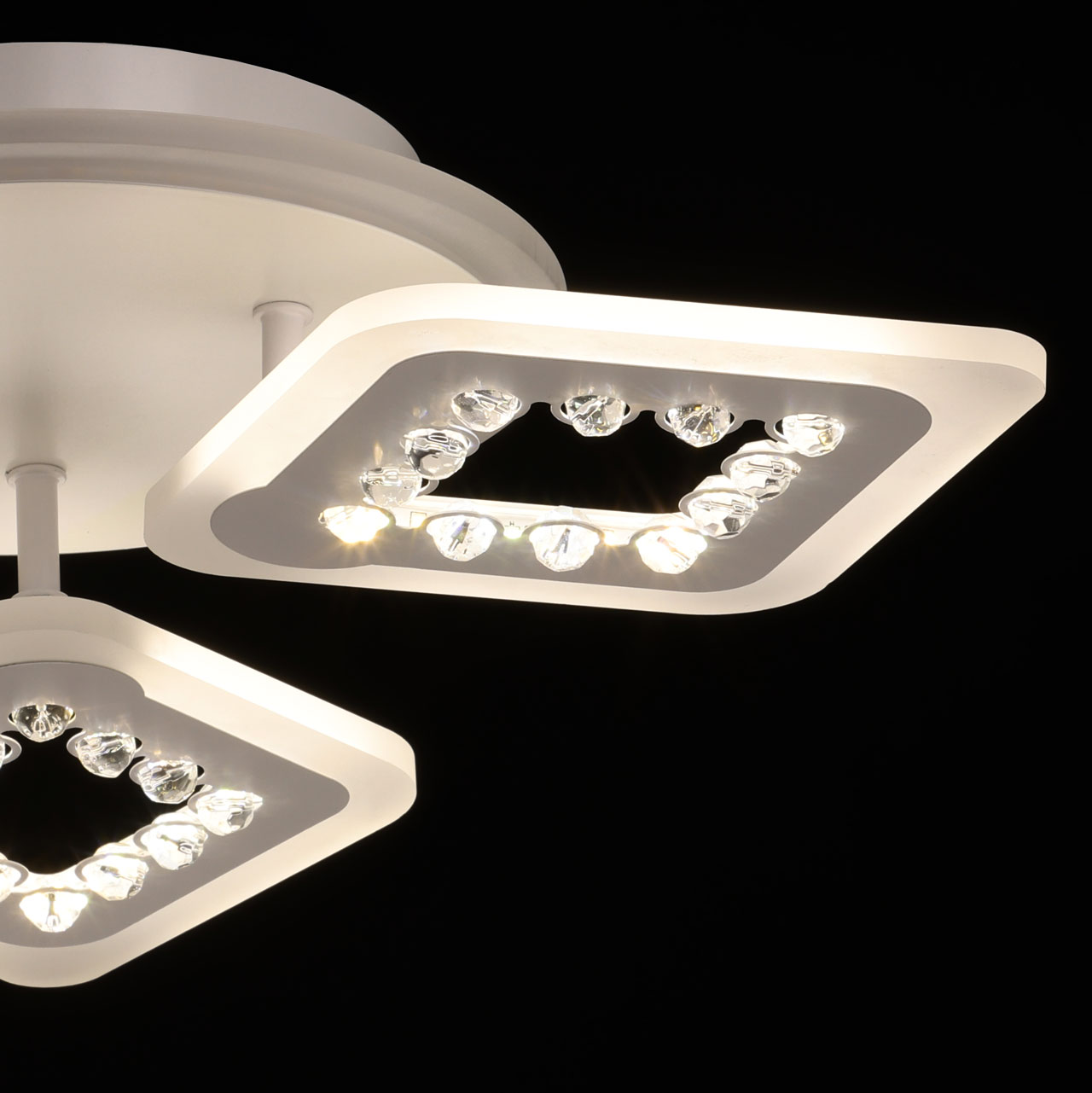 Металлическое основание потолочной люстры окрашено в белый цвет. Корпус плафона выполнен из сплава алюминия с цинком и окрашен в цвет основания. Светодиодные источники света закрыты белым матовым акрилом. Плафоны декорированы бусинами из прозрачного акрила. Дополнительно, в светильнике предусмотрена подсветка потолочной чаши. Светильник приходит в состоянии частичной сборки в компактной упаковке: вся электрика подсоединена, достаточно закрепить плафоны на корпусе.