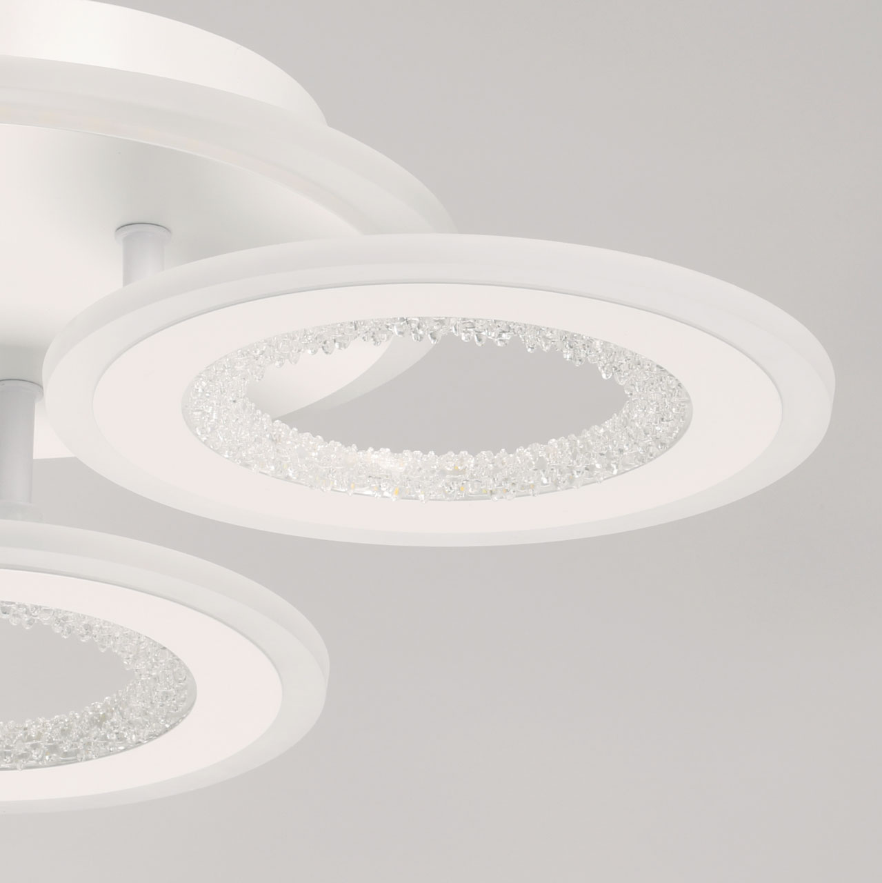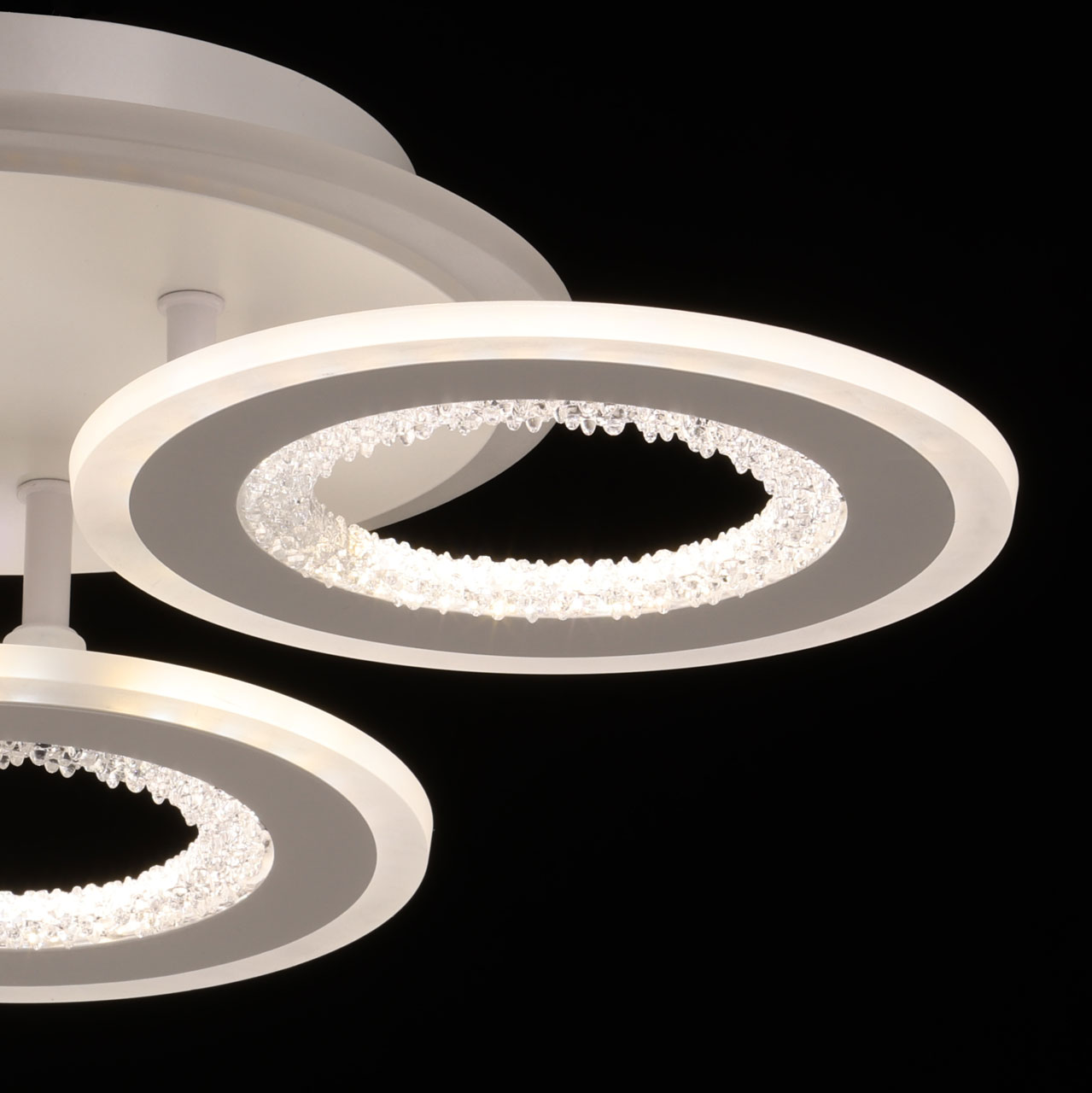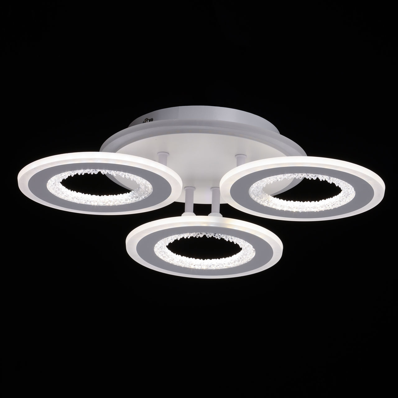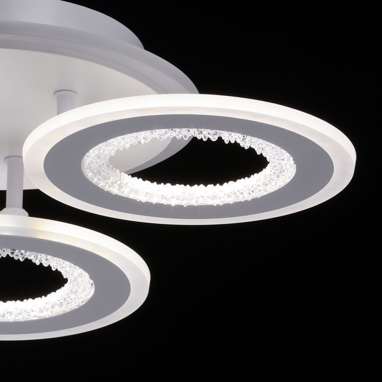 Металлическое основание потолочной люстры окрашено в белый цвет. Корпус плафона выполнен из сплава алюминия с цинком и окрашен в цвет основания. Светодиодные источники света закрыты белым матовым акрилом. Плафоны декорированы прозрачным фактурным акрилом. Дополнительно, в светильнике предусмотрена подсветка потолочной чаши. Светильник приходит в состоянии частичной сборки в компактной упаковке: вся электрика подсоединена, достаточно закрепить плафоны на корпусе.