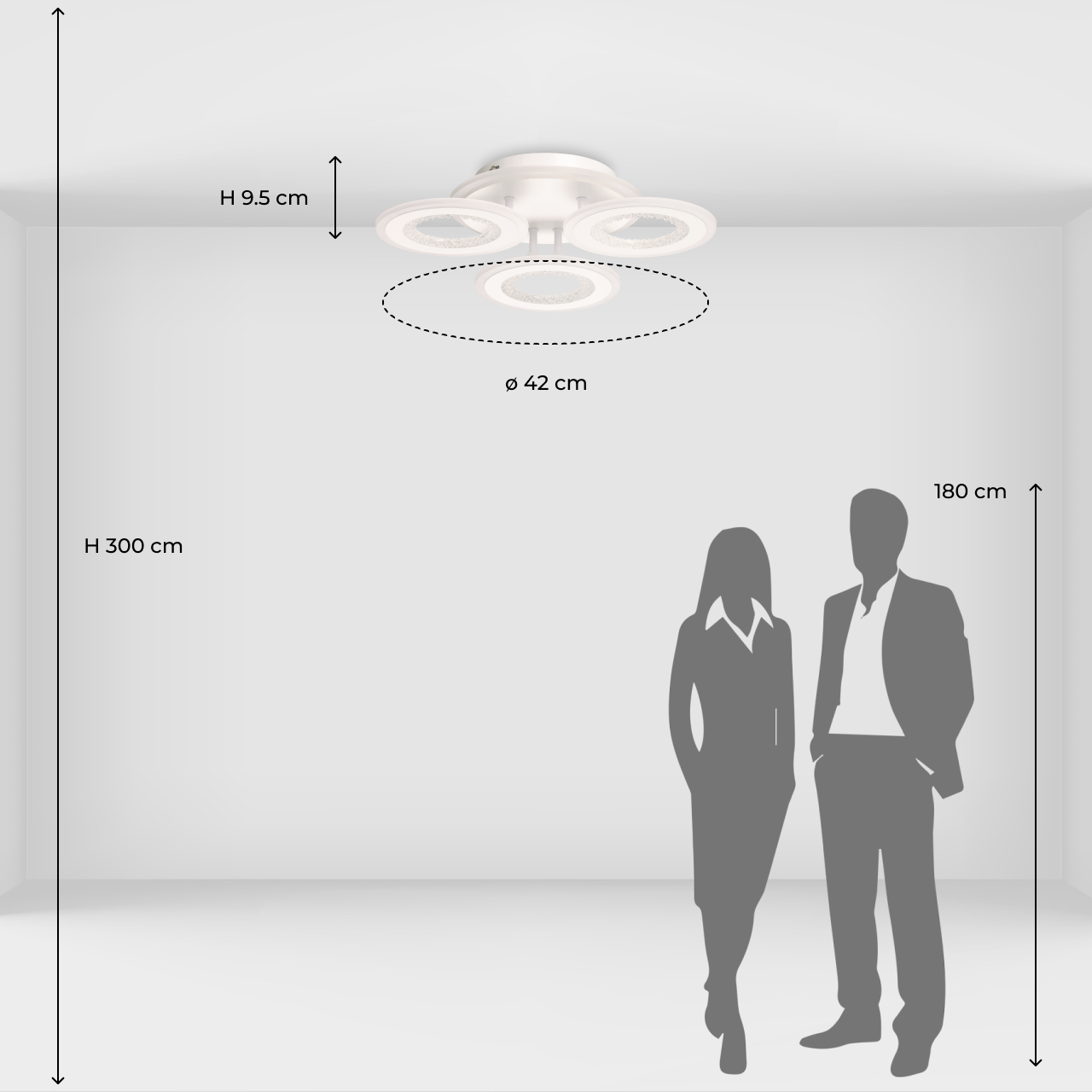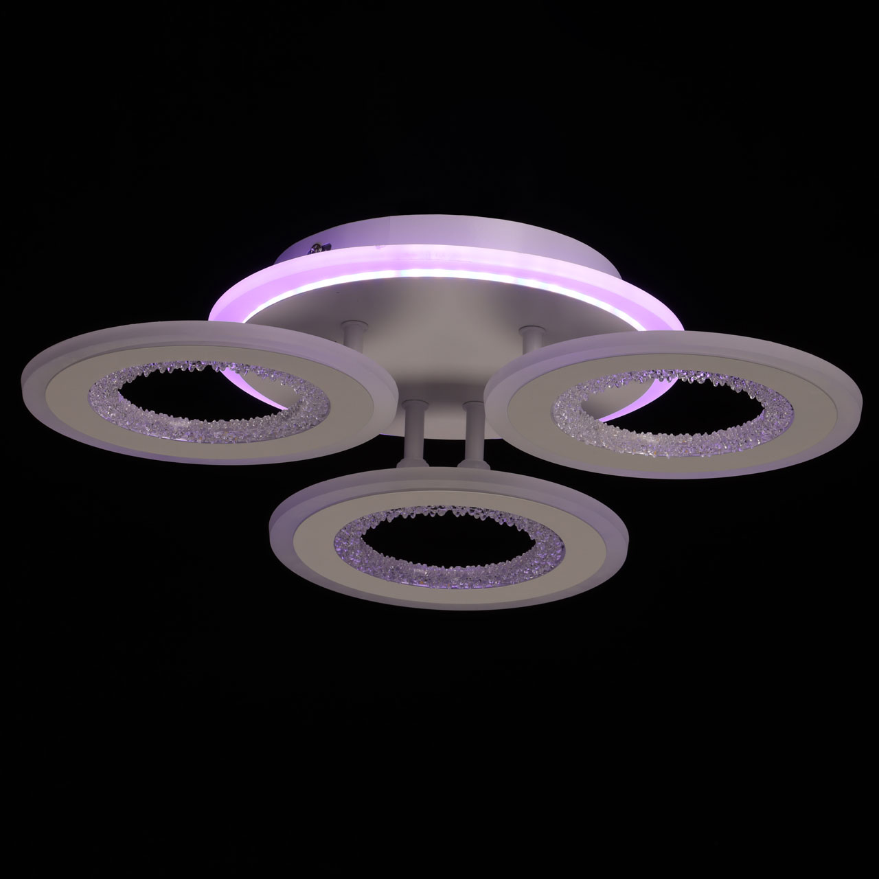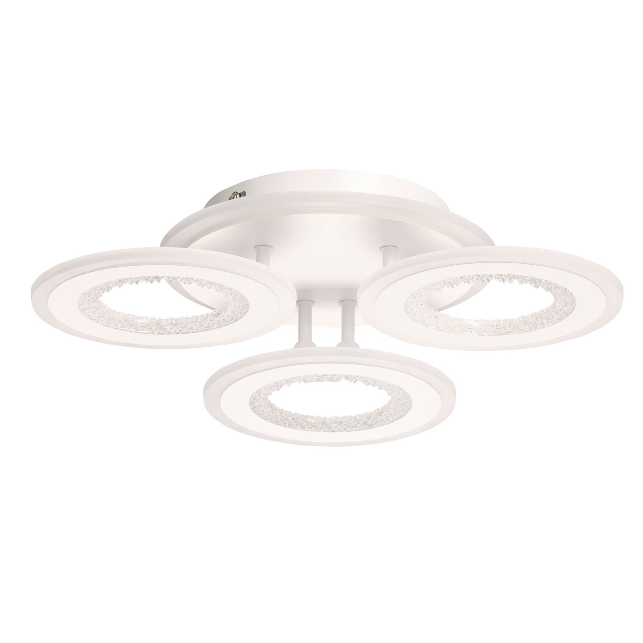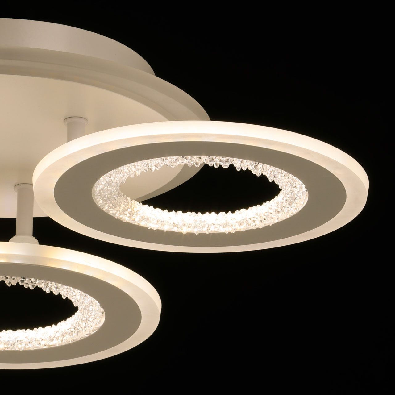 Металлическое основание потолочной люстры окрашено в белый цвет. Корпус плафона выполнен из сплава алюминия с цинком и окрашен в цвет основания. Светодиодные источники света закрыты белым матовым акрилом. Плафоны декорированы прозрачным фактурным акрилом. Дополнительно, в светильнике предусмотрена подсветка потолочной чаши. Светильник приходит в состоянии частичной сборки в компактной упаковке: вся электрика подсоединена, достаточно закрепить плафоны на корпусе.