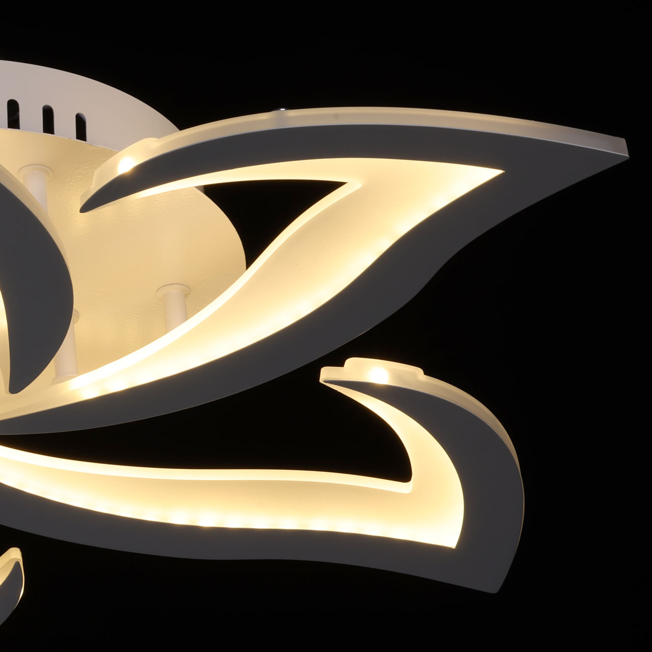 Металлическое основание потолочной люстры окрашено в белый цвет. Корпус плафона выполнен из сплава алюминия с цинком и окрашен в цвет основания. Светодиодный источник света закрыт матовым акрилом.